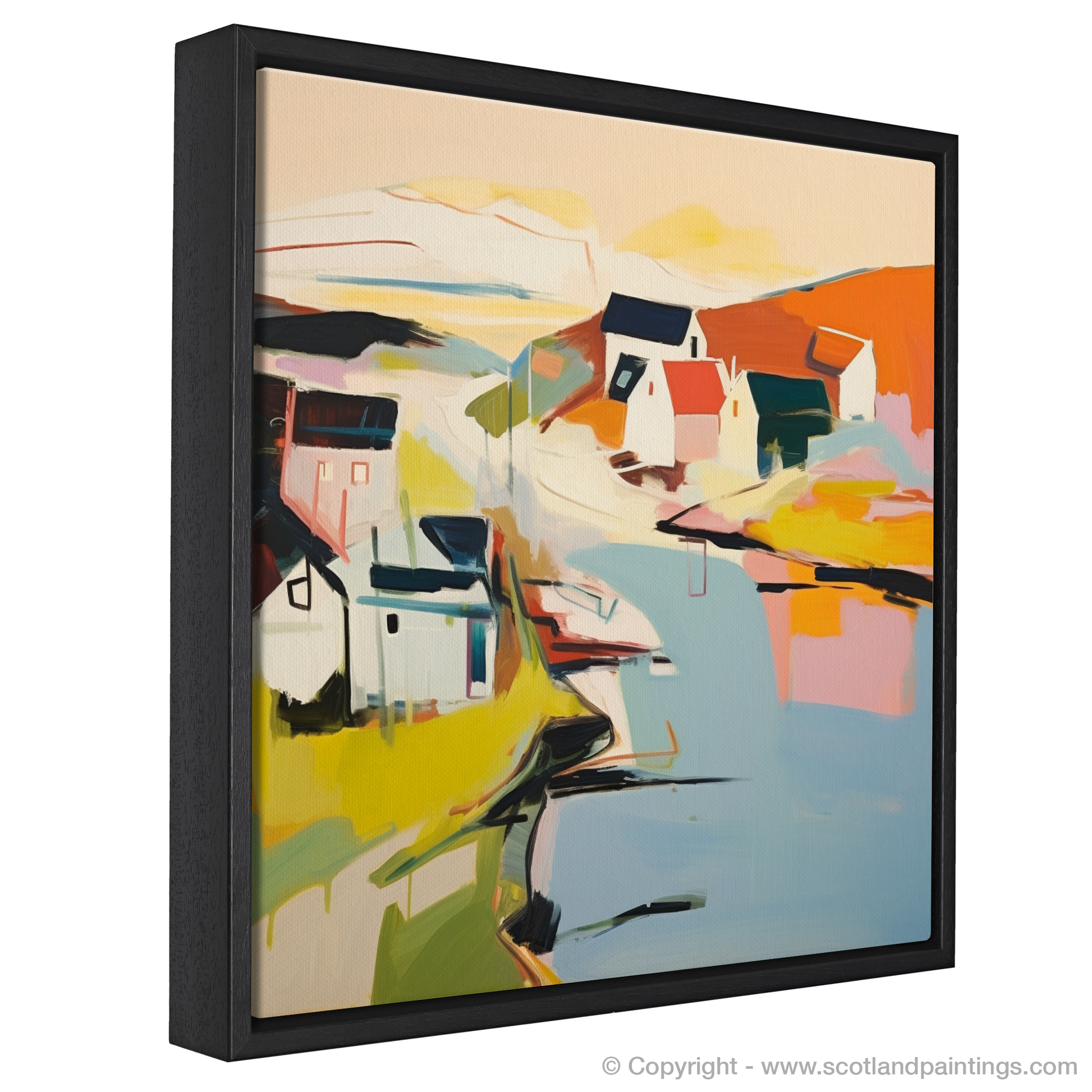 Capturing the ephemeral beauty of light, this abstract print evokes the tranquil ambience of Whitehills Harbour at the enchanting golden hour. Swathes of warm hues mingle with cool undertones, crafting a harmonious interplay reminiscent of the sun’s tender farewell to the day. Bursts of fiery oranges and soothing peaches tint the sky, while the cerulean blues and aquamarines depict the tranquil waters below.