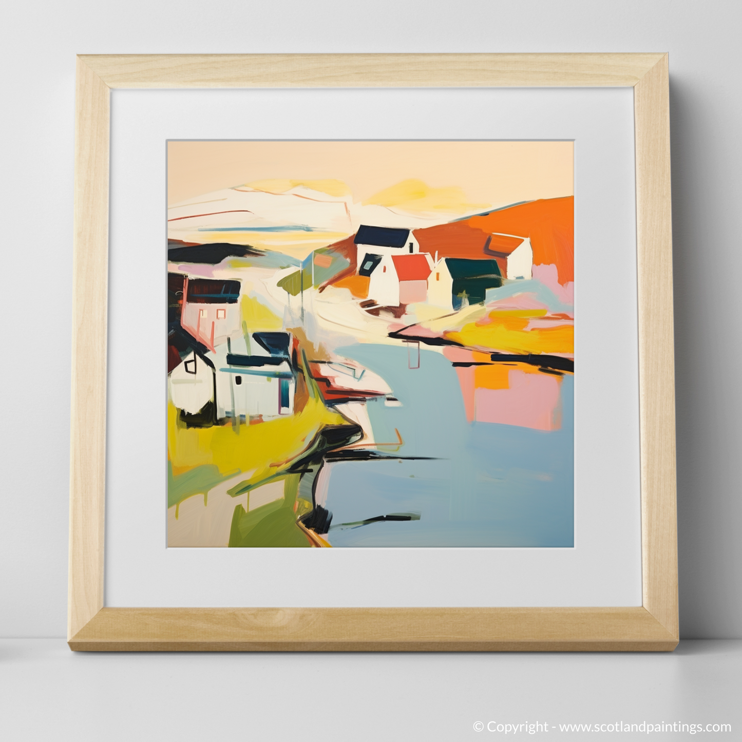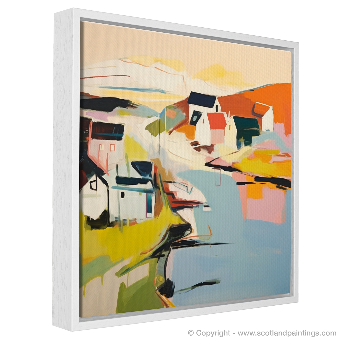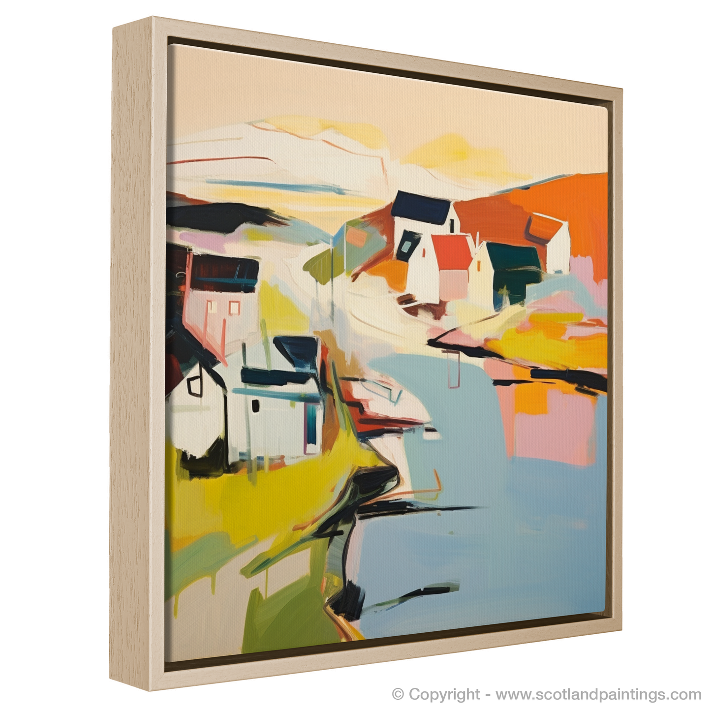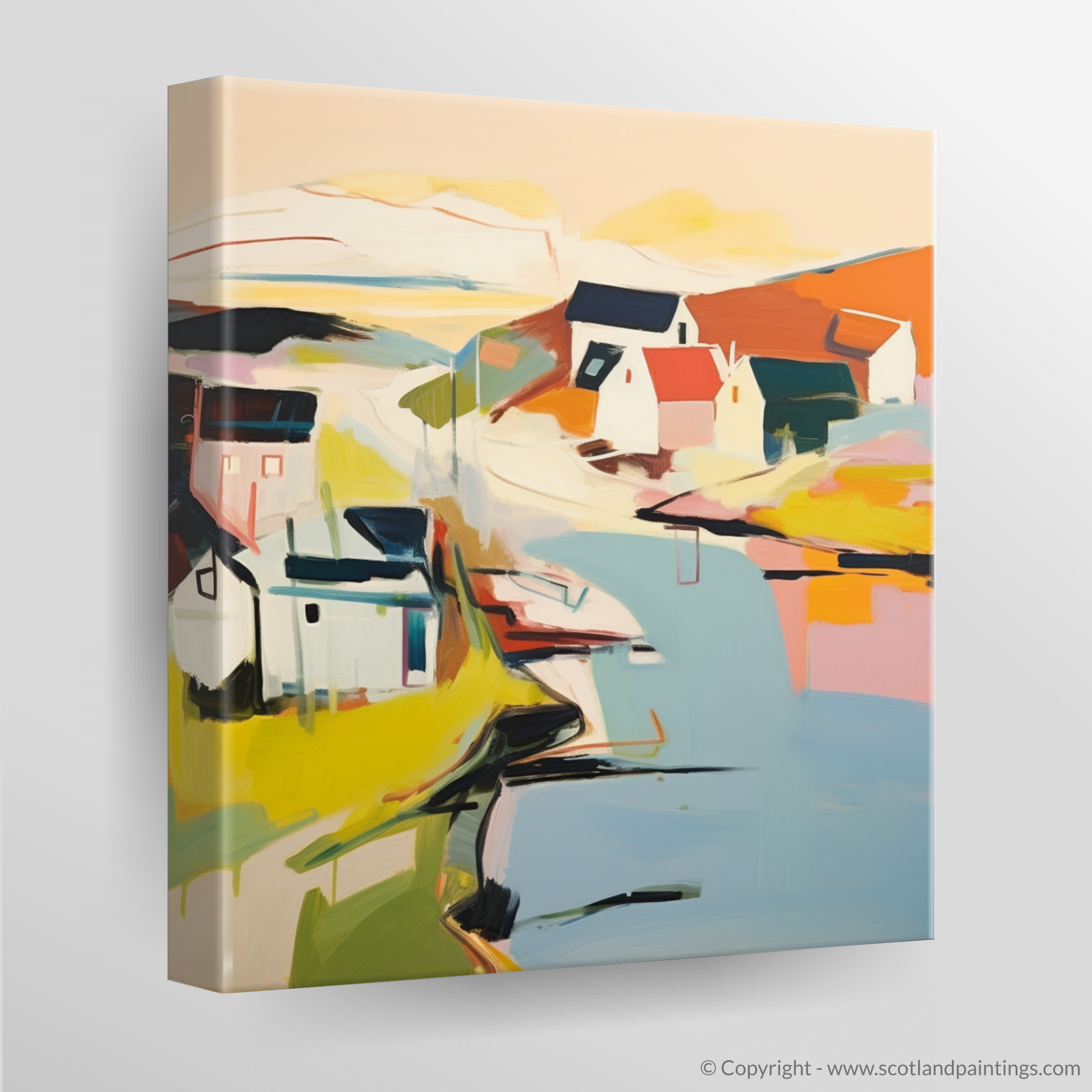 Strokes of creamy whites and gentle greys conjure up the quaint buildings nestled in the harbour, their forms simplified into delightful geometric shapes that dance between the realms of representation and pure abstraction. Sharp lines intersect with the dreamy colour planes, suggesting the outlines of the harbour's silhouettes and structures without binding them to strict realism.