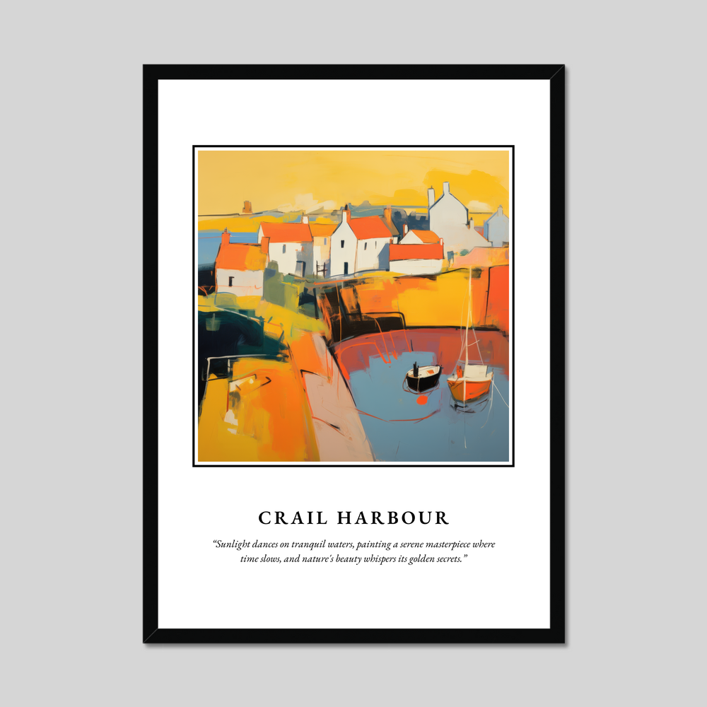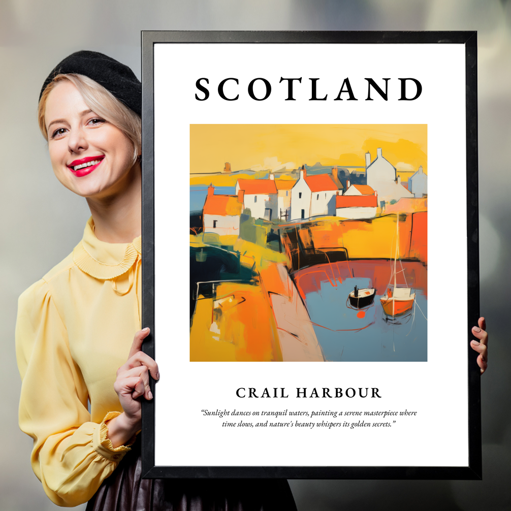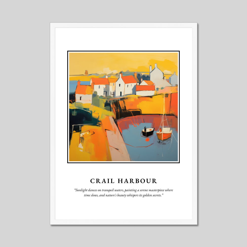 Crail Harbour, nestled in the picturesque region of Fife, Scotland, is a hidden gem that has captivated the hearts of those who visit. Known for its quaint narrow streets and historical significance, the harbour is a haven for artists and photographers alike, drawn by the stunning play of light and the reflection of ancient buildings on the water. The painting in the poster brings this beauty to life, capturing the unique spirit of Crail with an abstract twist, allowing each viewer to interpret its vibrant scenes in their own way.