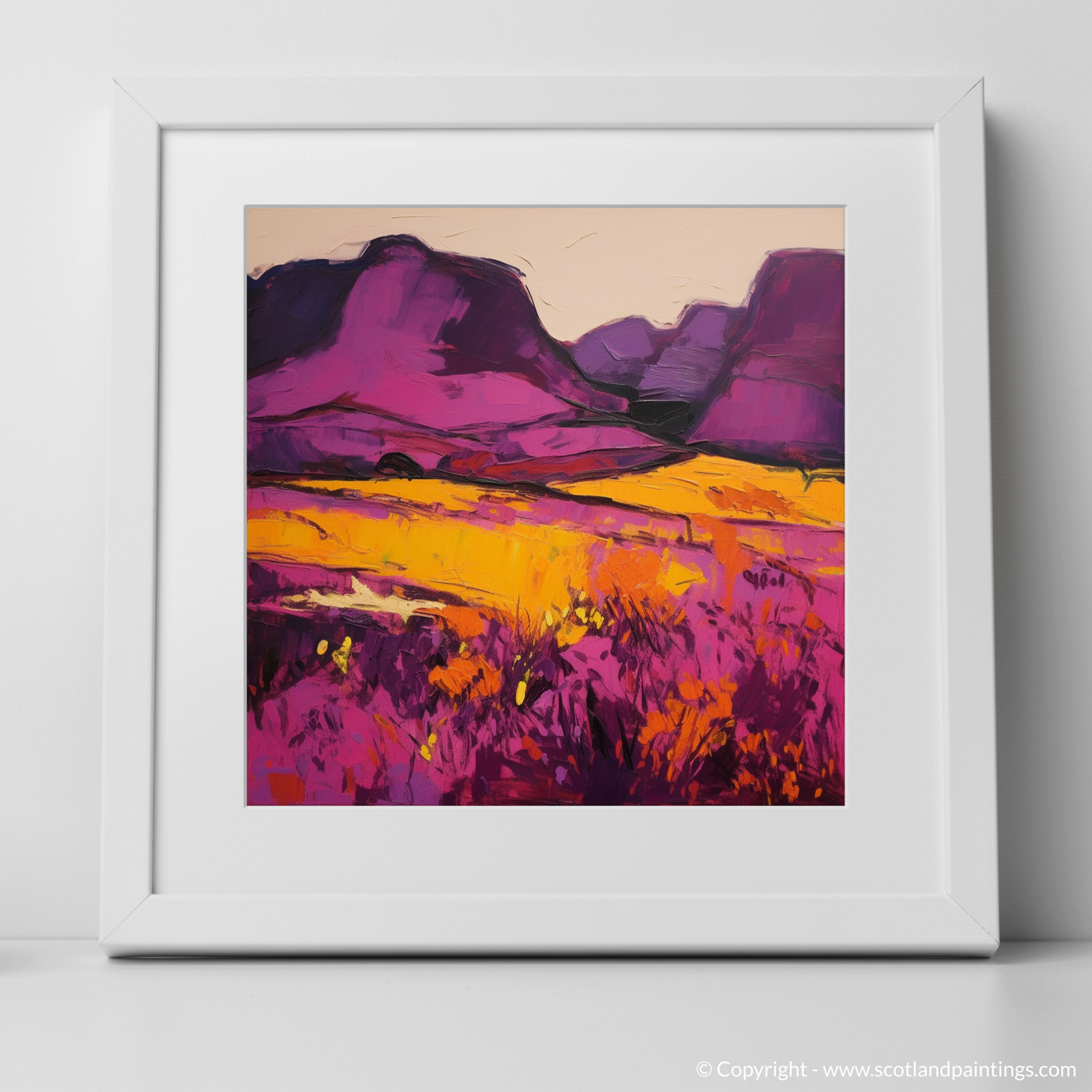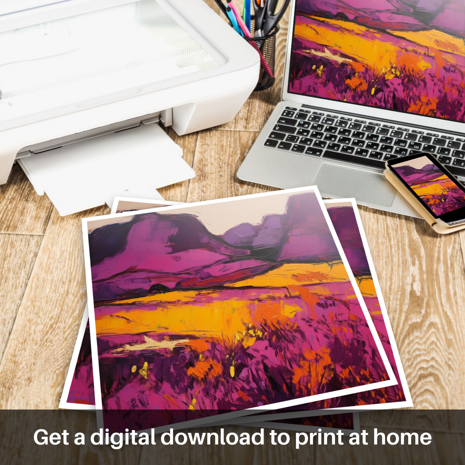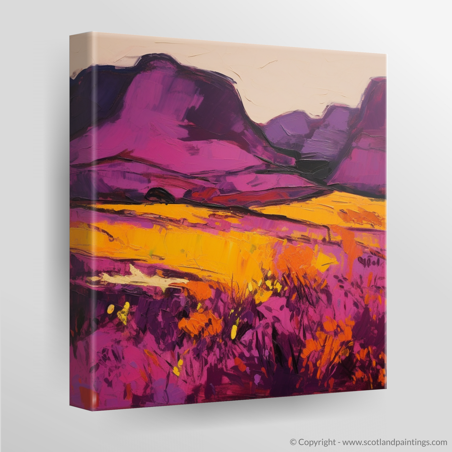 Immerse yourself in the enigmatic beauty of the Highlands with this captivating abstract rendition of Purple heather in Glencoe. The artwork dances with a vivacious palette, where deep purples and warm yellows create a tapestry of colour that captures the essence of wild Scottish moorlands.