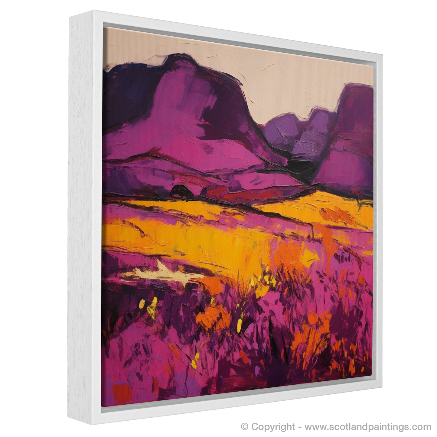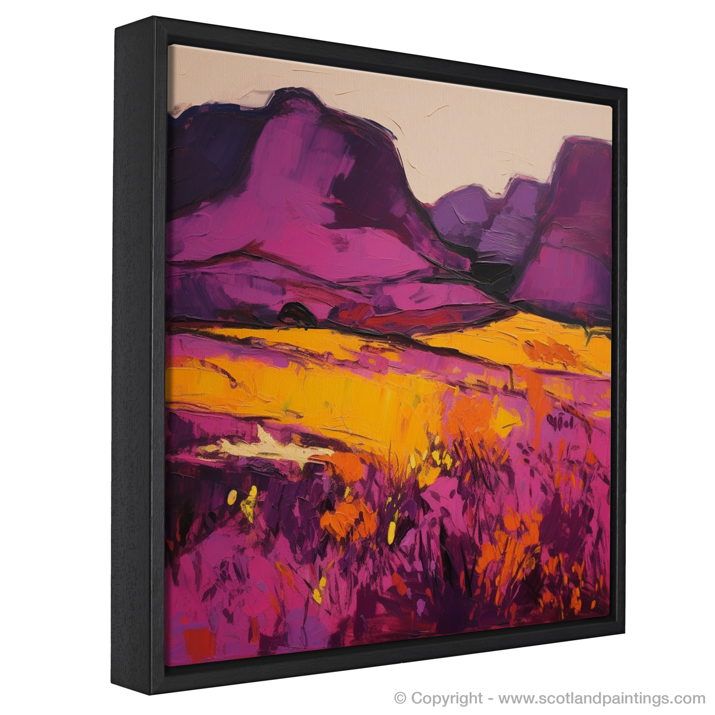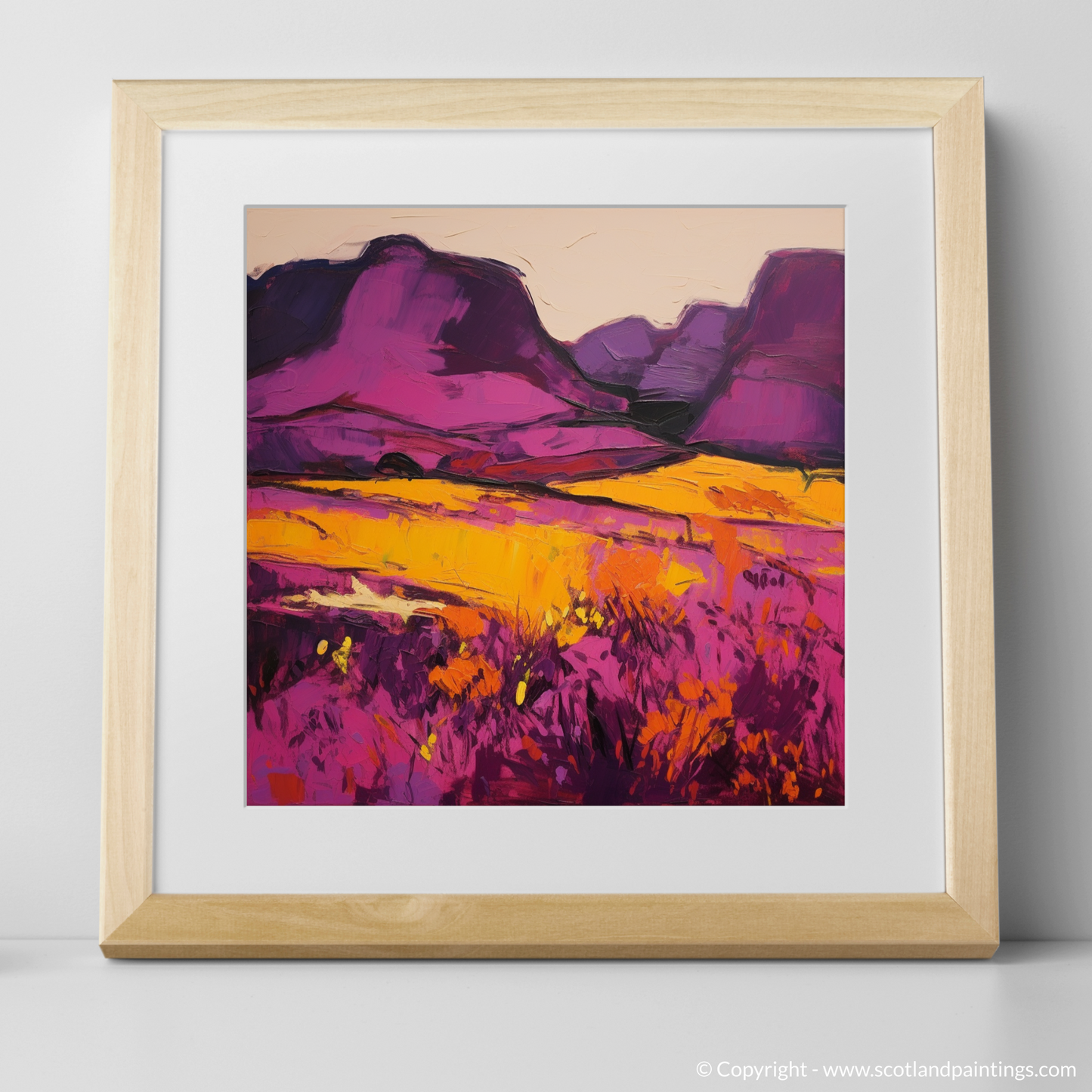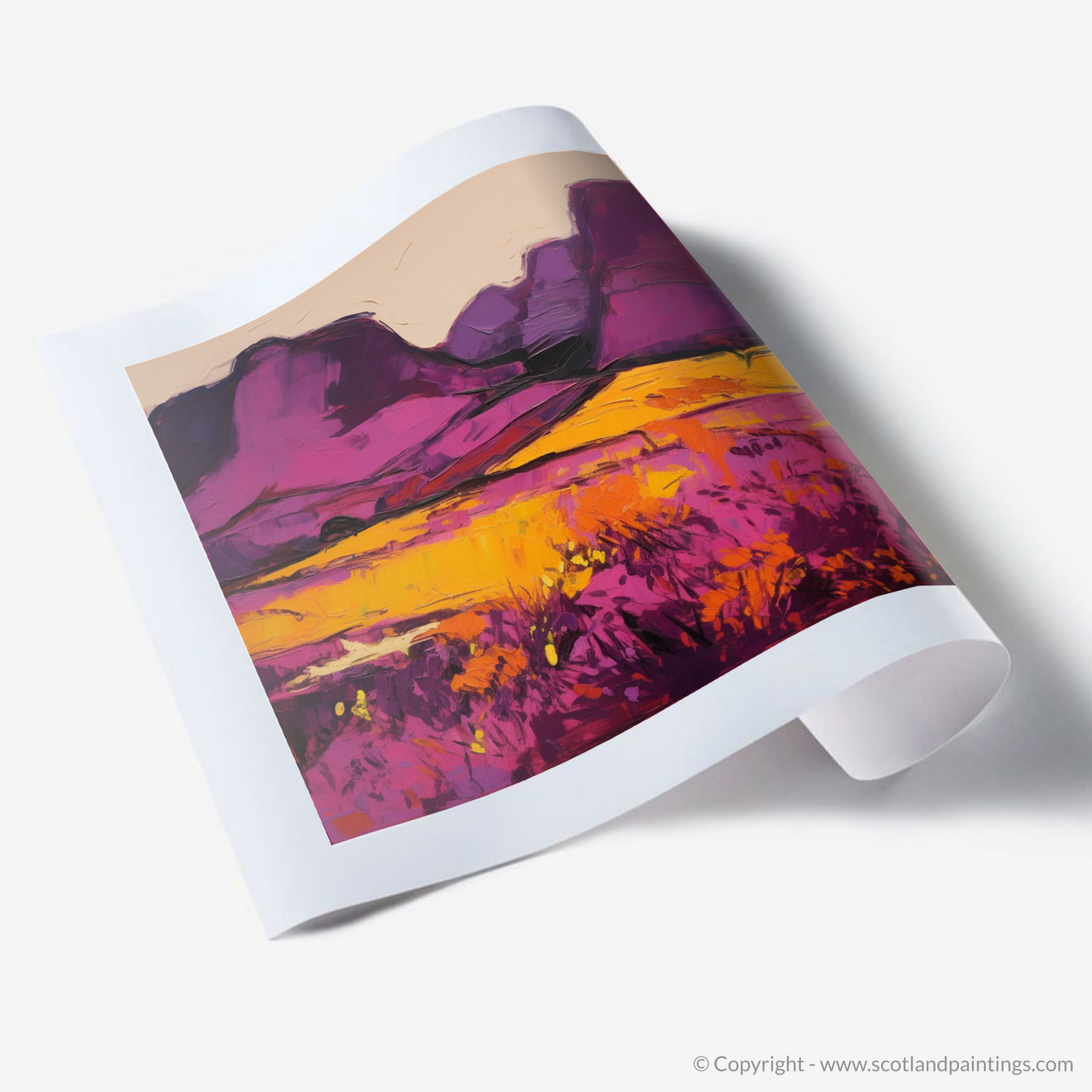 Immerse yourself in the enigmatic beauty of the Highlands with this captivating abstract rendition of Purple heather in Glencoe. The artwork dances with a vivacious palette, where deep purples and warm yellows create a tapestry of colour that captures the essence of wild Scottish moorlands.