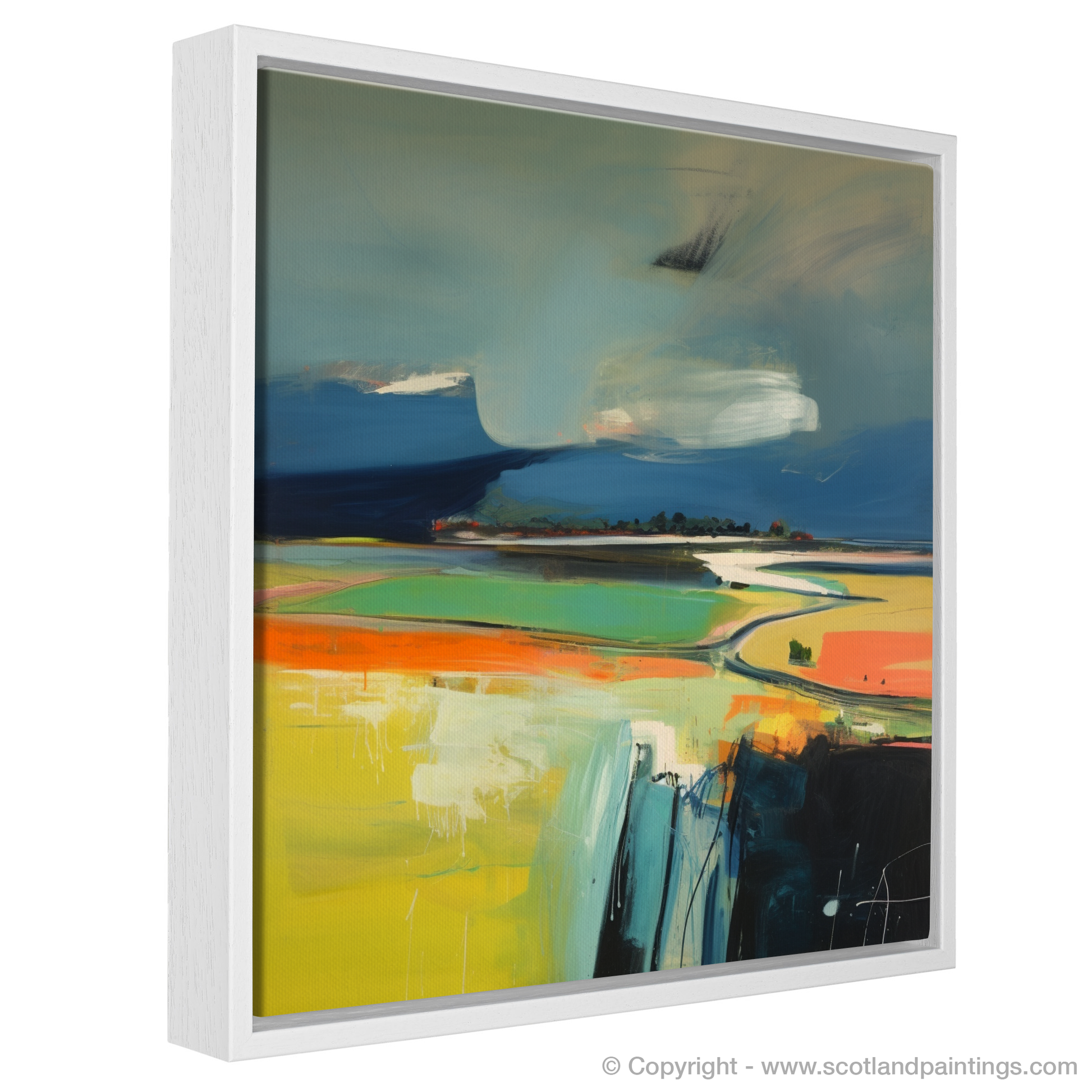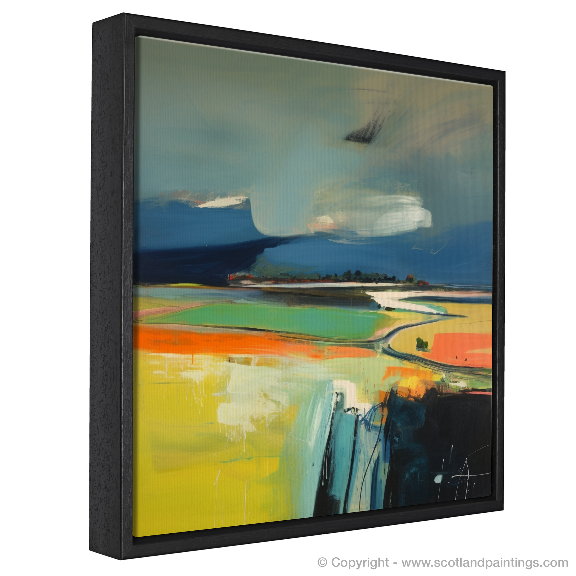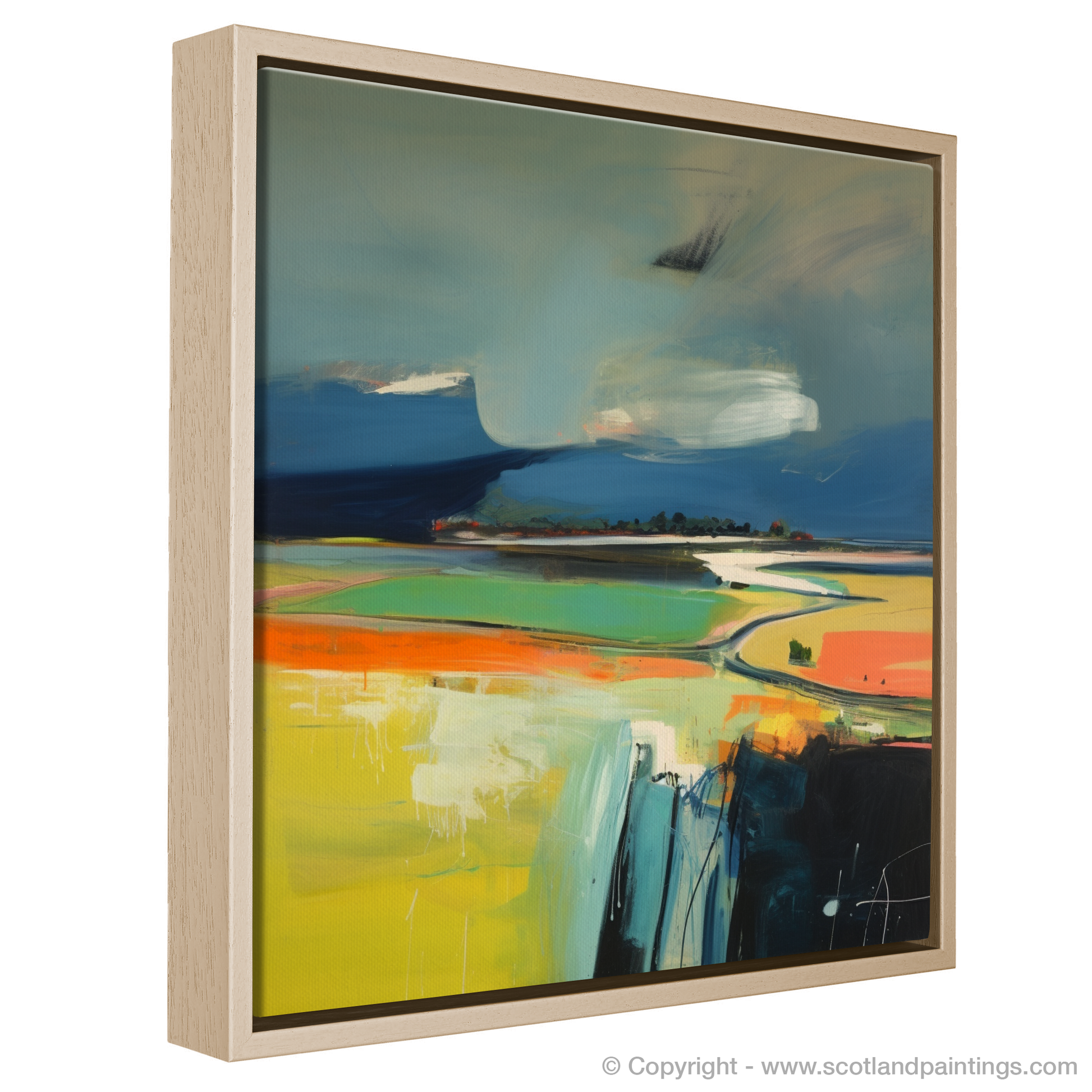 Let the tumultuous energy of the elements envelop your senses with this evocative abstract creation, capturing the unpredictable essence of West Sands under a stormy sky. The vibrant spectacle features a tempestuous palette where dark, brooding navy and slate hues swirl amidst ephemeral patches of soft white, suggesting the fleeting caress of cloud formations swiftly traversing the upper canvas. Below, a striking contrast arrests the viewer as bold streaks of fiery orange, verdant green, and sun-kissed yellows carve through the scene, reminiscent of the raw, untamed beauty of the landscape's earthen textures.