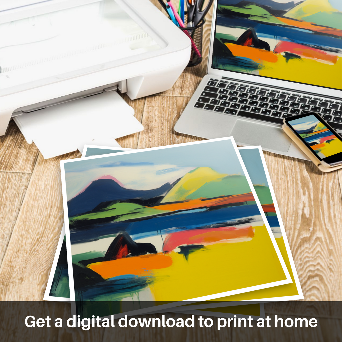 Immerse yourself in the wild beauty of Scotland with our enchanting abstract print, capturing the essence of a mystical loch surrounded by rolling hills. The bold brushstrokes dance across the canvas in a symphony of vibrant hues, bringing to life the dynamic sky and mirrored waters. Deep blues and calming greens mingle effortlessly with splashes of fiery oranges and energetic yellows, evoking the unpredictable nature of the Scottish weather and the untamed landscape.