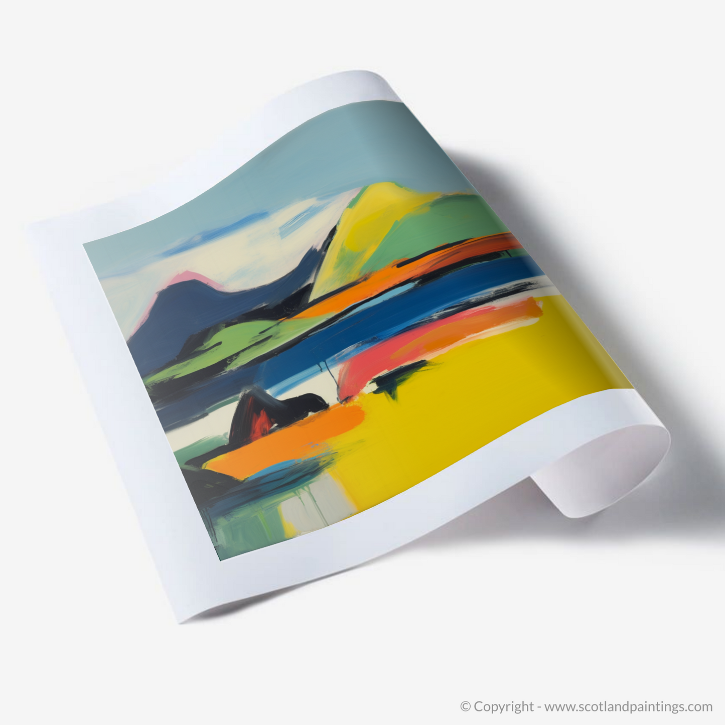 As the eye moves across the canvas, one is taken on a journey through the enigmatic Scottish terrain, where mountains watch over tranquil waters like ancient guardians. This print is an evocative interpretation of the majesty that is found within Scotland's natural world, offering a modern, abstracted perspective that would make a stunning focal point in any room.