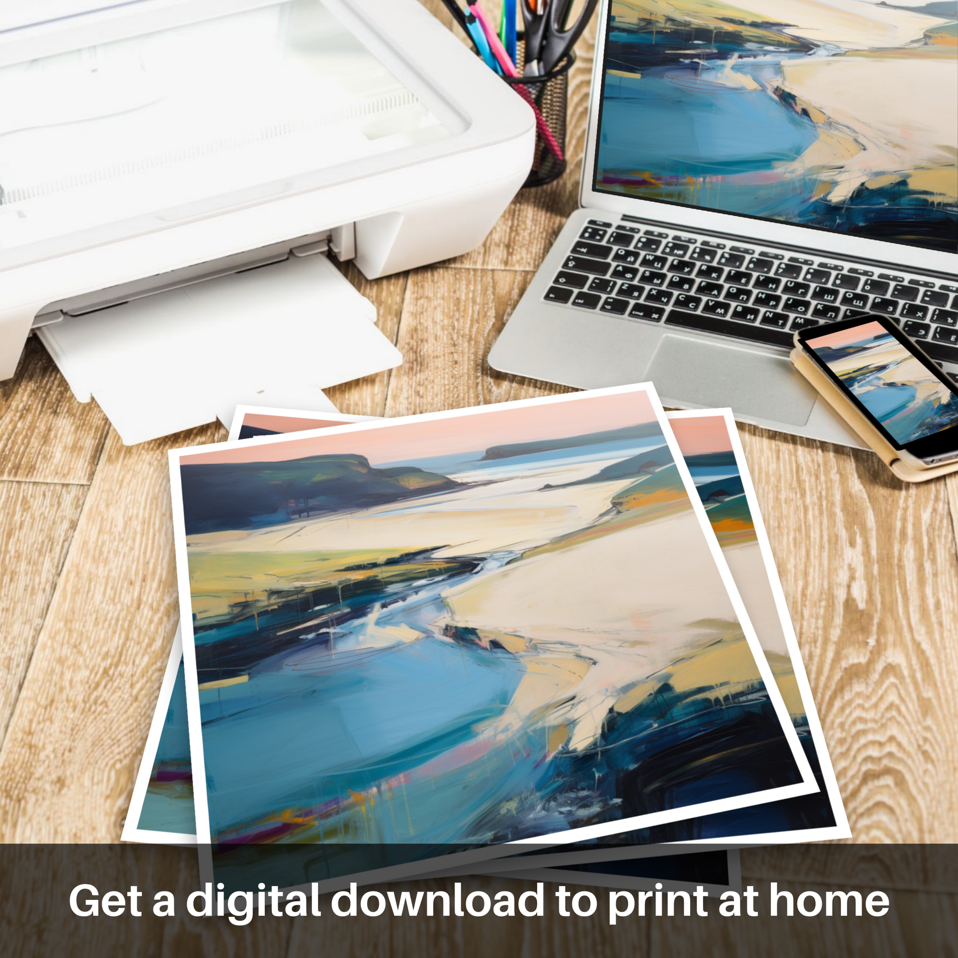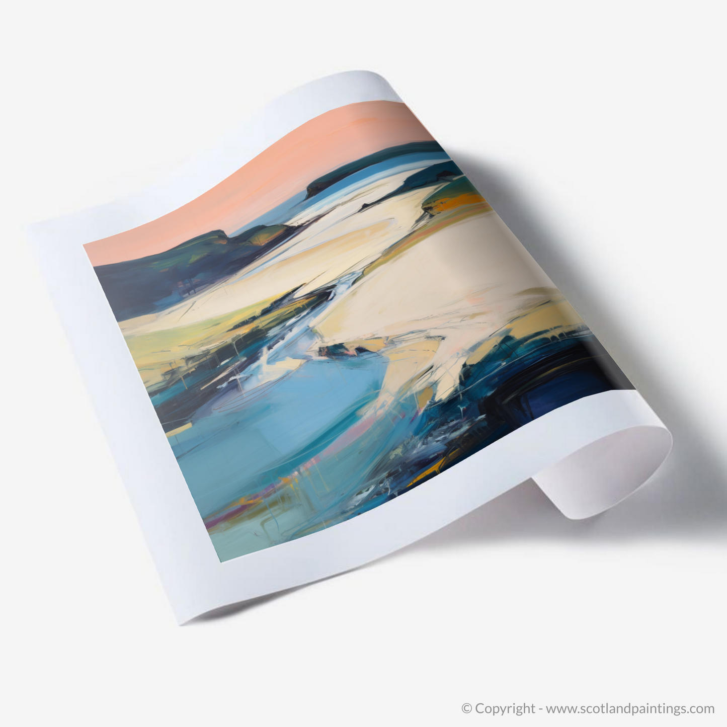 Fluid and dynamic, this abstract impressionist piece invites the viewer to a sensory experience, where the whispers of the sea breeze and the soft rustle of marram grass seem almost tangible. Light and shadow play in a symphony of shape and form, suggesting the beauty of Sandwood Bay's maritime haven in a way that resonates with the soul.