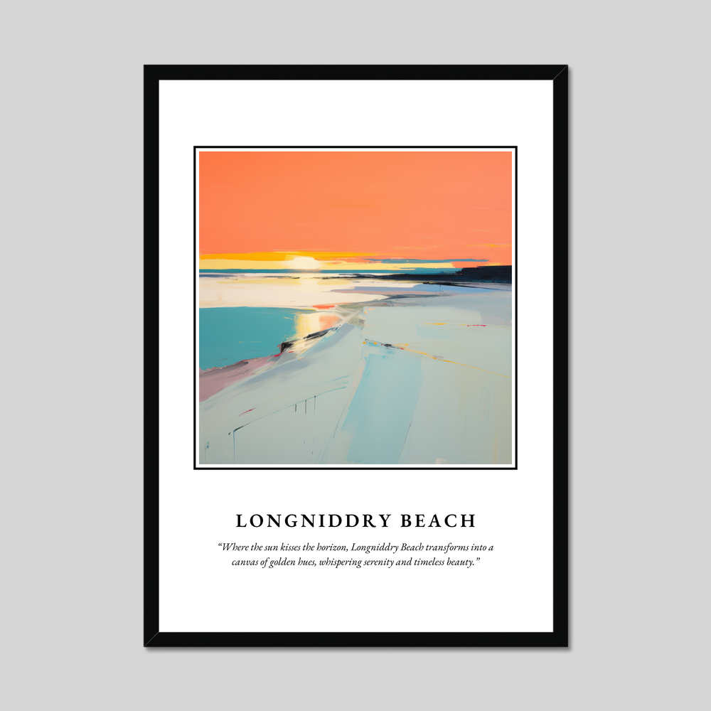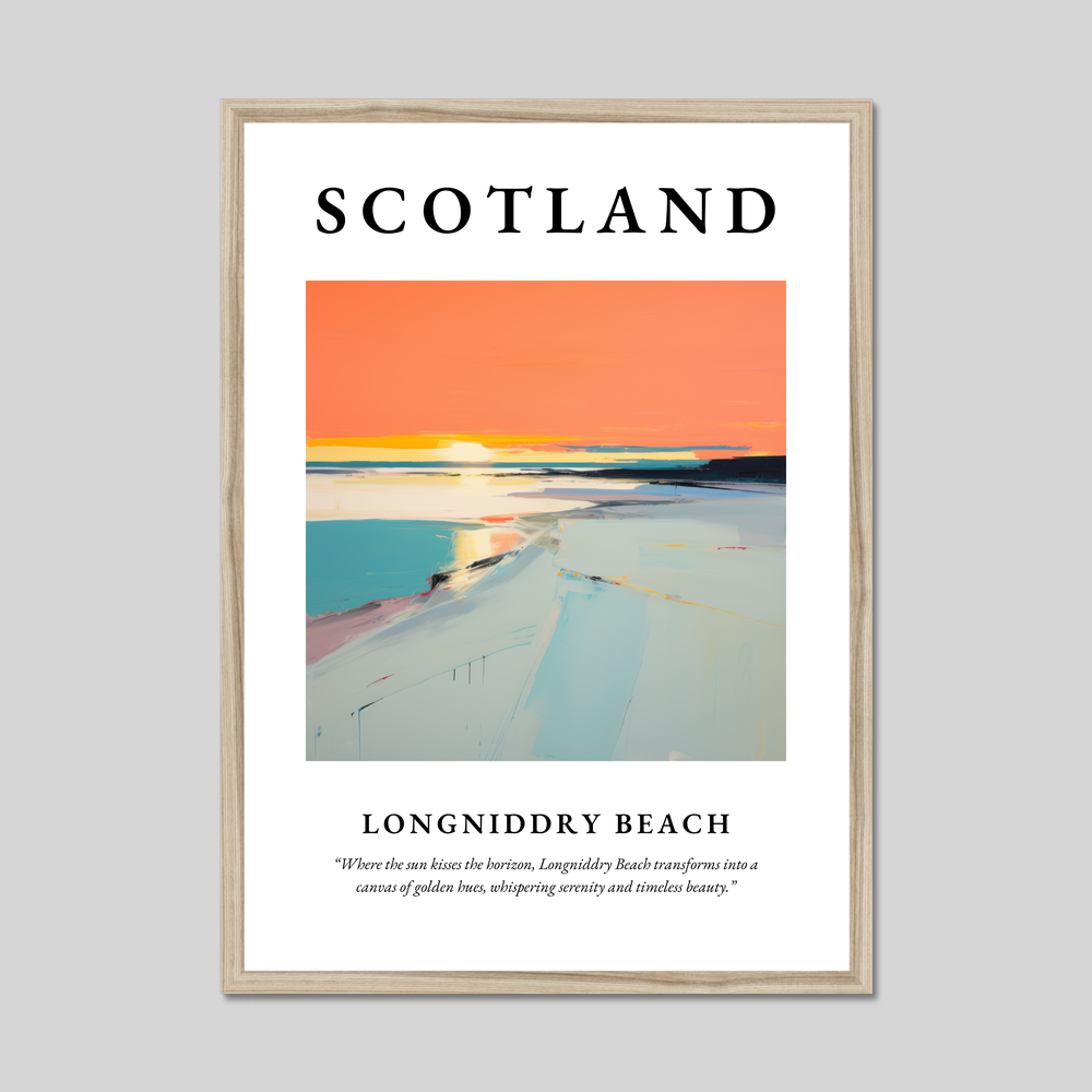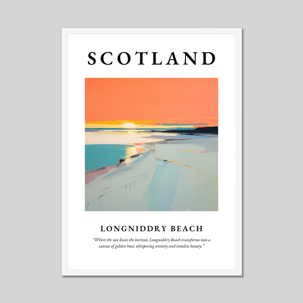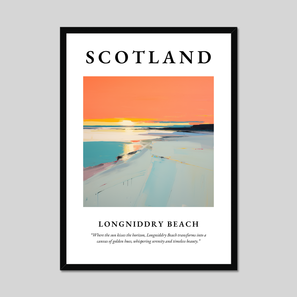Available in your choice of black, white, or natural wood-effect frames, this stunning artwork vividly captures the essence of Longniddry Beach in a contemporary style. At the top of the poster, the word "SCOTLAND" stands boldly, inviting you to explore the unique charm of this cherished location. Below, a mesmerising painting showcases Longniddry Beach as the sun dips below the horizon, enveloping the scene in a warm palette of golden and serene hues. Underneath, an evocative quote reads, “Where the sun kisses the horizon, Longniddry Beach transforms into a canvas of golden hues, whispering serenity and timeless beauty.”