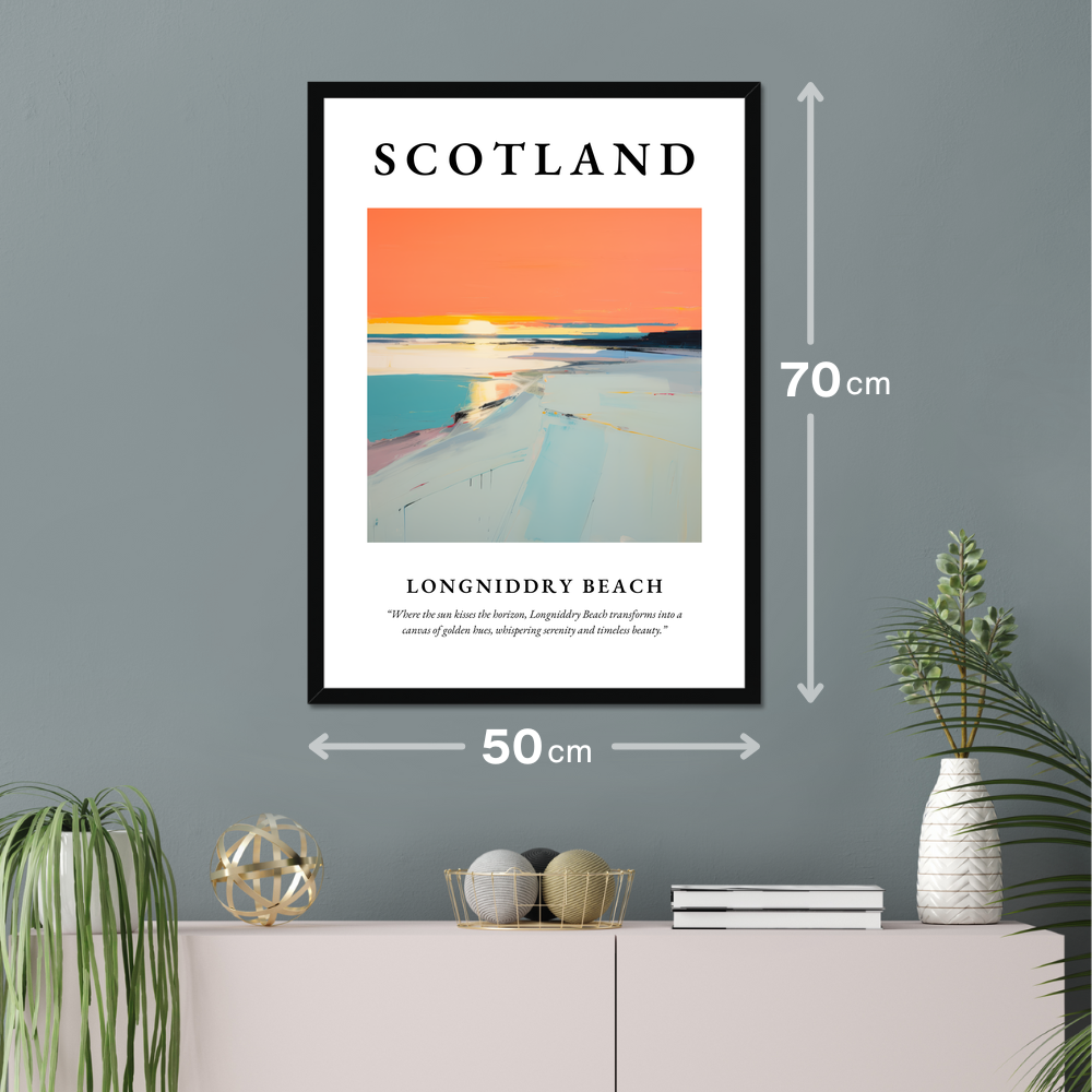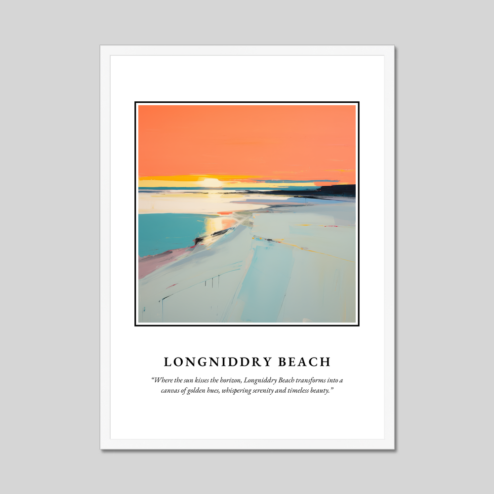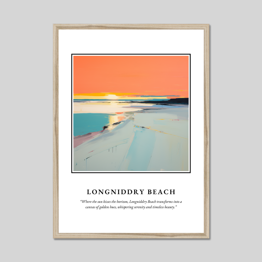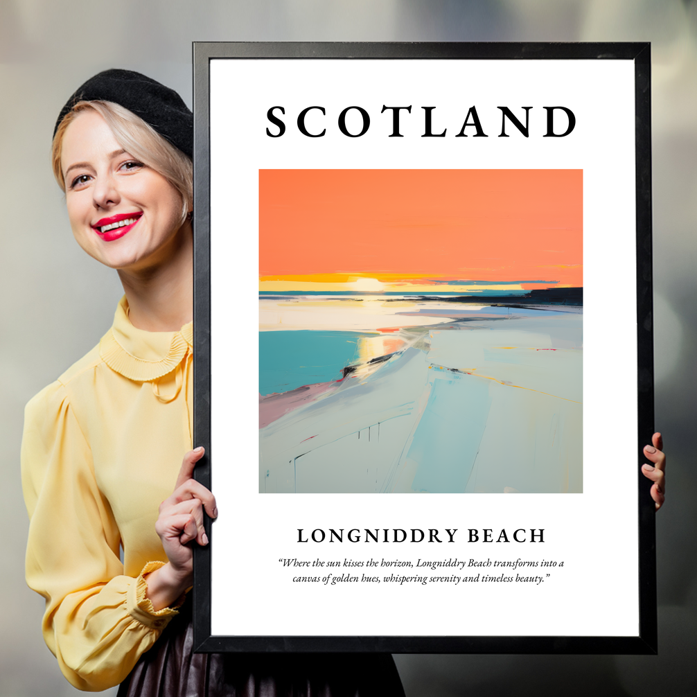 Available in your choice of black, white, or natural wood-effect frames, this stunning artwork vividly captures the essence of Longniddry Beach in a contemporary style. At the top of the poster, the word "SCOTLAND" stands boldly, inviting you to explore the unique charm of this cherished location. Below, a mesmerising painting showcases Longniddry Beach as the sun dips below the horizon, enveloping the scene in a warm palette of golden and serene hues. Underneath, an evocative quote reads, “Where the sun kisses the horizon, Longniddry Beach transforms into a canvas of golden hues, whispering serenity and timeless beauty.”