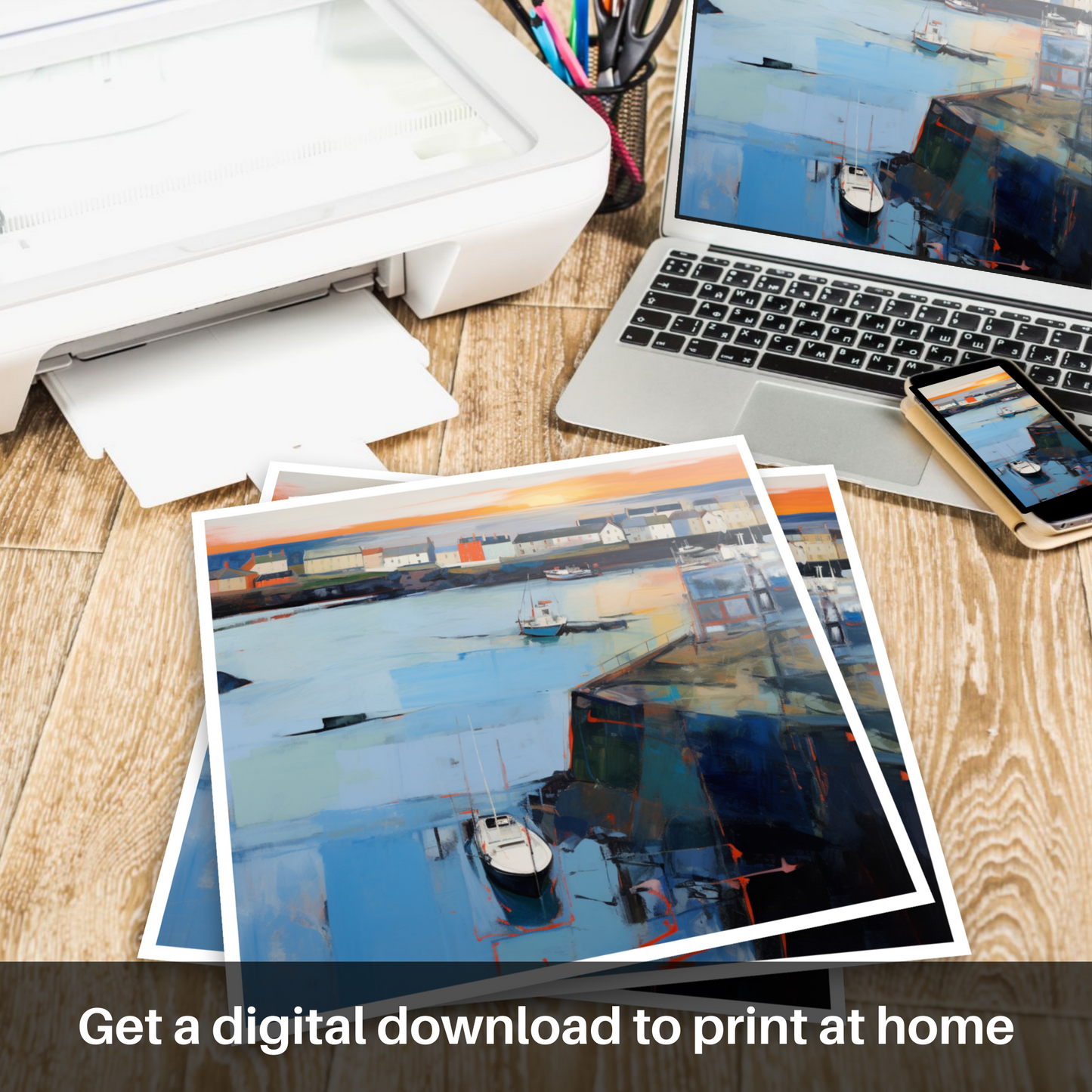 In this print, the essence of Abstract Impressionism breathes life into the harbour's elements through a mesmerising fusion of colour and form. Hints of cerulean and shades of midnight blue blend fluidly, reflecting the serene waters, while the harbour's architecture is abstractly defined by bold strokes and a medley of slate grey, creamy white, and faded brick red.