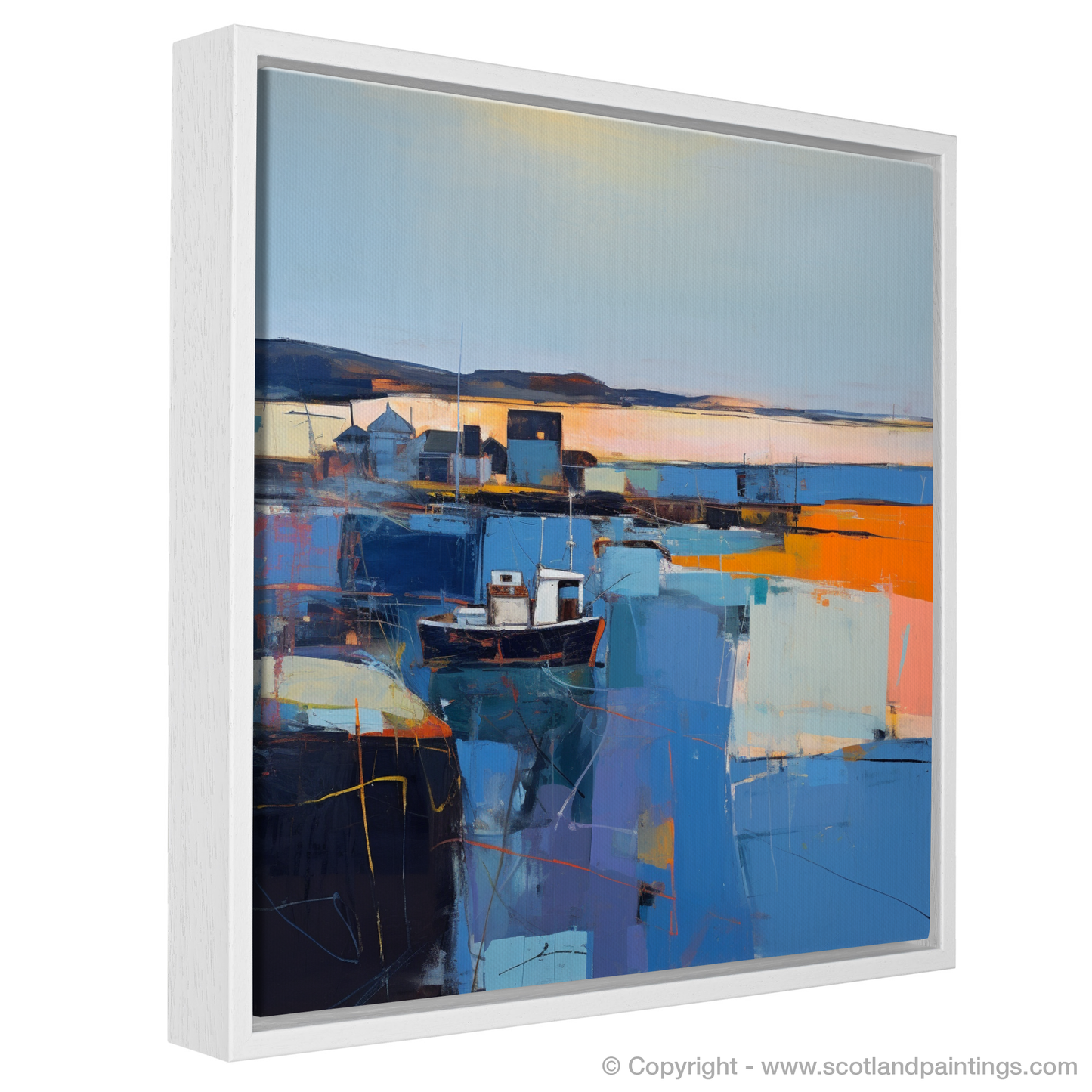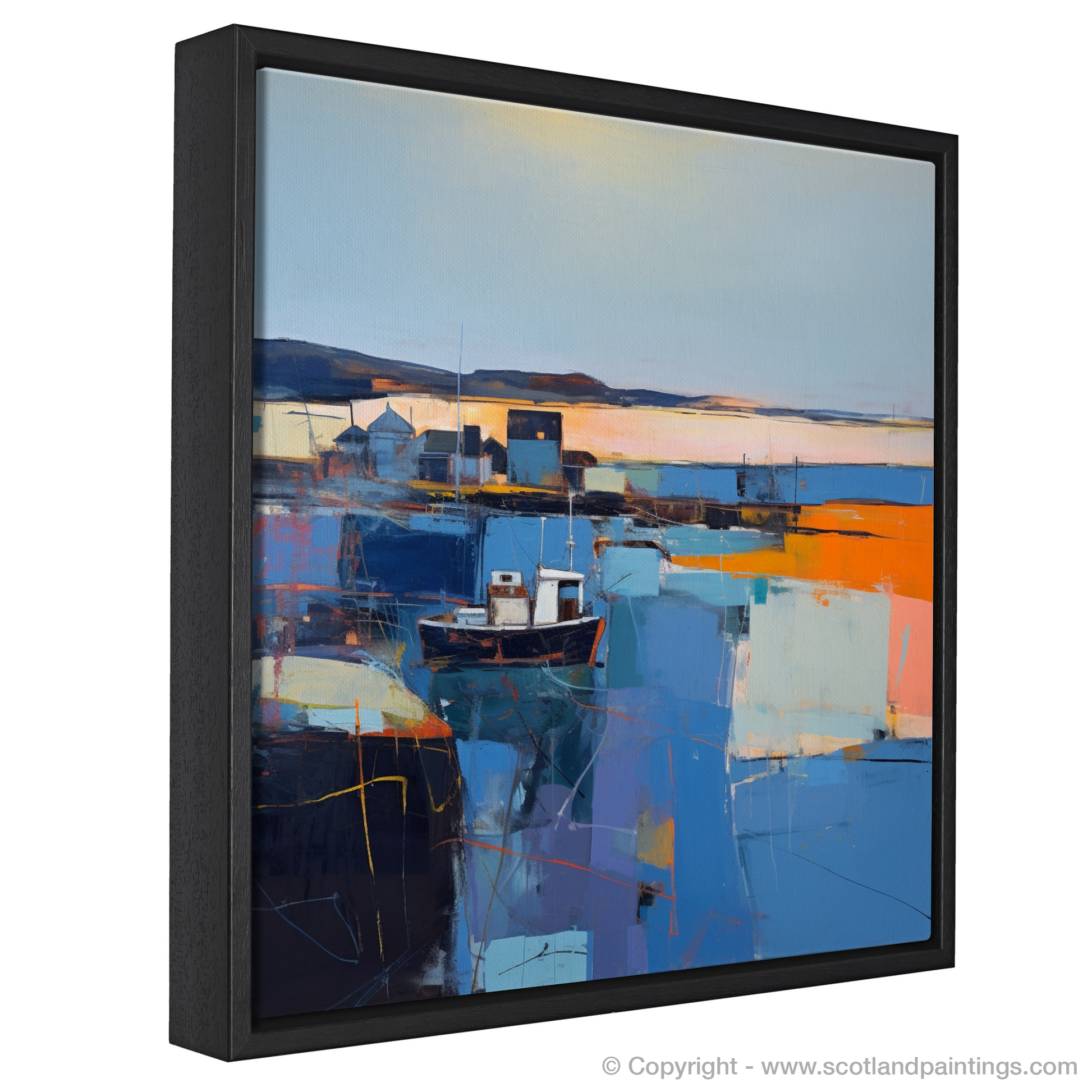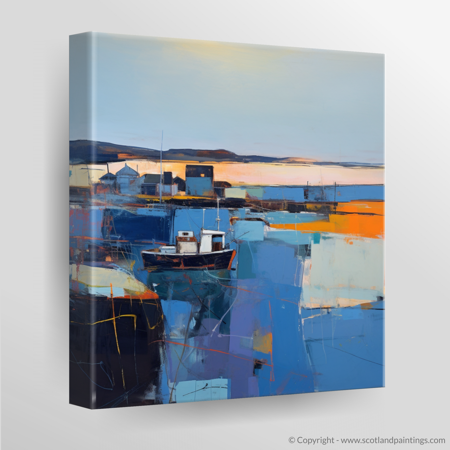 Immerse yourself in the serene beauty of the Scottish coastline with this captivating print, evoking the essence of North Berwick Harbour at the quiet end of the day. The piece harnesses the visual language of Abstract Impressionism, blending vibrant swatches of colour with softly defined shapes that hint at the harbour's tranquillity. Bold blues and soothing oranges fuse on the canvas, reflecting the dance of dusk's light upon the water's surface.