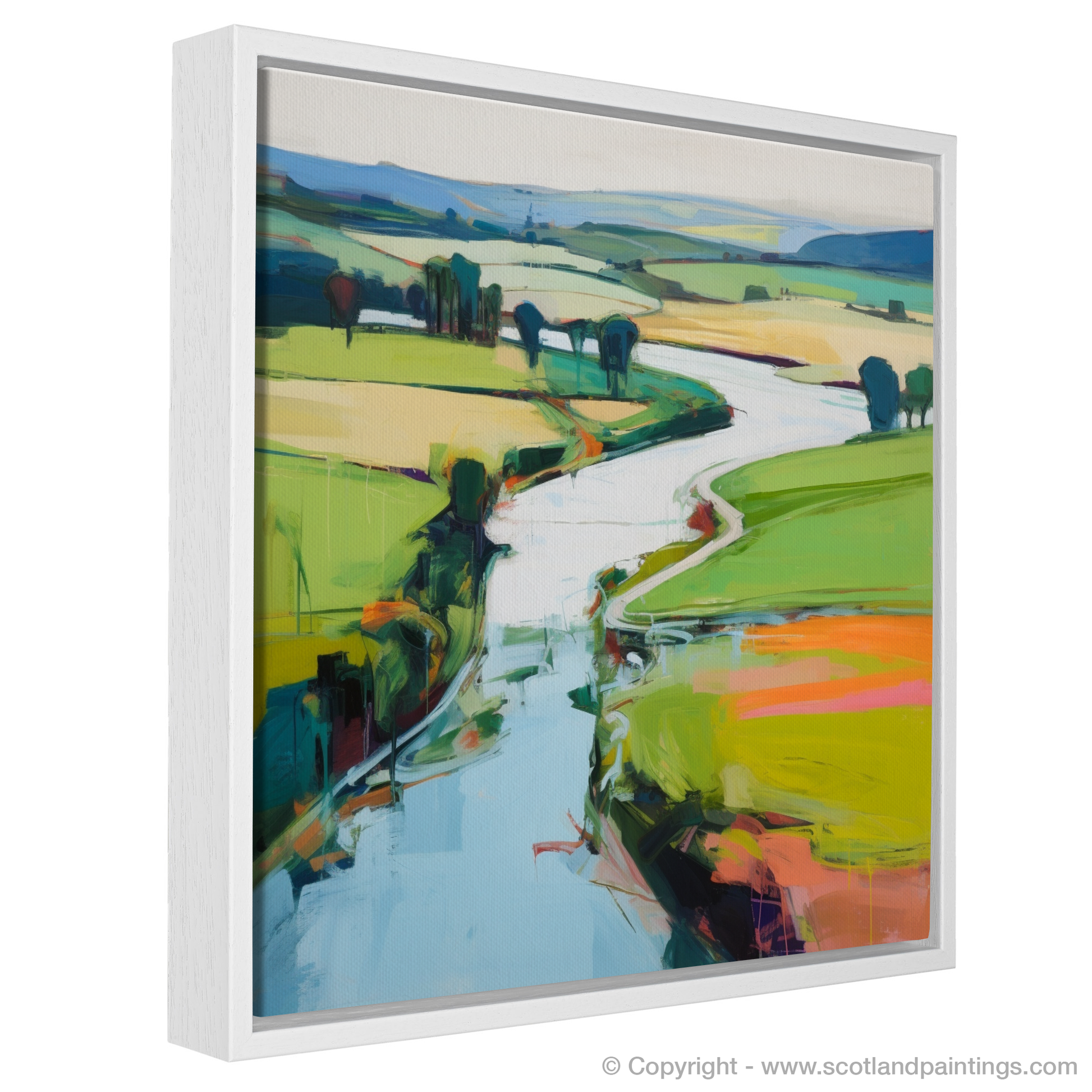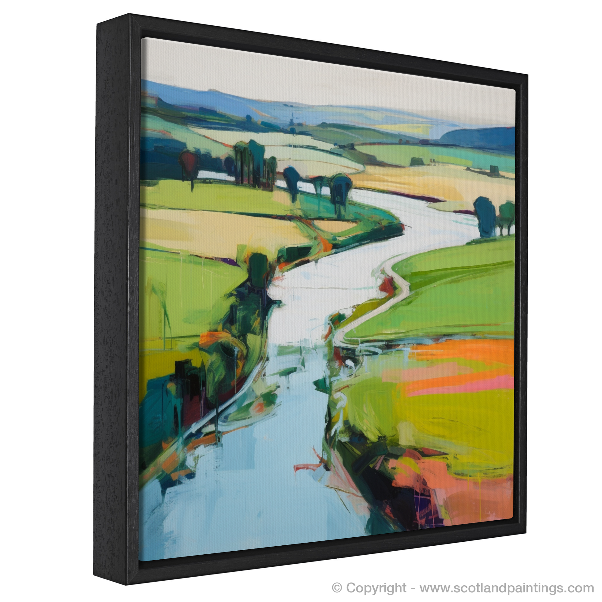Immerse yourself in the vivid splendour of Scotland's summertime with this evocative print, a vibrant homage to the serene beauty that is the River Nith as it meanders through Dumfries and Galloway. With a spirited palette of azure, emerald, and a burst of sunset hues, this piece captures the dynamic interplay of light and colour that characterises the unique appeal of Scottish landscapes during the warmest months.