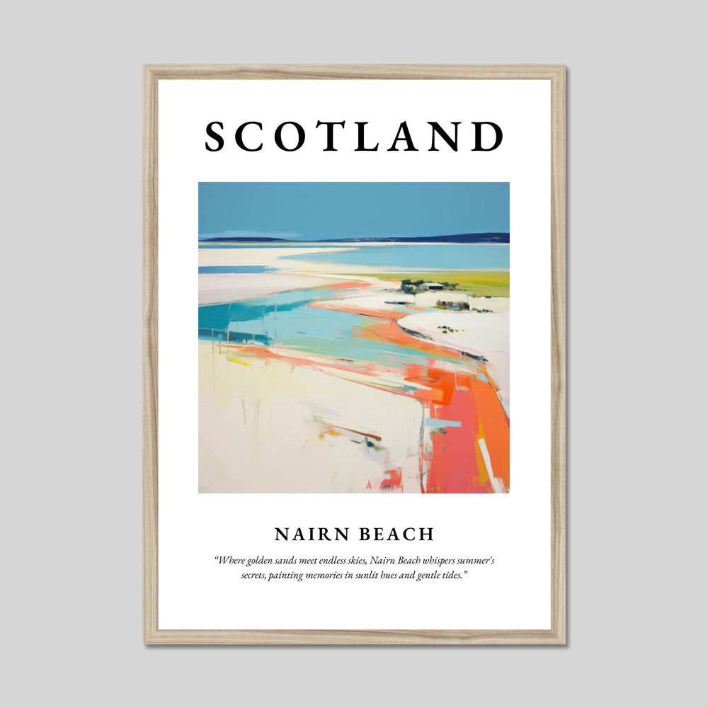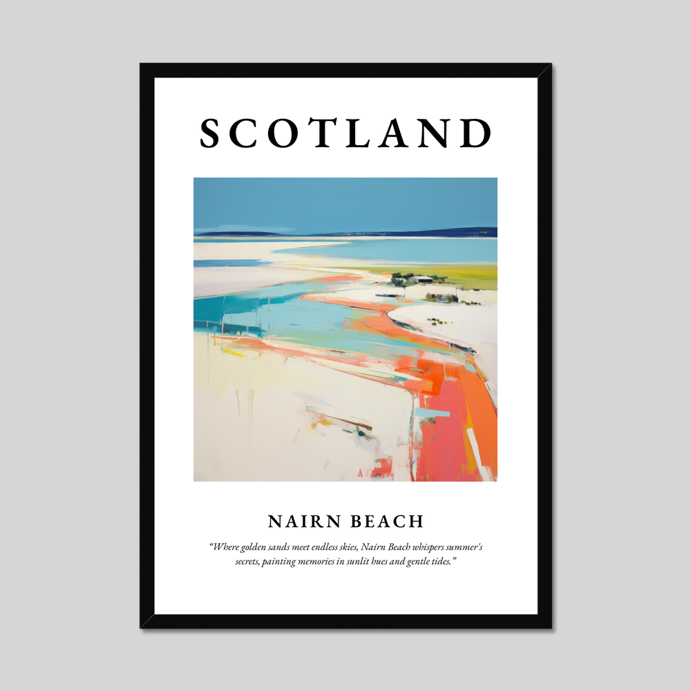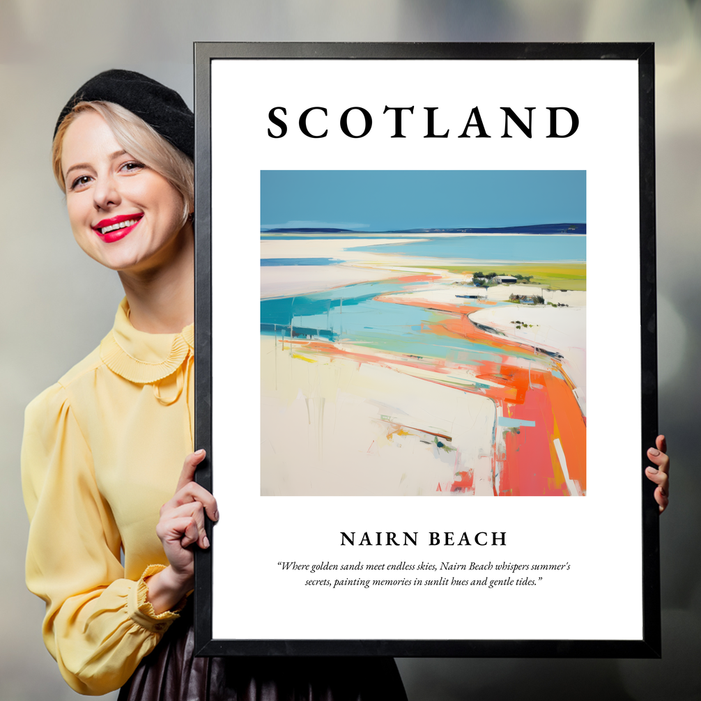 The bold header "SCOTLAND" sets the tone for this homage to one of the country's most beloved coastal gems. Beneath, an abstract impressionistic depiction of Nairn Beach captures the imagination, blending vibrant hues with dynamic brushwork. The scene evokes the feeling of warm sand underfoot, the endless blue sky overhead, and the kaleidoscope of colours painting the horizon.