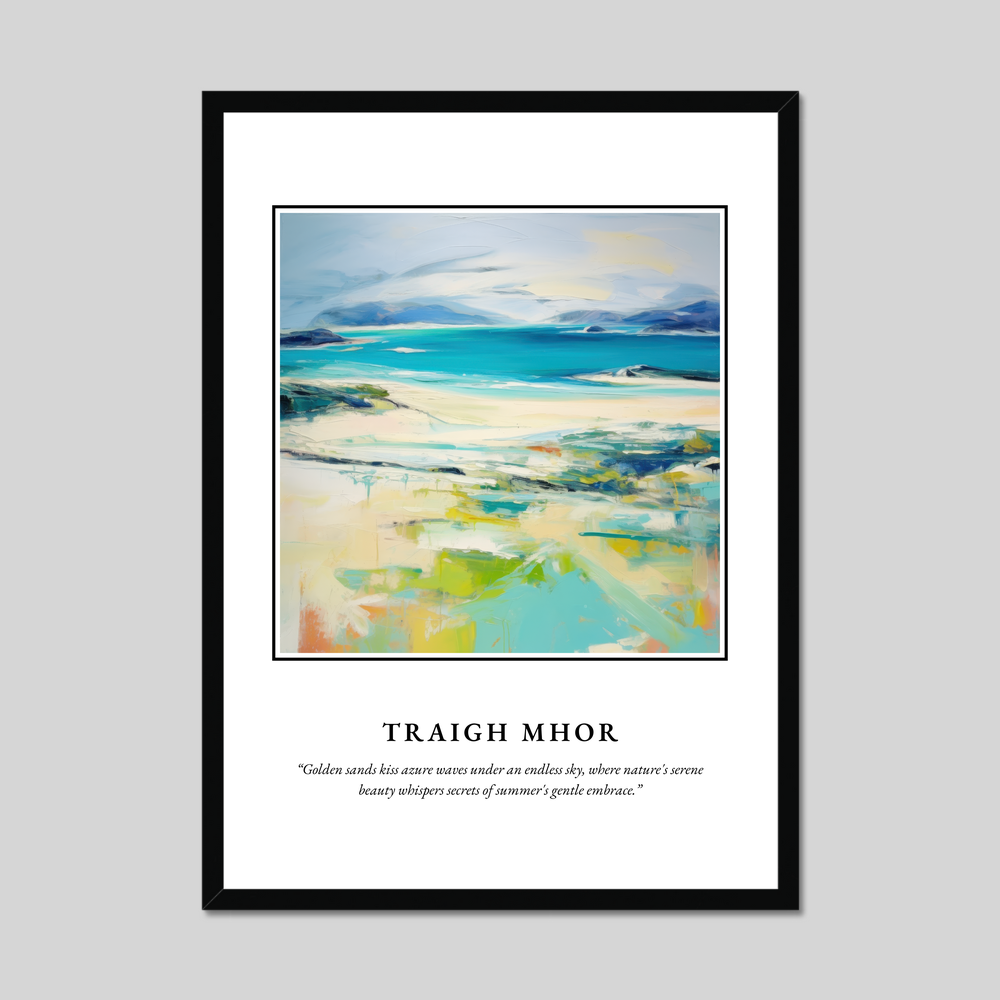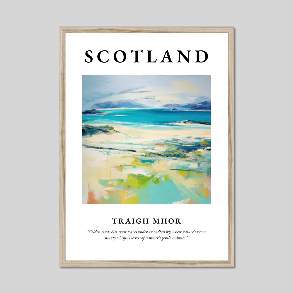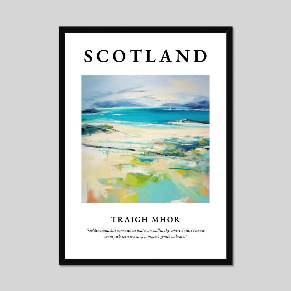 Embrace the enchanting allure of Scotland with this stunning framed poster print, available in three elegant finishes: black, white, or natural wood-effect. Measuring a generous 50cm x 70cm, this large-format artwork captures the essence of Traigh Mhor beach, brought to life through the dynamic and vibrant strokes of Abstract Expressionism. The poster presents “SCOTLAND” in bold lettering atop a mesmerising depiction of golden sands blending seamlessly with azure waves. Below the evocative scene, the quote captures the serenity and mystery of this scenic paradise: “Golden sands kiss azure waves under an endless sky, where nature's serene beauty whispers secrets of summer's gentle embrace.”