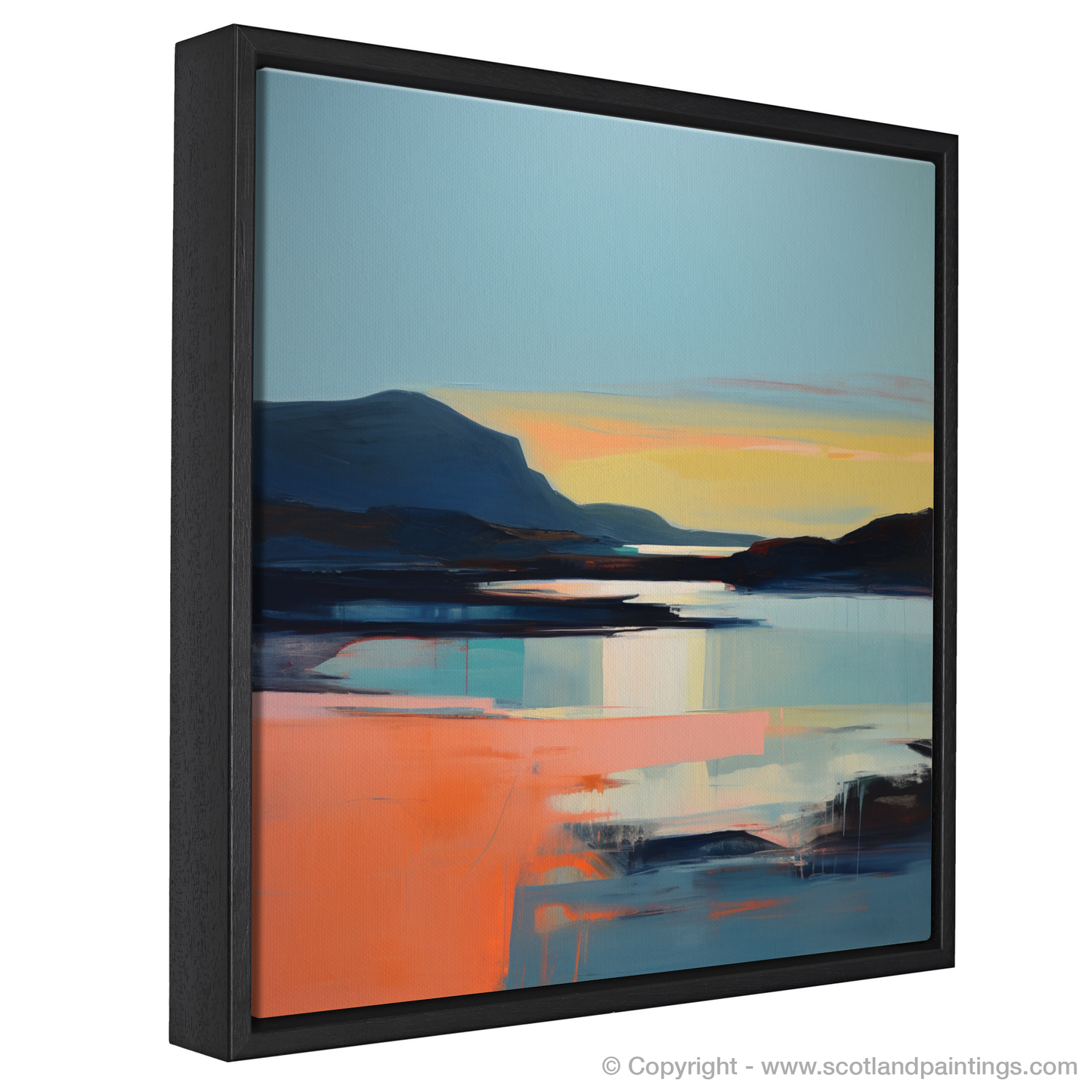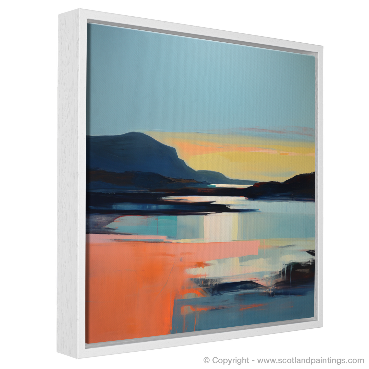 Immerse yourself in the tranquil essence of Balnakeil Bay as the day draws to a close, exquisitely captured in this contemporary print. With broad strokes and a vibrant palette, the artwork brings to life the serene beauty of a Scottish cove at dusk. The hues of the setting sun reflect off the calm waters, creating a symphony of warm oranges, soft yellows, and delicate peaches that blend into cool blues and soothing greys, mirroring the tranquil sea.