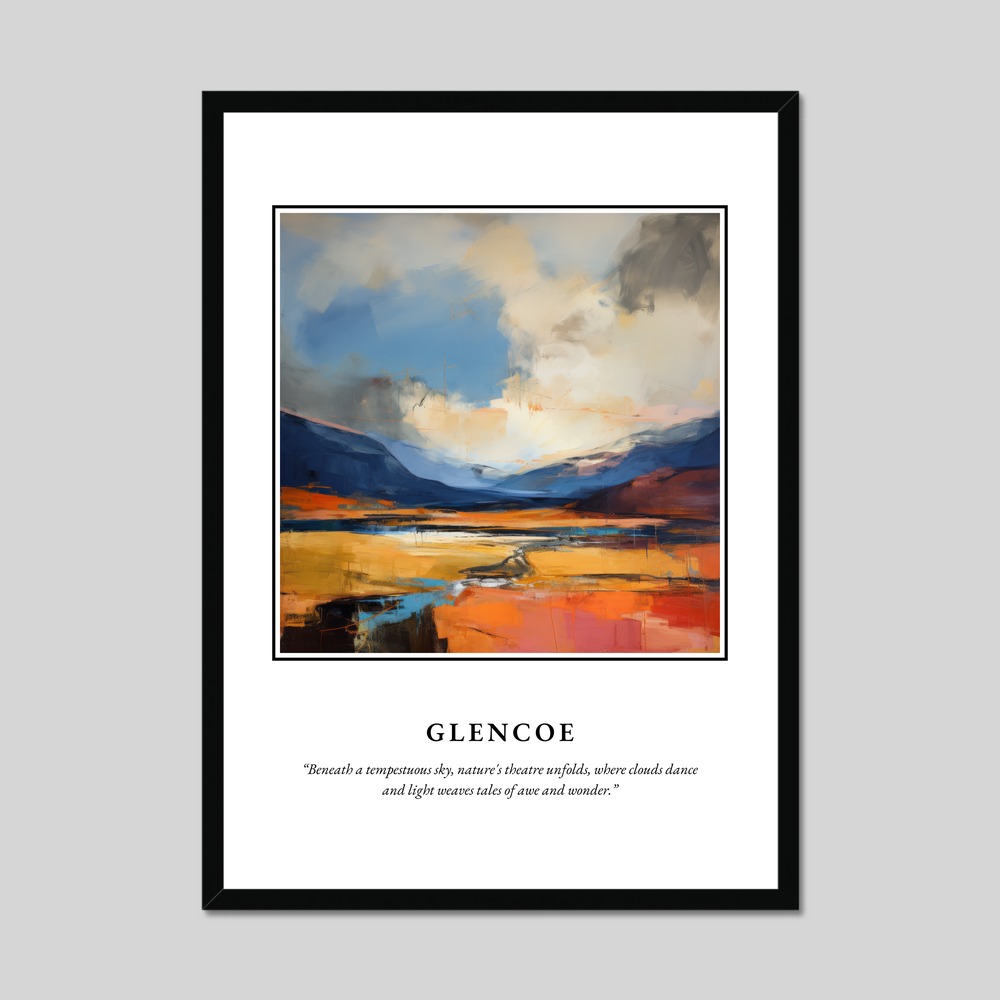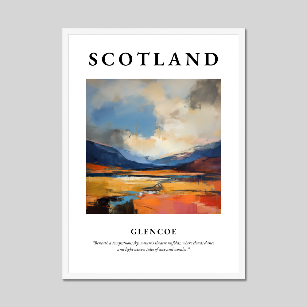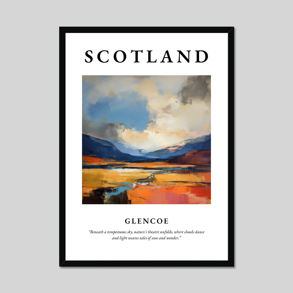 Immerse yourself in the enchanting beauty of the Scottish Highlands with our exquisite framed poster print from the “Glencoe” collection. At 50cm x 70cm, this striking piece commands attention, transforming any space with the vivid drama of its Abstract Impressionism style. It features "SCOTLAND" in bold lettering at the top, inviting admiration from anyone who has visited or dreams of visiting this storied land. Below, a captivating painting of Glencoe unfolds, capturing the essence of its tempestuous skies and the breathtaking convergence of nature's elements. Accompanying the artwork, a poetic quote reads: “Beneath a tempestuous sky, nature's theatre unfolds, where clouds dance and light weaves tales of awe and wonder,” encapsulating the magic that brings this scene to life.