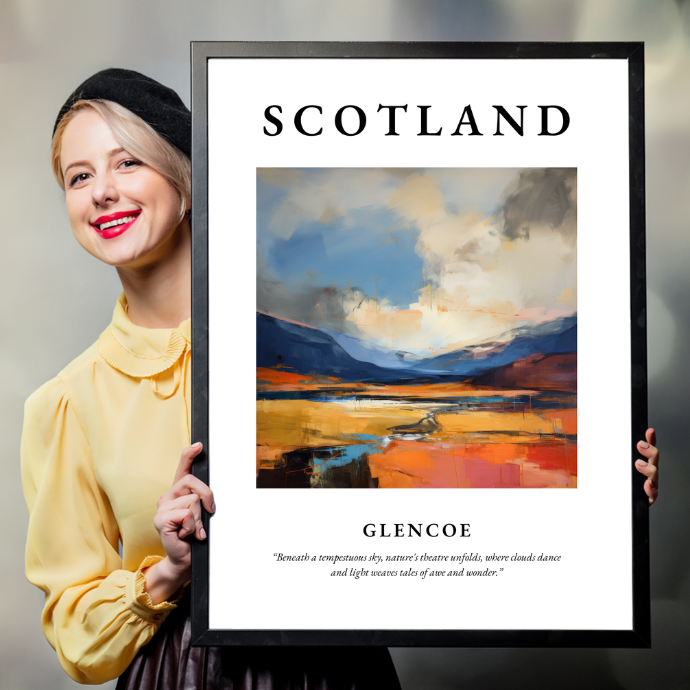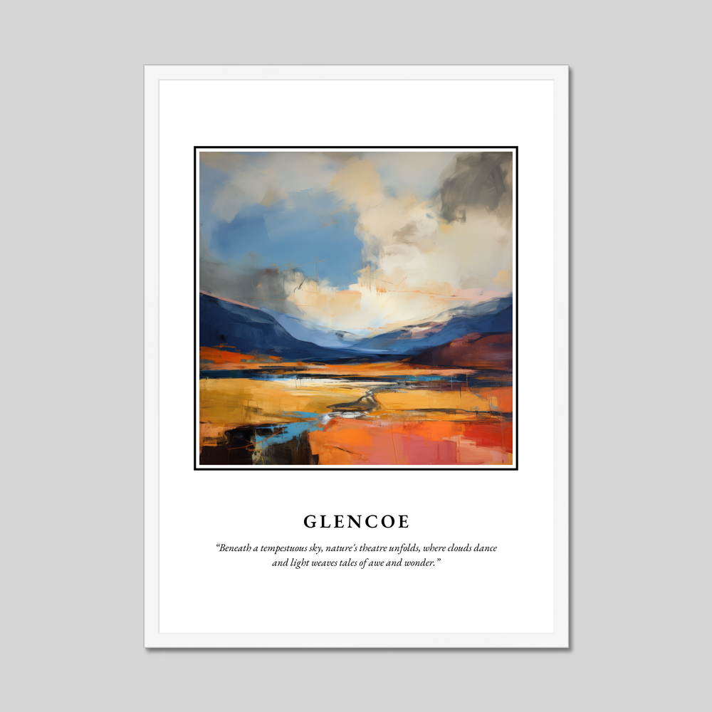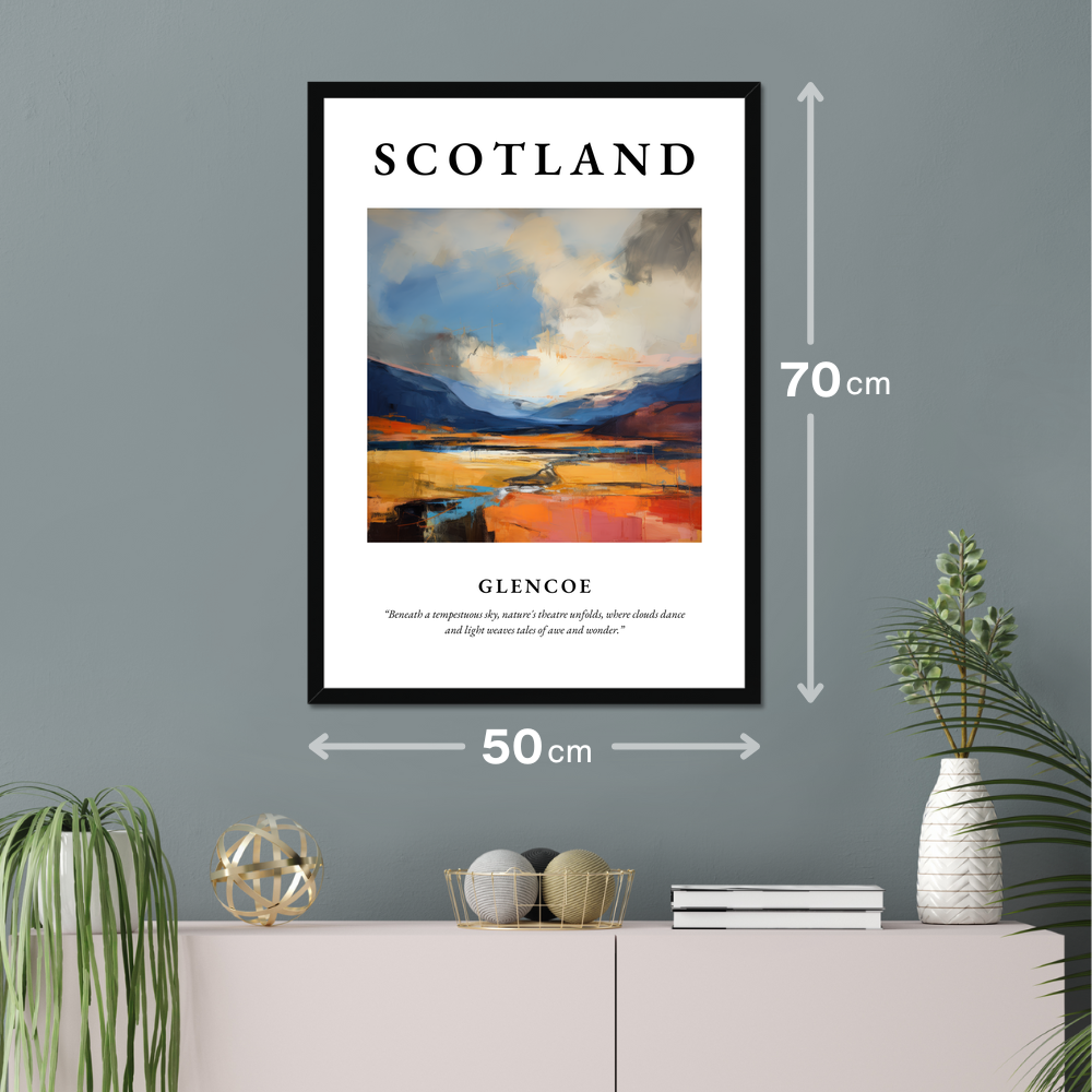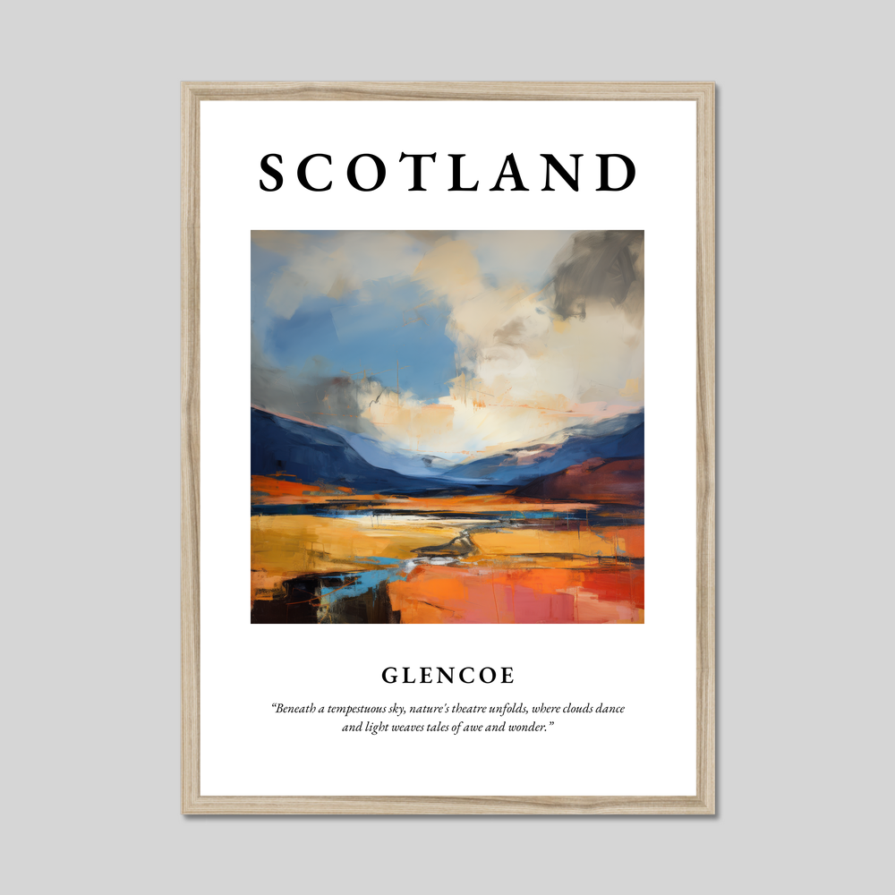 Immerse yourself in the enchanting beauty of the Scottish Highlands with our exquisite framed poster print from the “Glencoe” collection. At 50cm x 70cm, this striking piece commands attention, transforming any space with the vivid drama of its Abstract Impressionism style. It features "SCOTLAND" in bold lettering at the top, inviting admiration from anyone who has visited or dreams of visiting this storied land. Below, a captivating painting of Glencoe unfolds, capturing the essence of its tempestuous skies and the breathtaking convergence of nature's elements. Accompanying the artwork, a poetic quote reads: “Beneath a tempestuous sky, nature's theatre unfolds, where clouds dance and light weaves tales of awe and wonder,” encapsulating the magic that brings this scene to life.