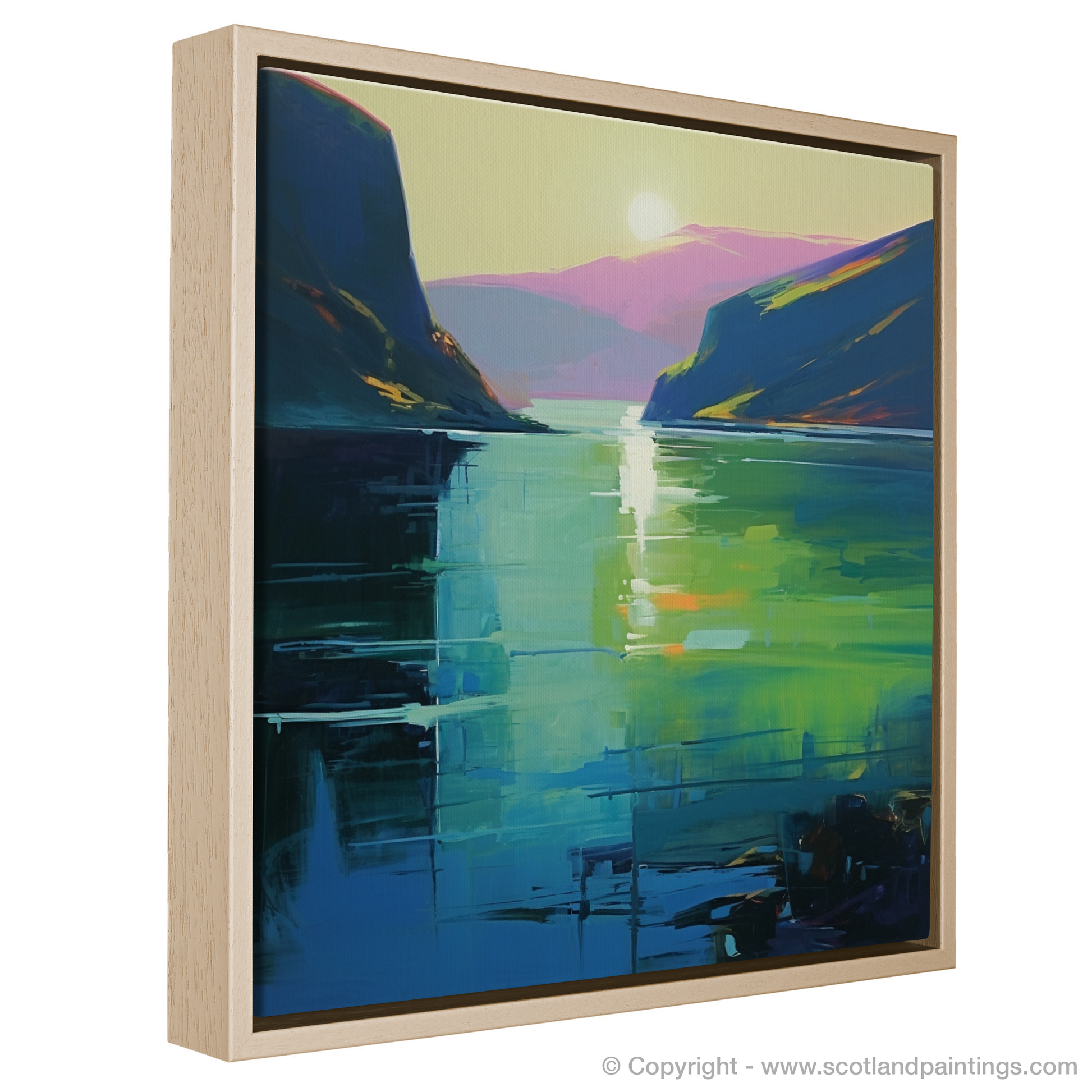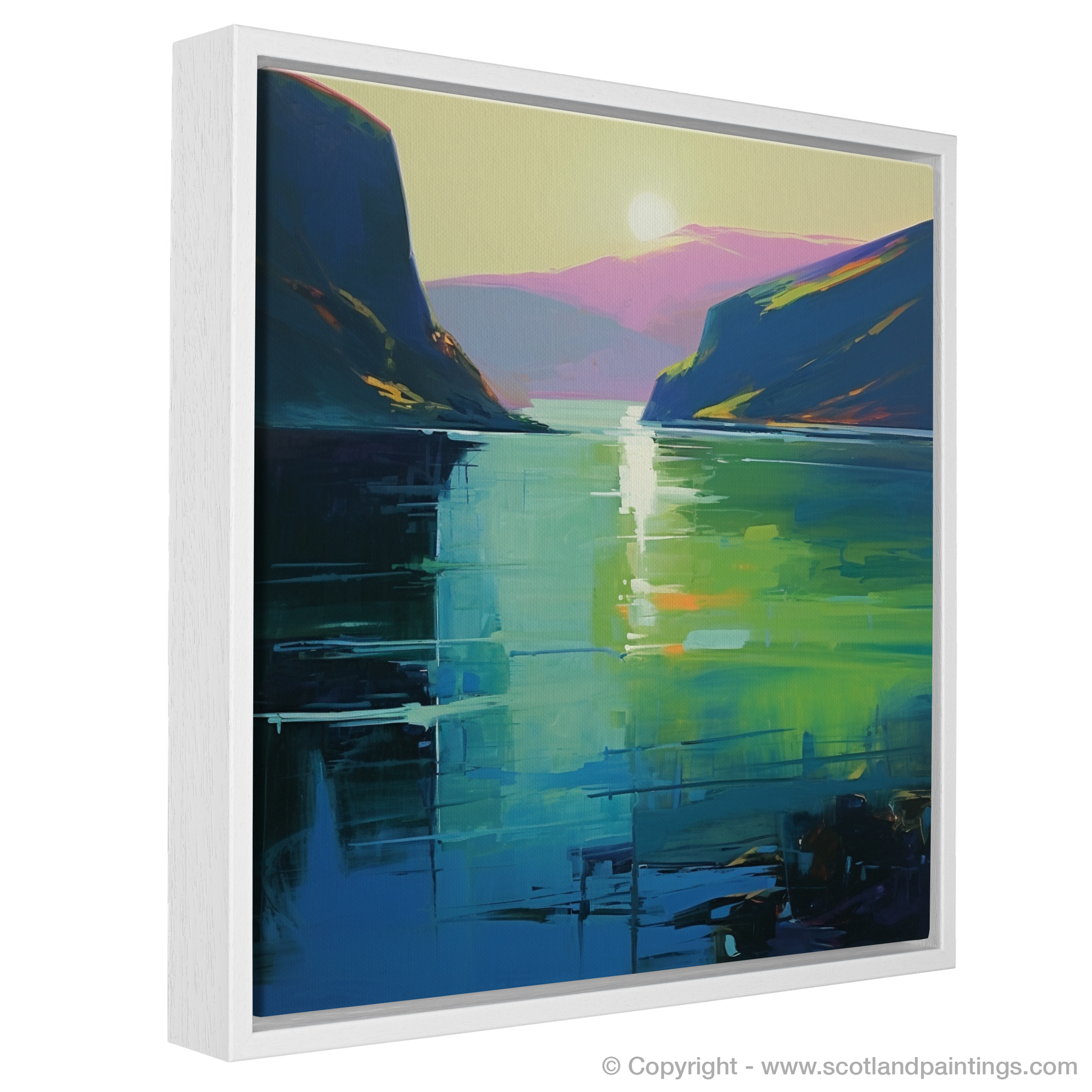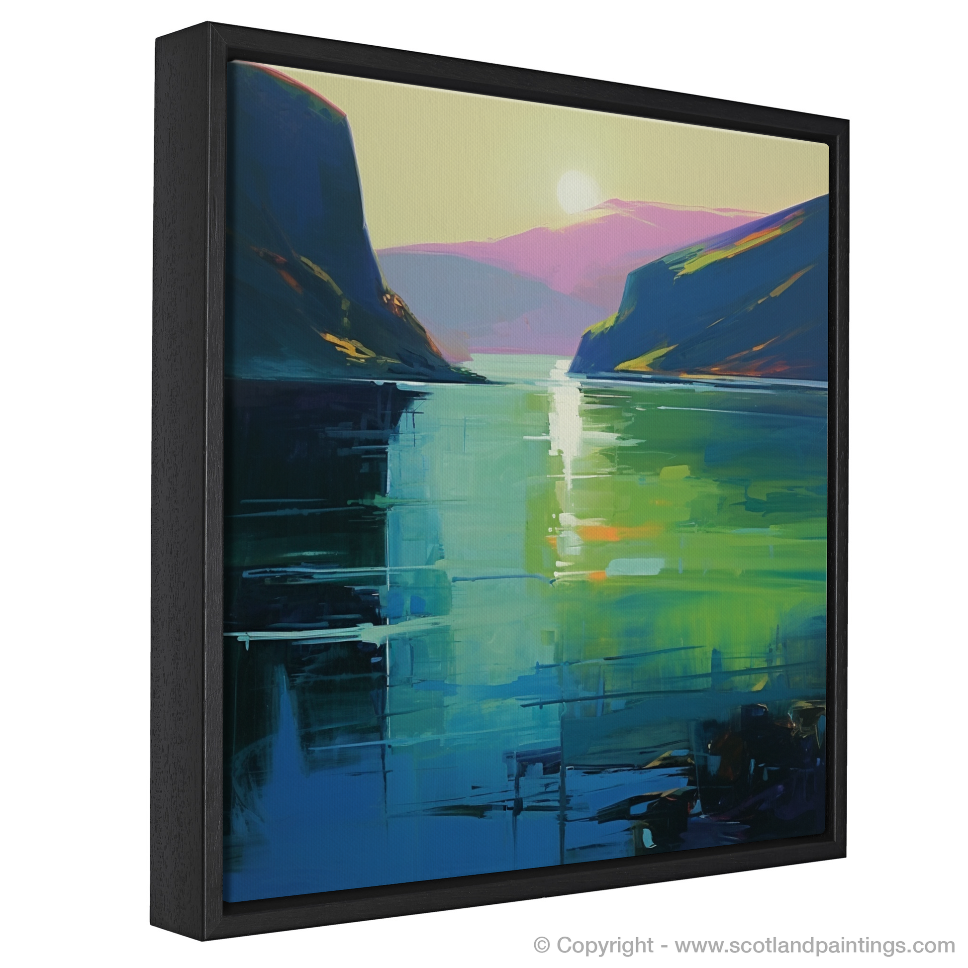 As the loch itself, ever a symbol of mystery and legend, is rendered in a palette that ranges from deep navy to the brightest lime, it invites the onlooker to ponder the secrets it might hold beneath its depicted depths. This print, a contemporary jewel, is a tribute to Scotland's natural splendour and the timeless intrigue that surrounds its most famous waterway.