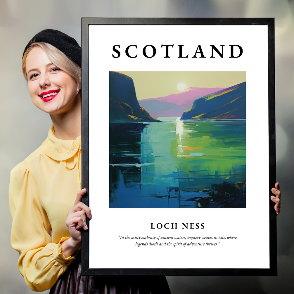 At the top, the bold declaration of "SCOTLAND" invites you to delve into a realm where history and legend intertwine. The contemporary painting captures the ethereal beauty of Loch Ness, using vibrant hues and abstract shapes to depict the interplay of light on the water's surface. Below, the poetic quote, “In the misty embrace of ancient waters, mystery weaves its tale, where legends dwell and the spirit of adventure thrives,” encapsulates the haunting enchantment of this iconic location.
