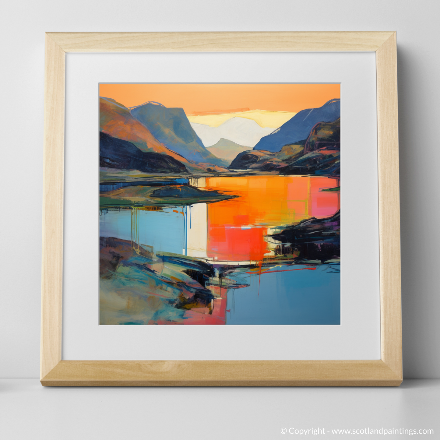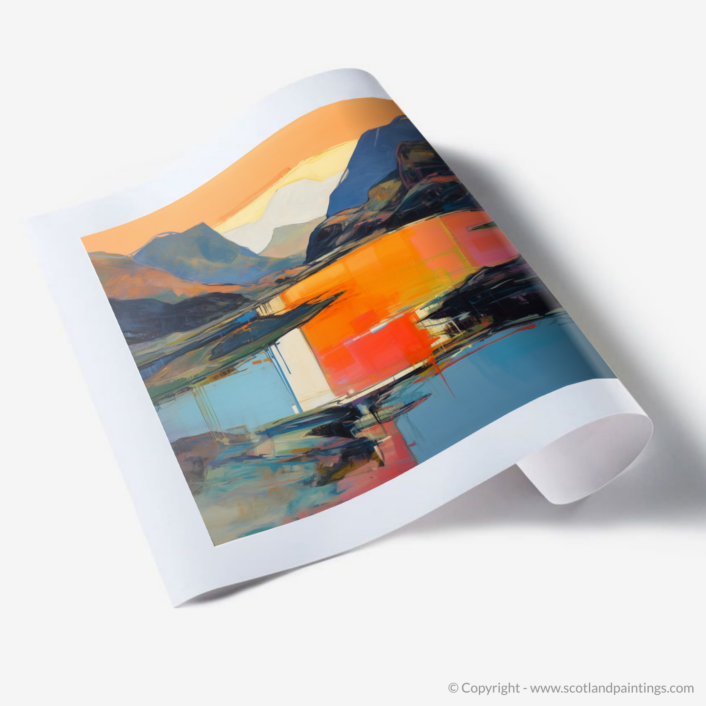 Capturing the ephemeral beauty of Loch Coruisk at the golden hour, this captivating print invites the viewer to a serene escape into the heart of one of Scotland's most enchanting coves. The artwork, a stunning blend of vibrant hues and sweeping brushstrokes, channels the essence of Abstract Impressionism, offering a fresh, modern take on a classic landscape.