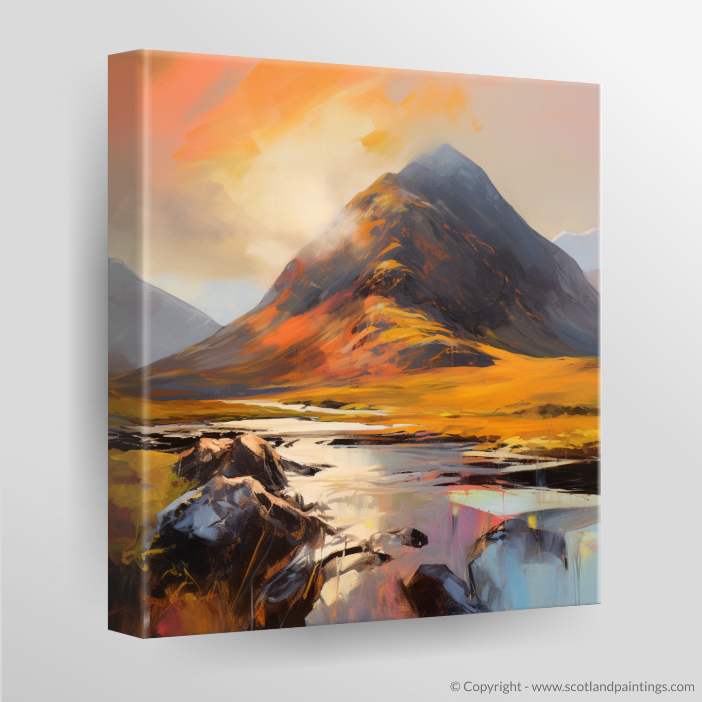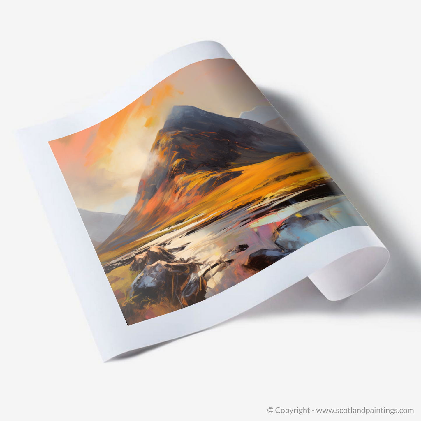 Immerse yourself in the rugged beauty of the Highlands captured at the most magical time of day. This evocative piece transports you to the heart of Glencoe, where the iconic Buachaille Etive Mòr stands cloaked in the warm embrace of the golden hour. Bold brushstrokes and a vibrant palette evoke the dynamic energy of nature, as sunlight cascades across the heathen wilds, casting a golden glow over the moorland and the tranquil waters that reflect the majesty of the peaks.