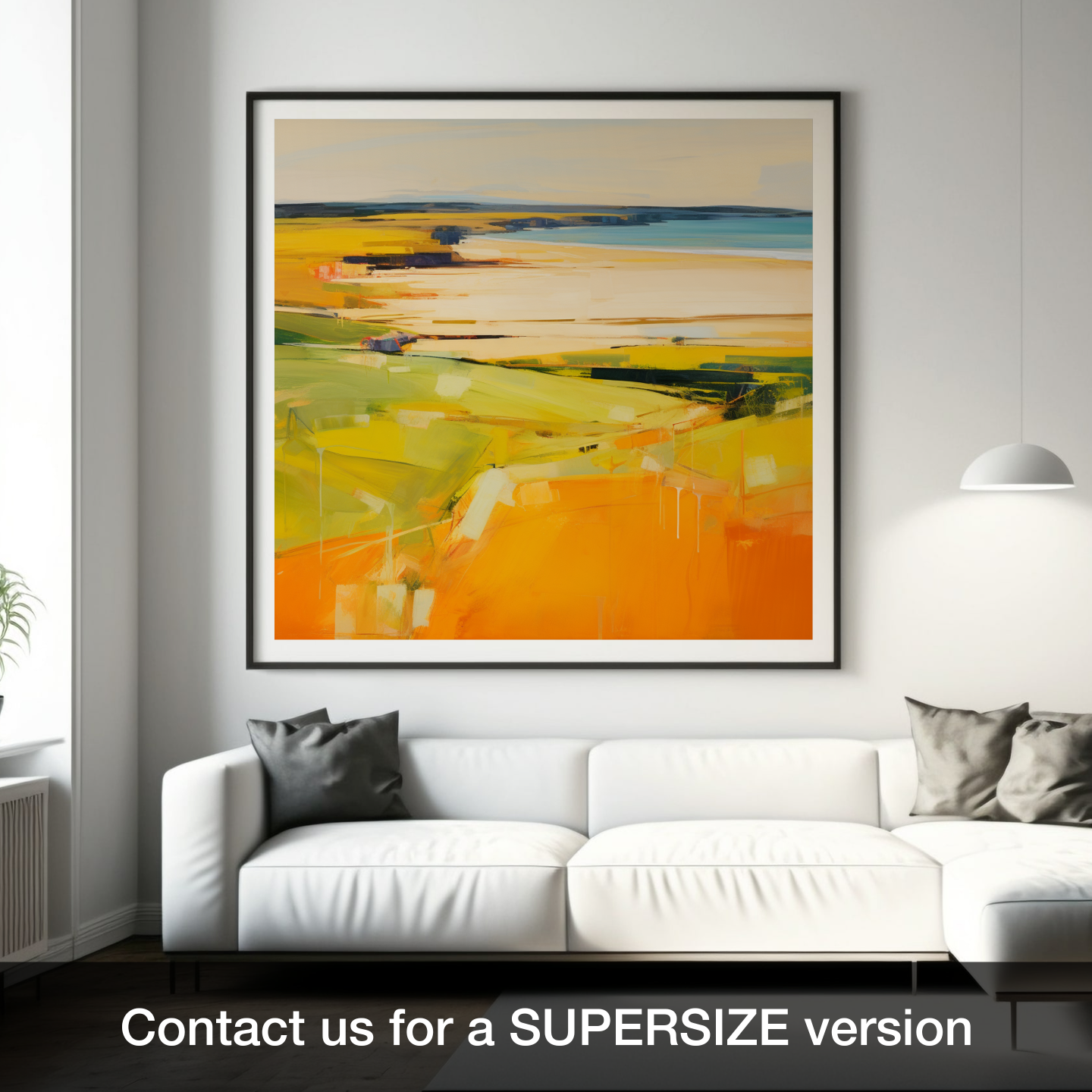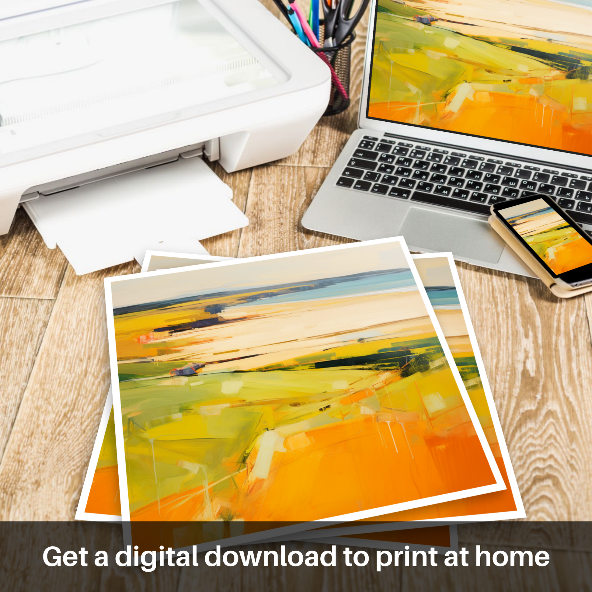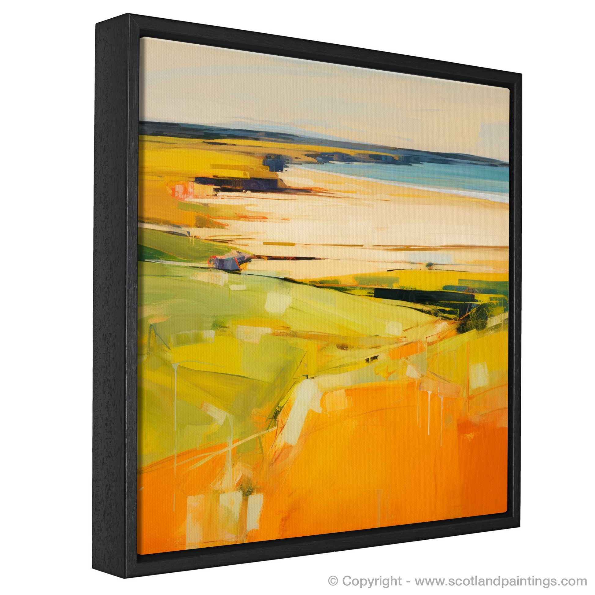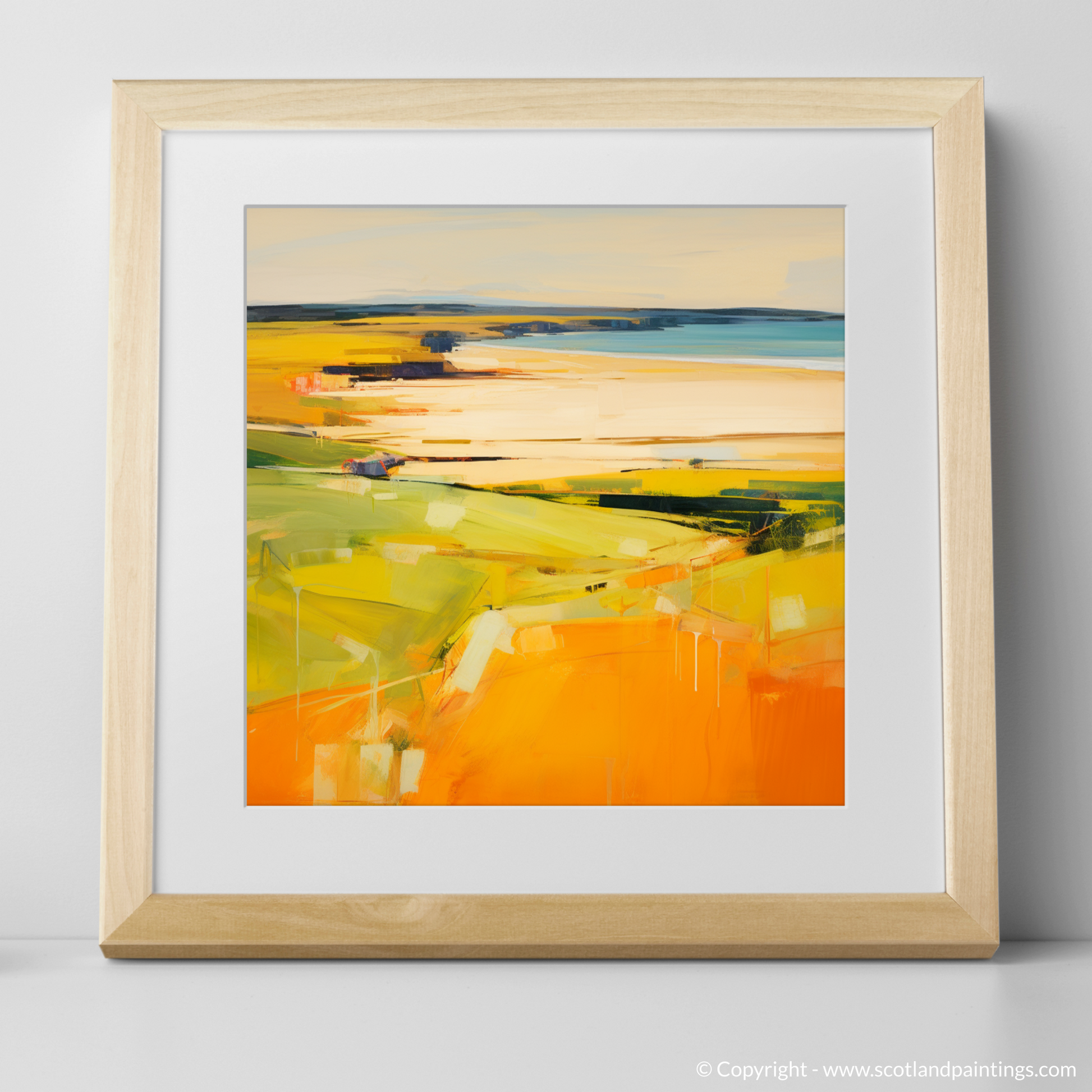 Immerse your senses in the warm embrace of golden hour as it washes over Gullane Beach in this evocative print. The abstract impressionist style tenderly captures the transformative light of the setting sun, melding yellows, oranges, and hints of verdant greens to form a rich tapestry that suggests the gentle ebb and flow of the Scottish shoreline.