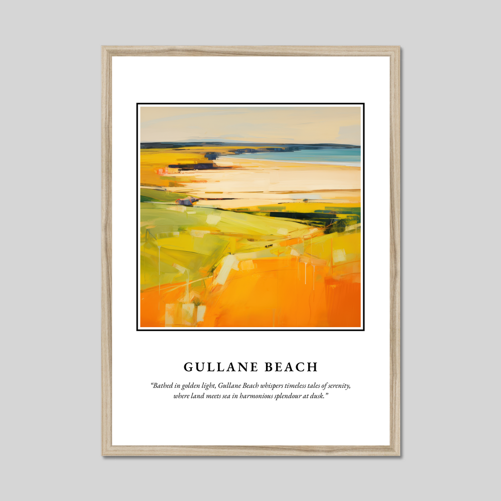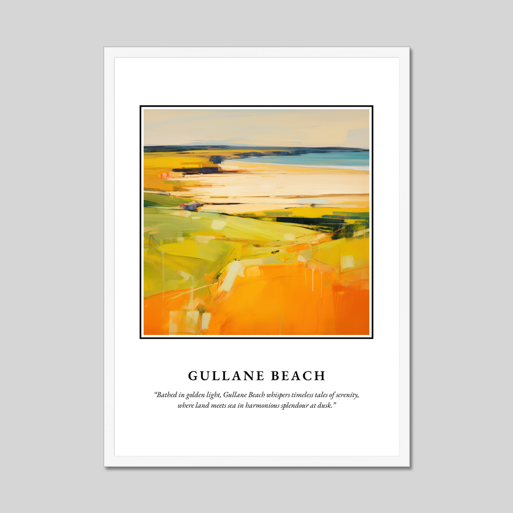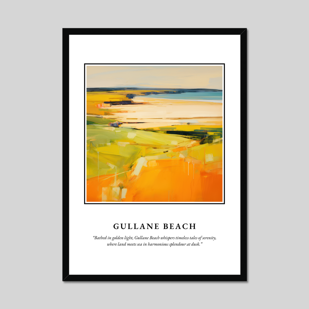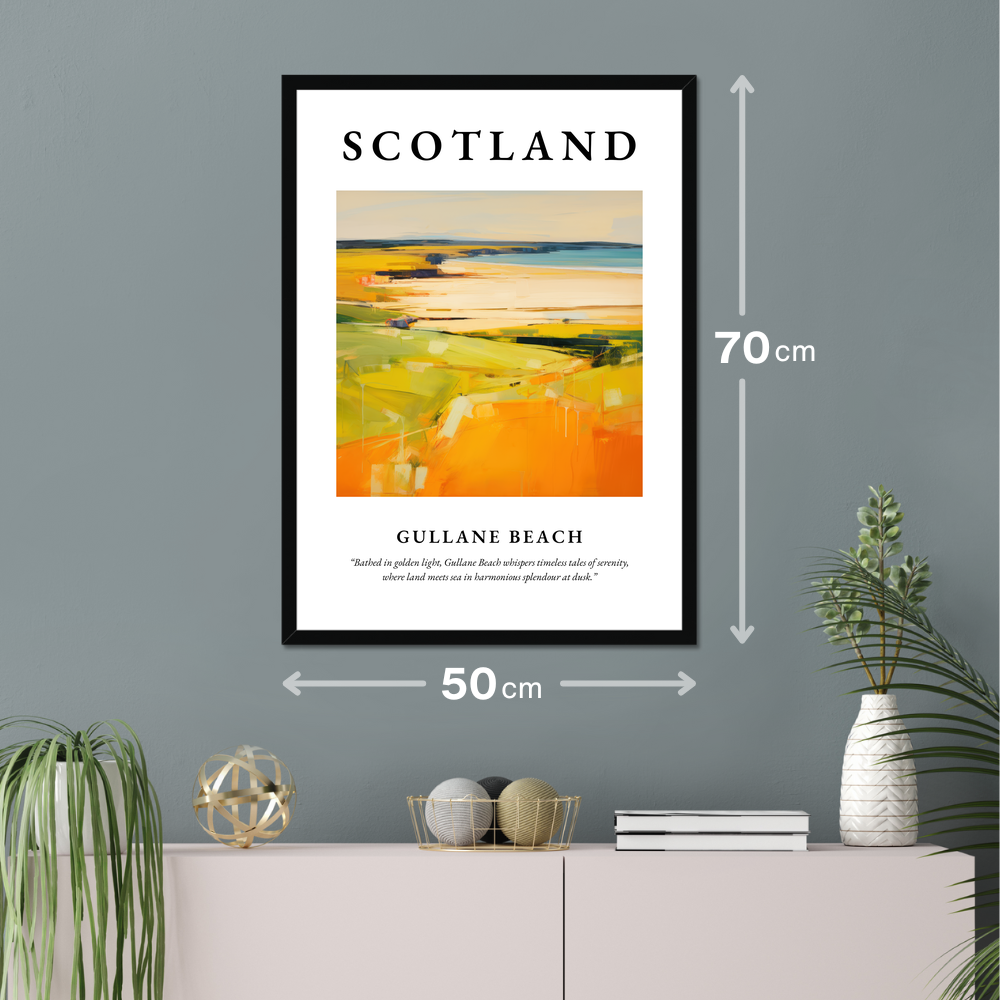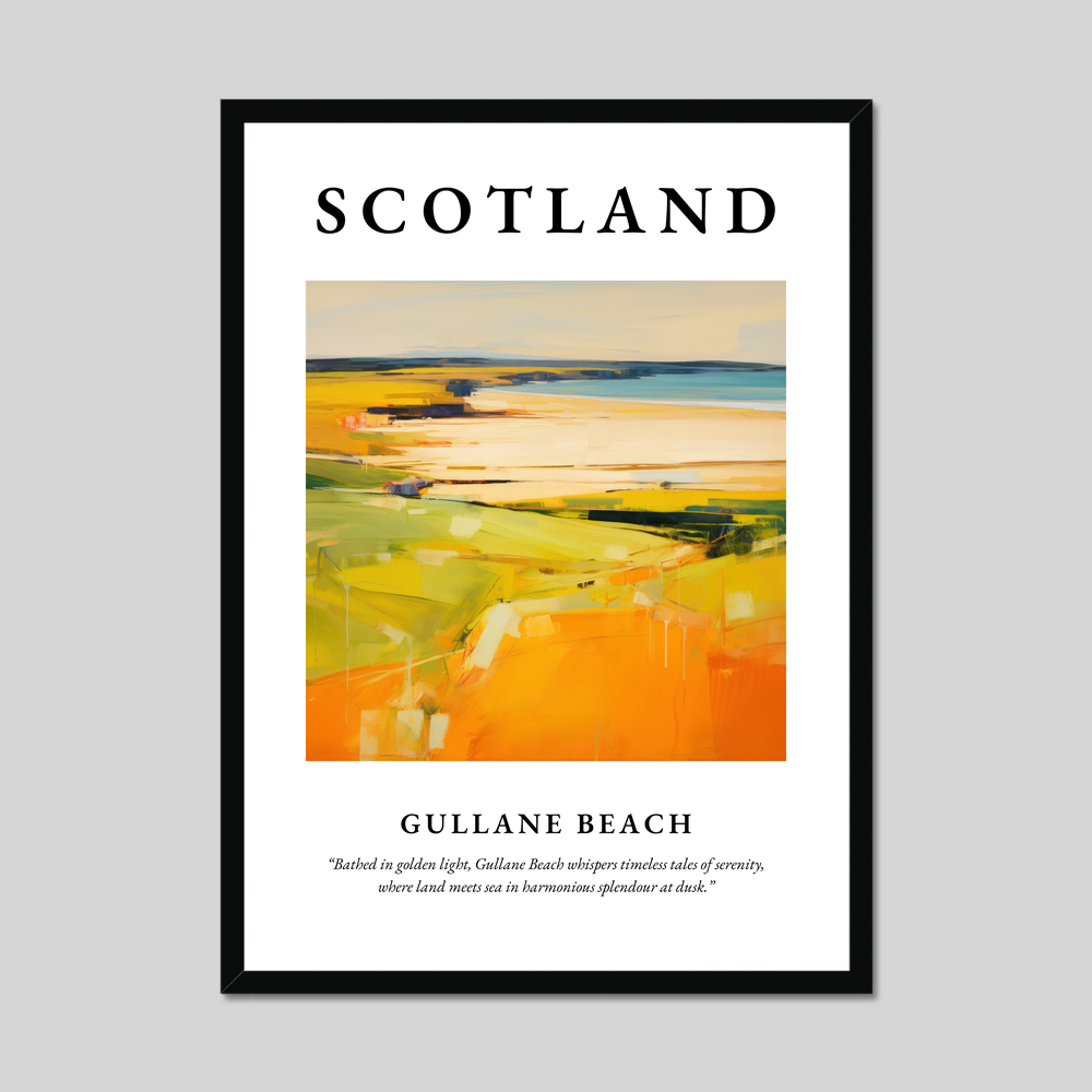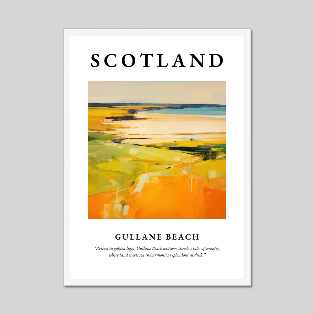 Gullane Beach, located on the picturesque coast of East Lothian, is a beloved destination known for its expansive sandy shores and gentle dunes. A haven for nature enthusiasts and sun-seekers alike, the beach offers breathtaking views that captivate visitors, as reflected in the abstract depiction on the poster. The tranquil environment is ideal for leisurely strolls, and the whispers of the waves provide a perfect soundtrack to a peaceful evening.