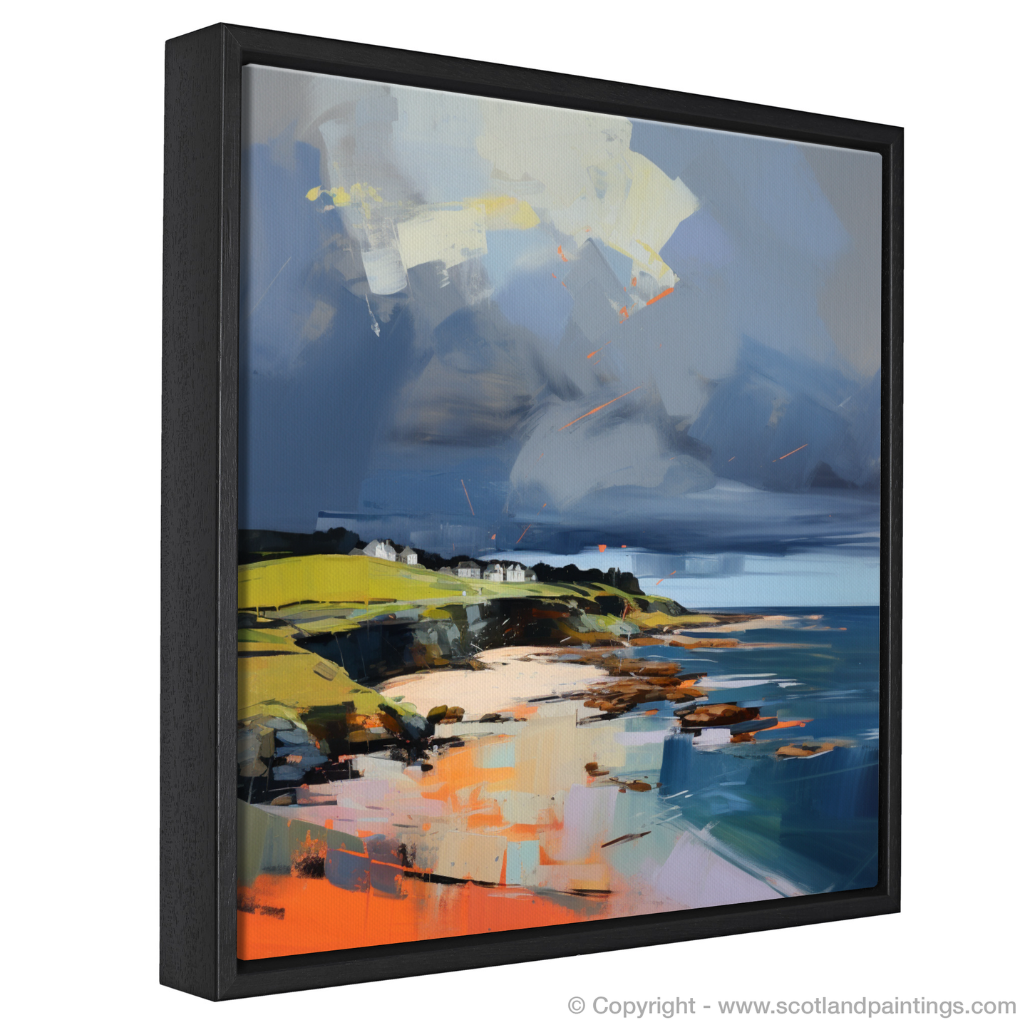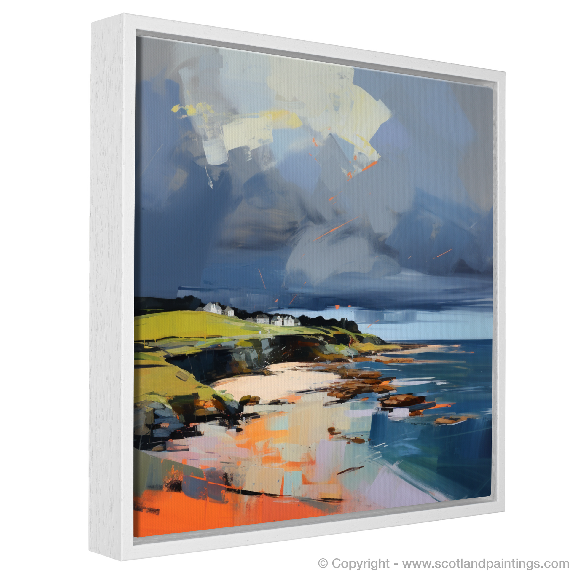 Embrace the tempestuous elegance of Scotland's rugged coast with our alluring print that captures the essence of Coldingham Bay on a stormy day. In this evocative work, the viewer is invited to experience the dramatic beauty of a contemporary Scottish beach scene where nature's ferocity and tranquillity collide.