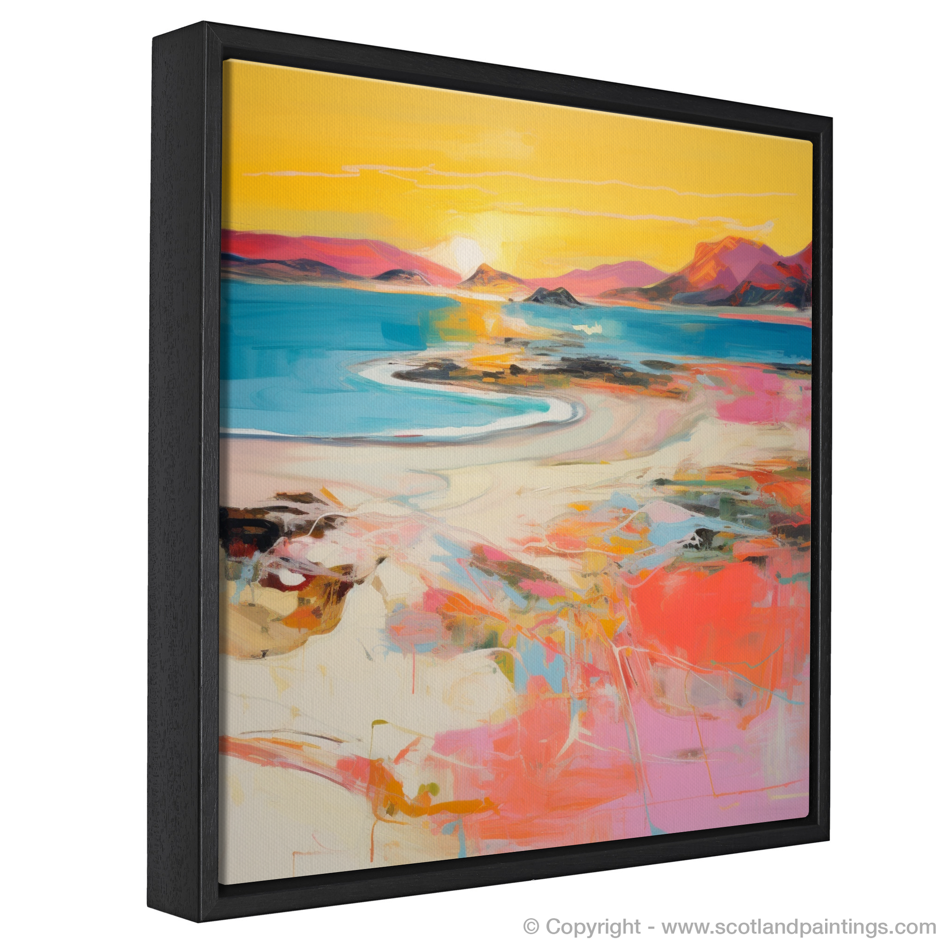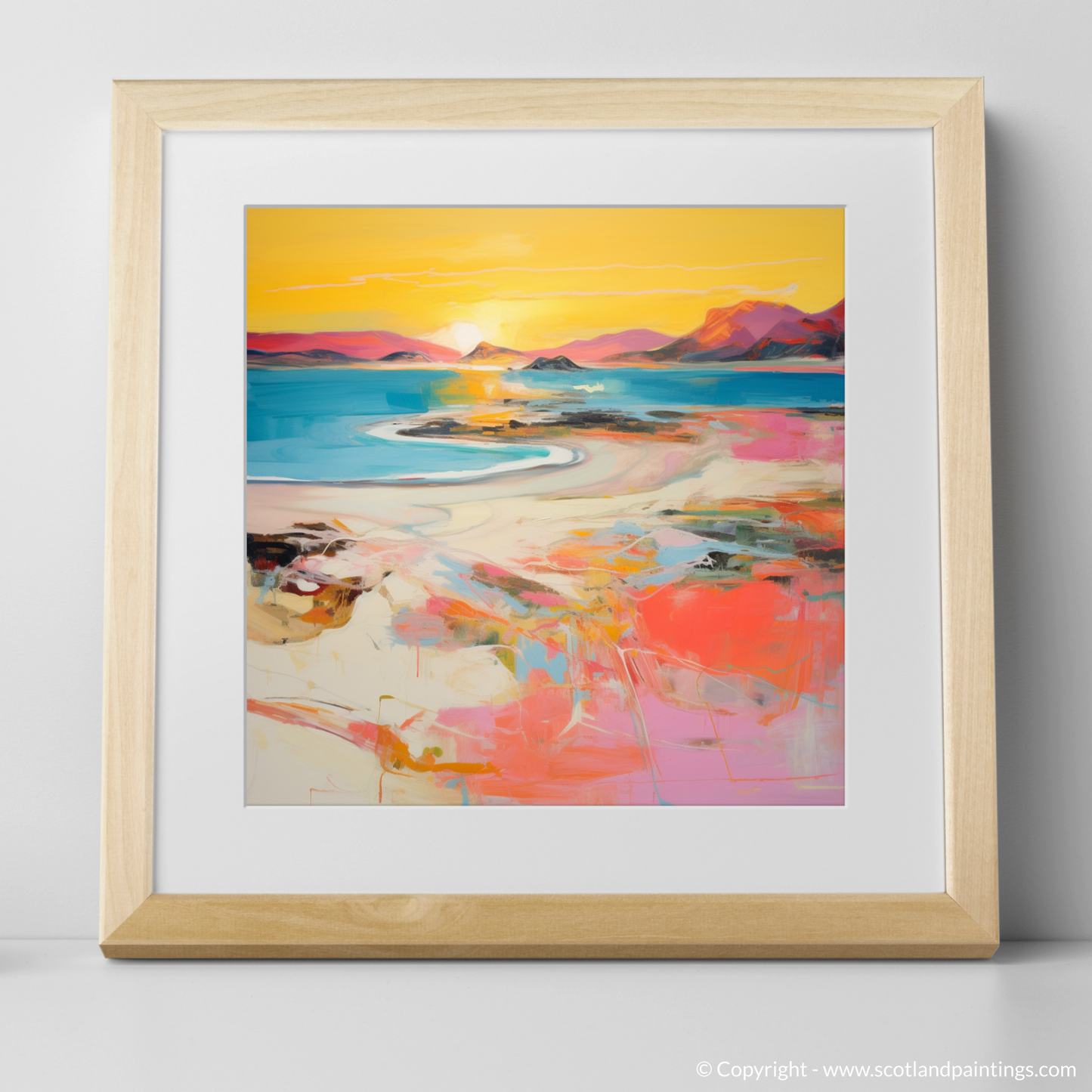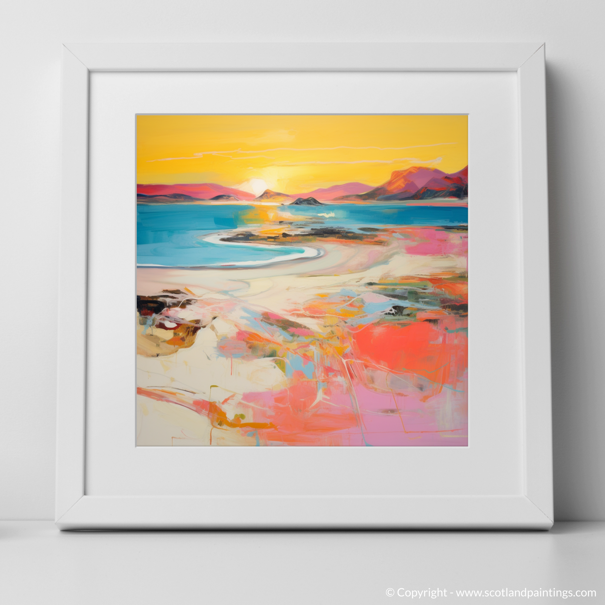 As the day wanes into a mesmerising tableau of warm hues, this expressive piece captures the essence of Traigh Mhor's breathtaking seascape at the peak of sunset's glory. Swathes of vibrant coral mingle with strokes of soft pink, encapsulating the delicate dance of the fading light as it graces the undulating sands and tranquil waters.
