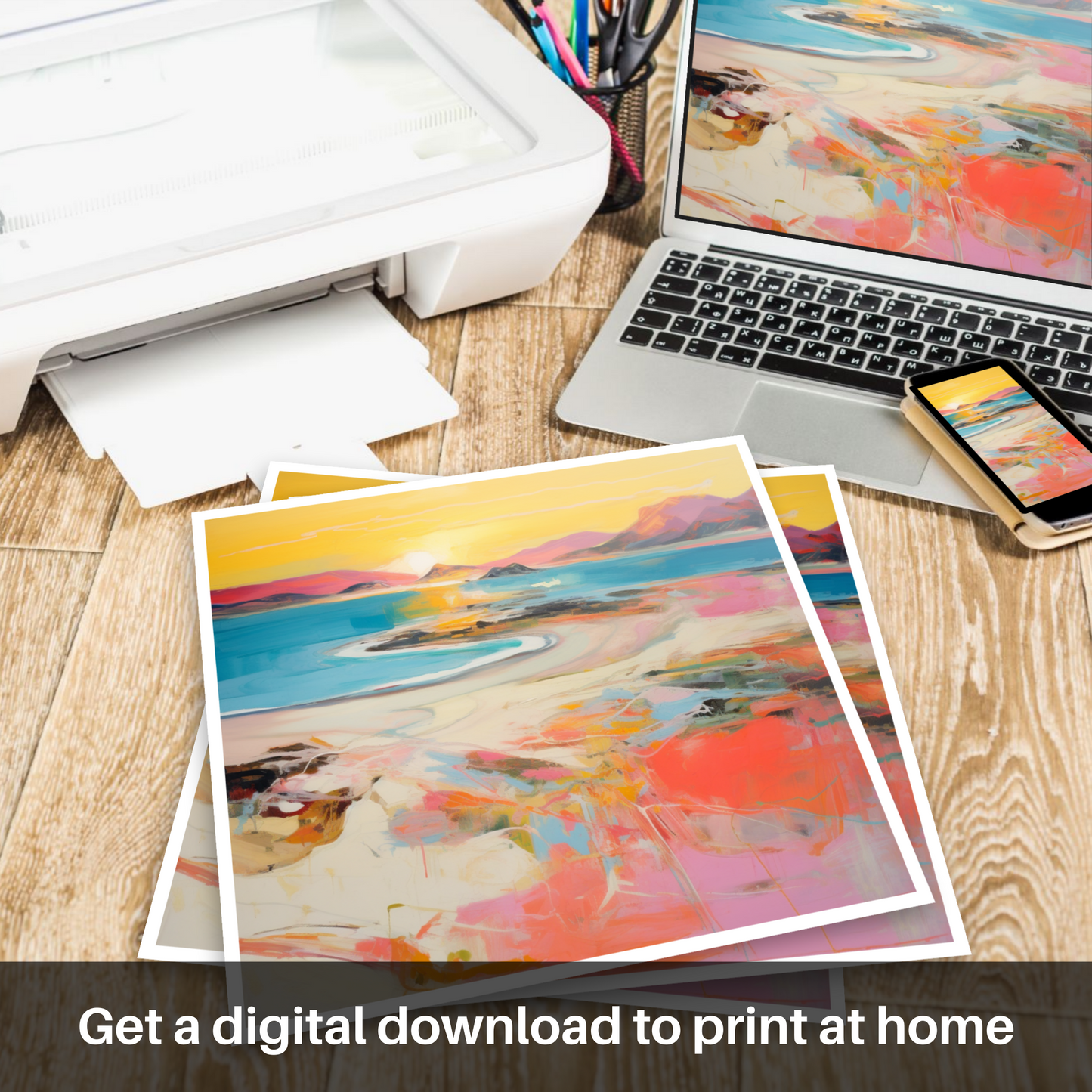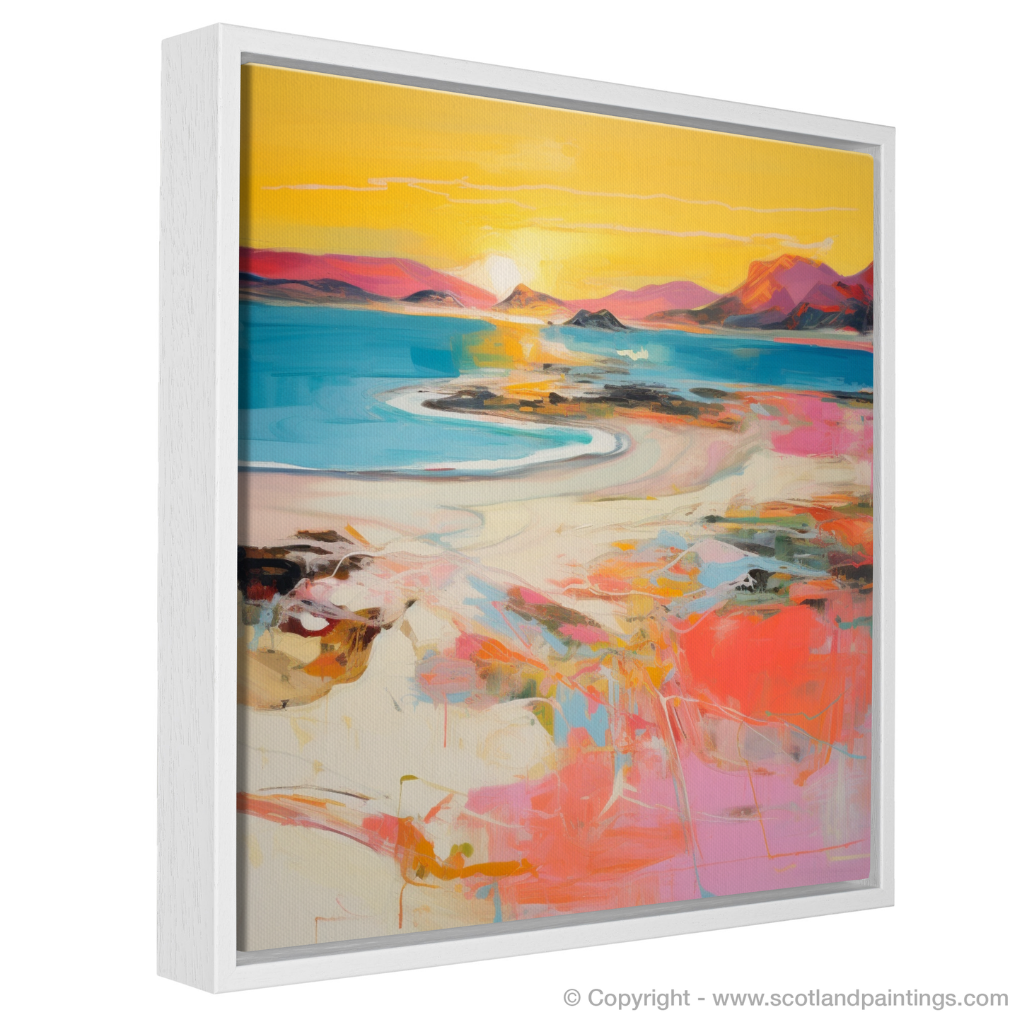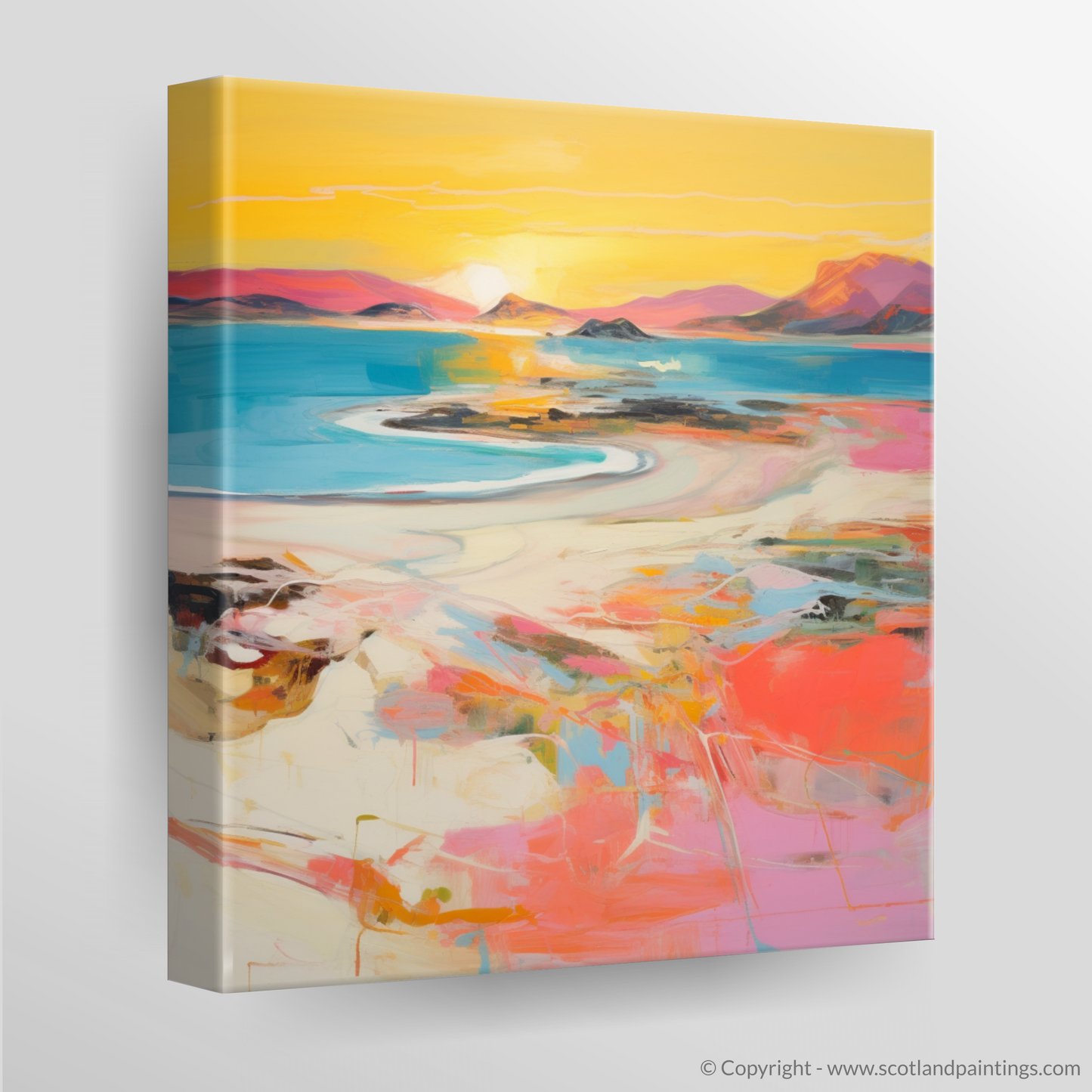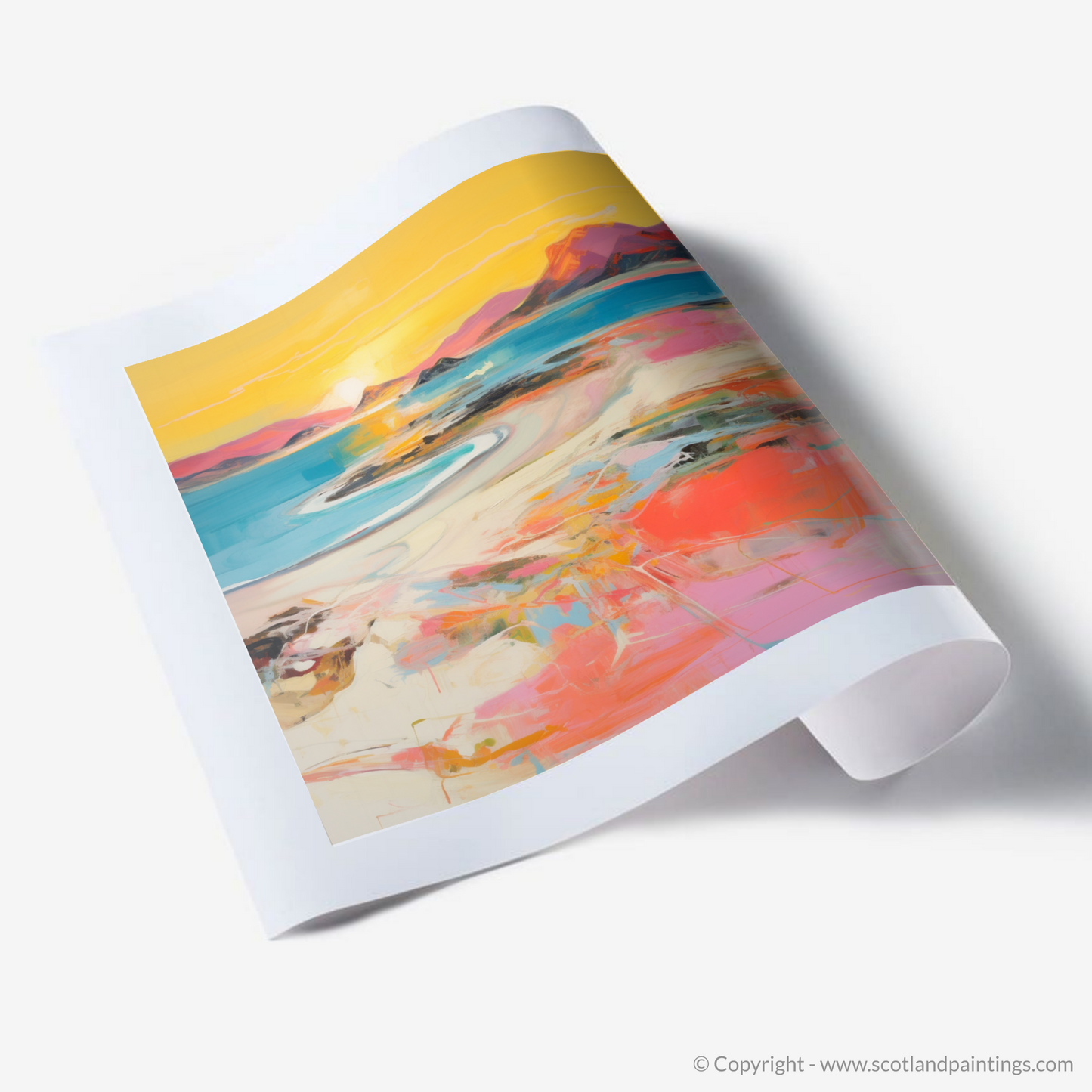 As the day wanes into a mesmerising tableau of warm hues, this expressive piece captures the essence of Traigh Mhor's breathtaking seascape at the peak of sunset's glory. Swathes of vibrant coral mingle with strokes of soft pink, encapsulating the delicate dance of the fading light as it graces the undulating sands and tranquil waters.