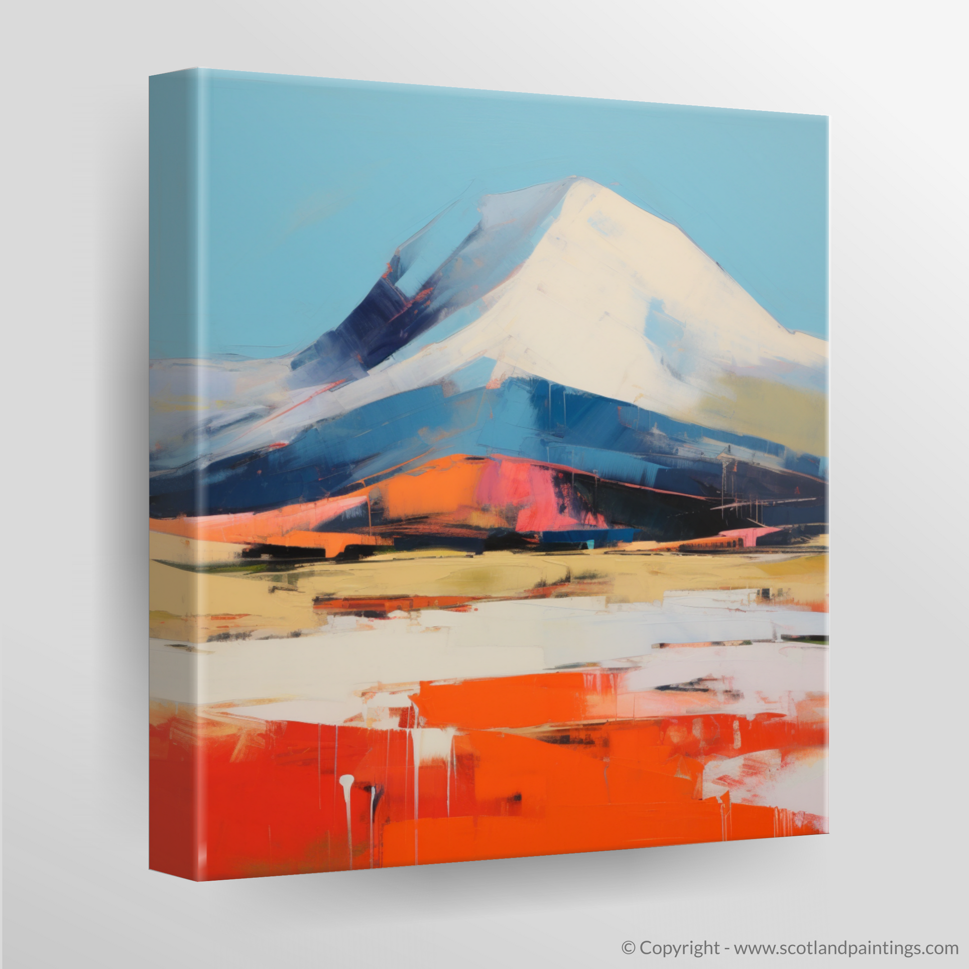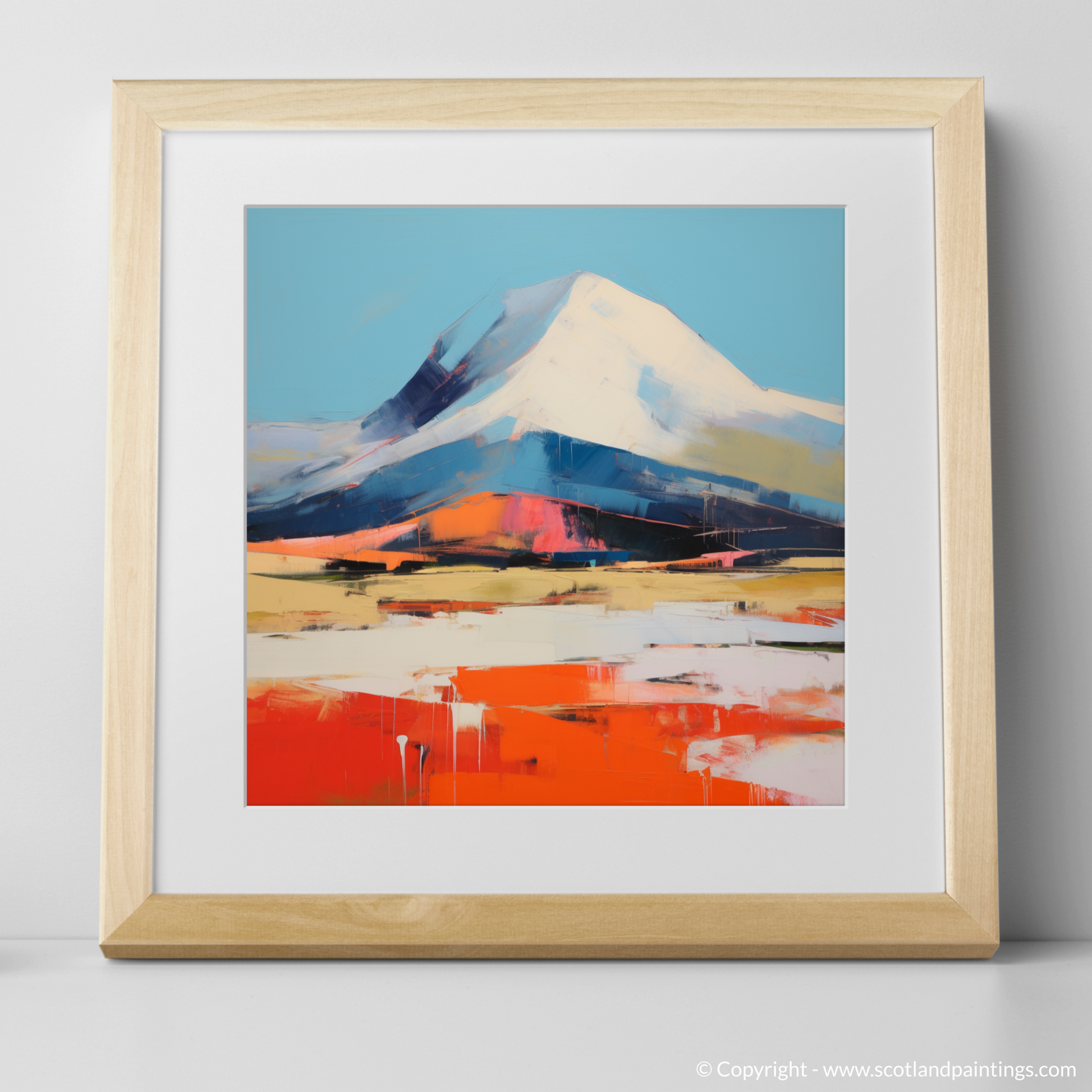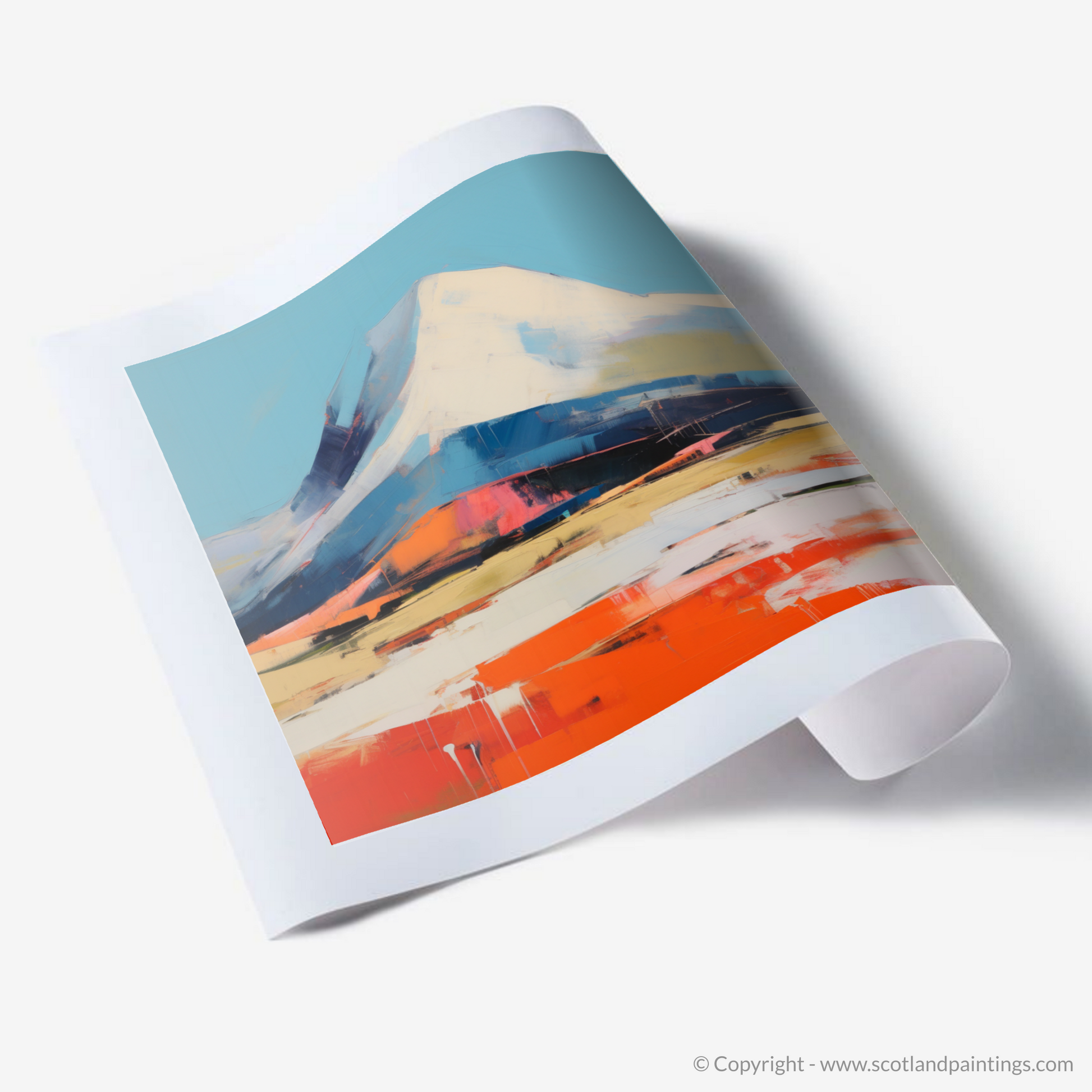 The foreground, dominated by warm, fiery tones, delicately transitions into the cool, snowy cap of the peak, suggesting the shifting weather and light that characterise the Scottish Highlands. This print embodies the soul of adventure and the majesty of the wild terrain, offering an eye-catching statement piece for enthusiasts of Scotland's rugged beauty and lovers of cutting-edge art alike. Add this striking print to your space and let it stand as a beacon of nature's enduring grandeur and the boldness of contemporary artwork.