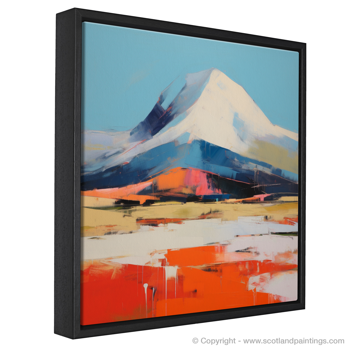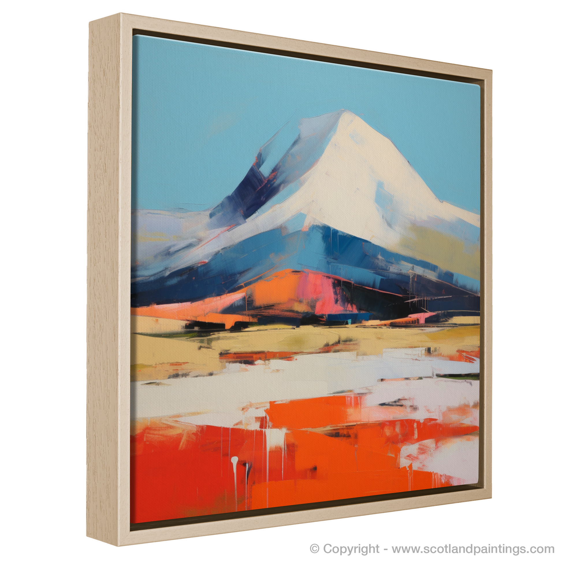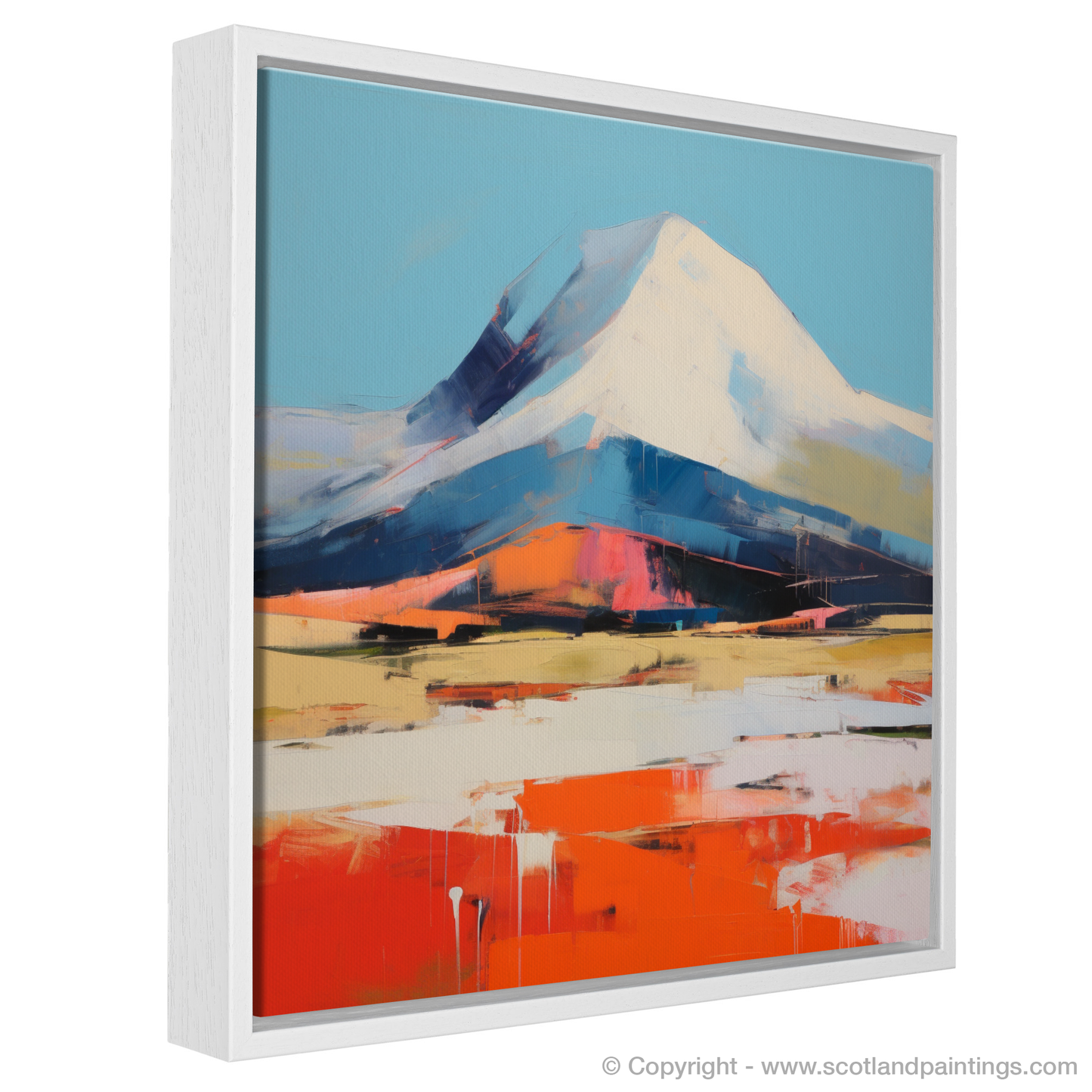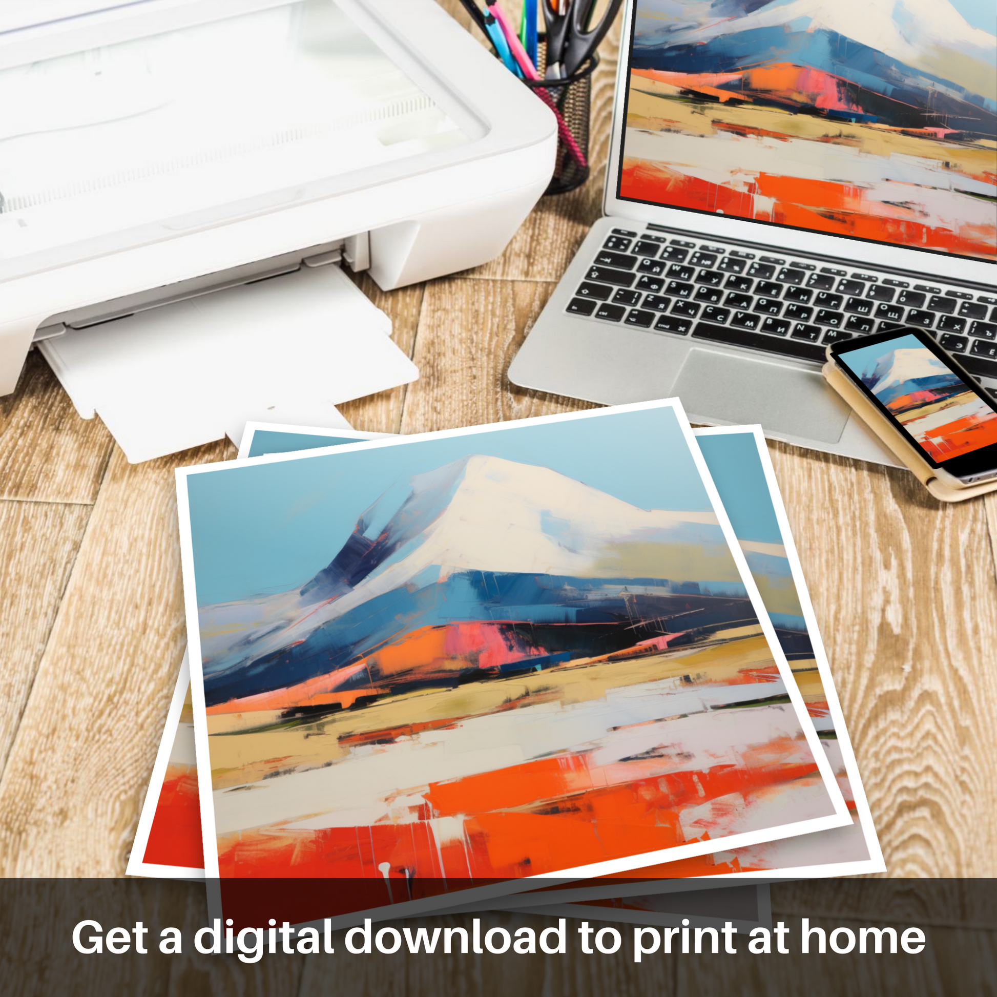 The foreground, dominated by warm, fiery tones, delicately transitions into the cool, snowy cap of the peak, suggesting the shifting weather and light that characterise the Scottish Highlands. This print embodies the soul of adventure and the majesty of the wild terrain, offering an eye-catching statement piece for enthusiasts of Scotland's rugged beauty and lovers of cutting-edge art alike. Add this striking print to your space and let it stand as a beacon of nature's enduring grandeur and the boldness of contemporary artwork.