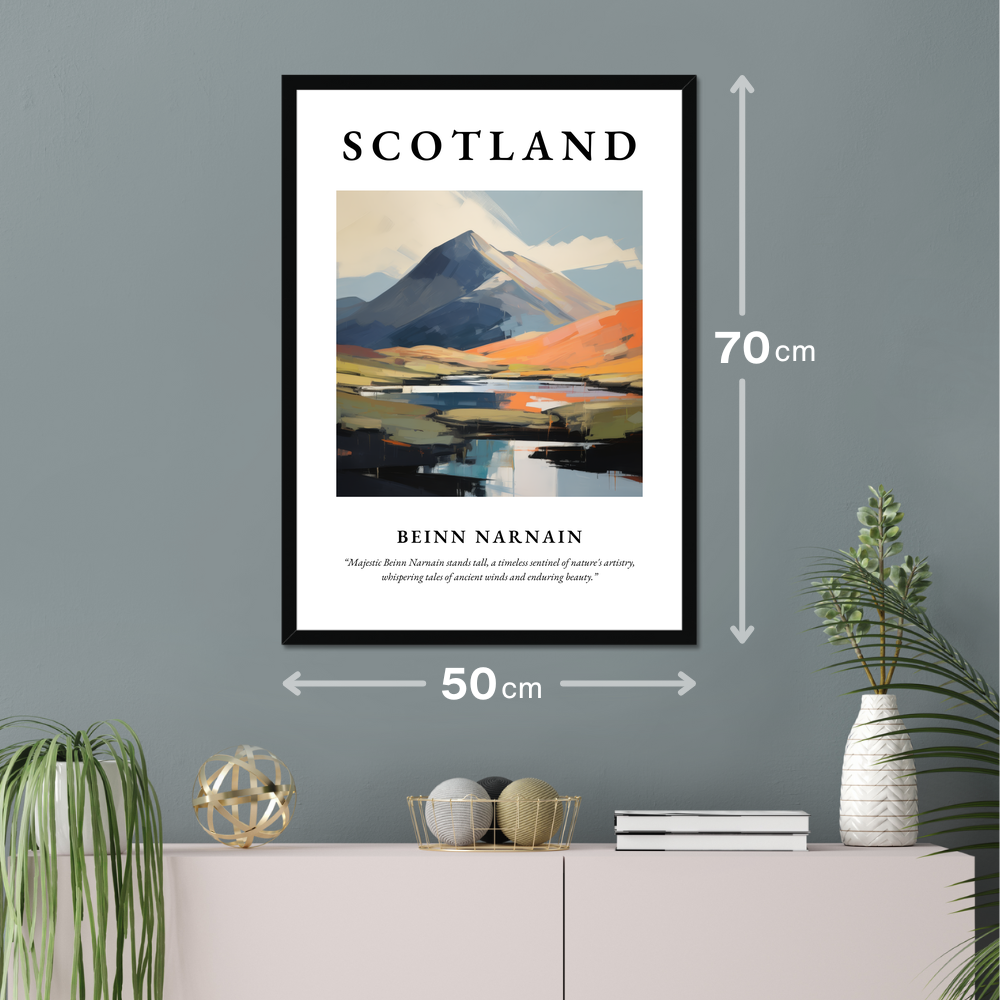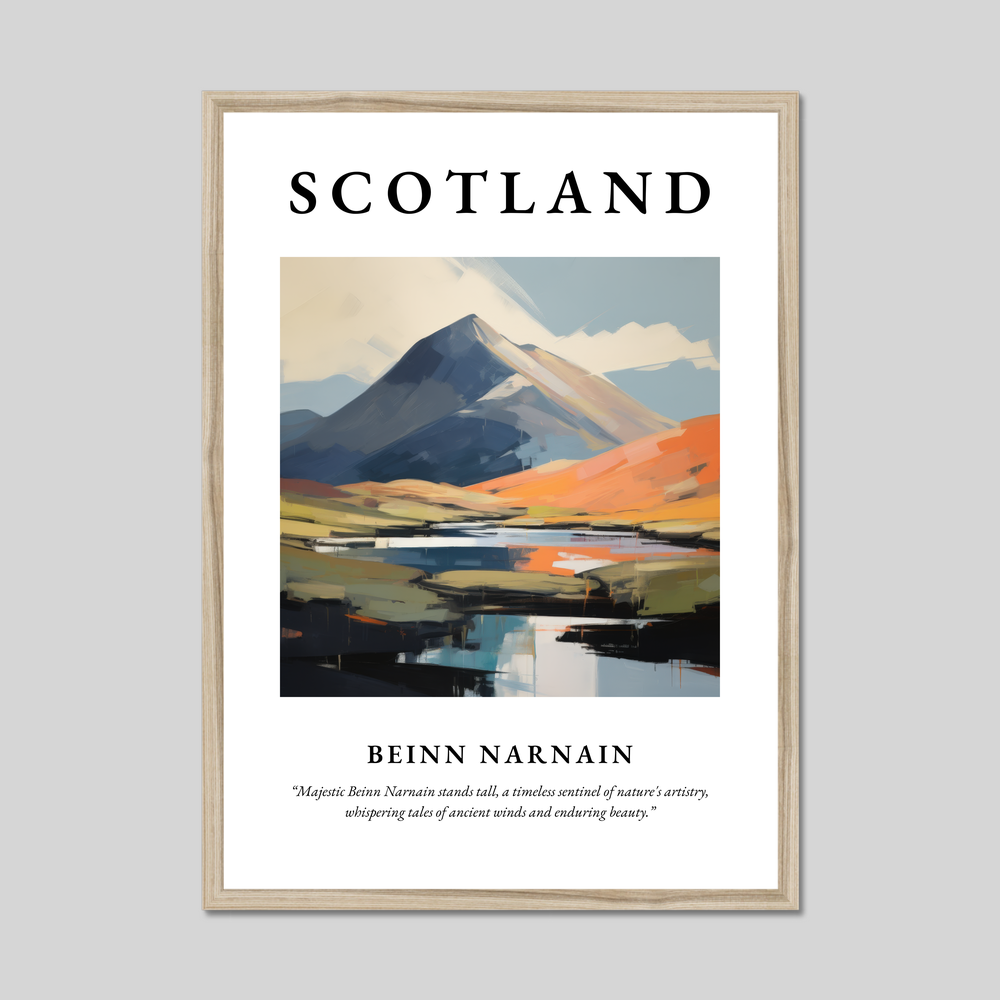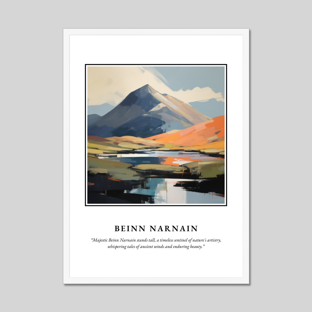 The poster features the bold title “SCOTLAND” atop an exquisite contemporary painting of Beinn Narnain. The artwork captures the mountain's awe-inspiring presence with sweeping brushstrokes and vibrant colours, evoking a sense of movement and life. Below the painting, in delicate lettering, rests the thought-provoking quote, “Majestic Beinn Narnain stands tall, a timeless sentinel of nature's artistry, whispering tales of ancient winds and enduring beauty,” inviting contemplation and connection.