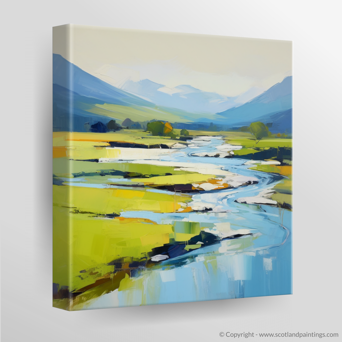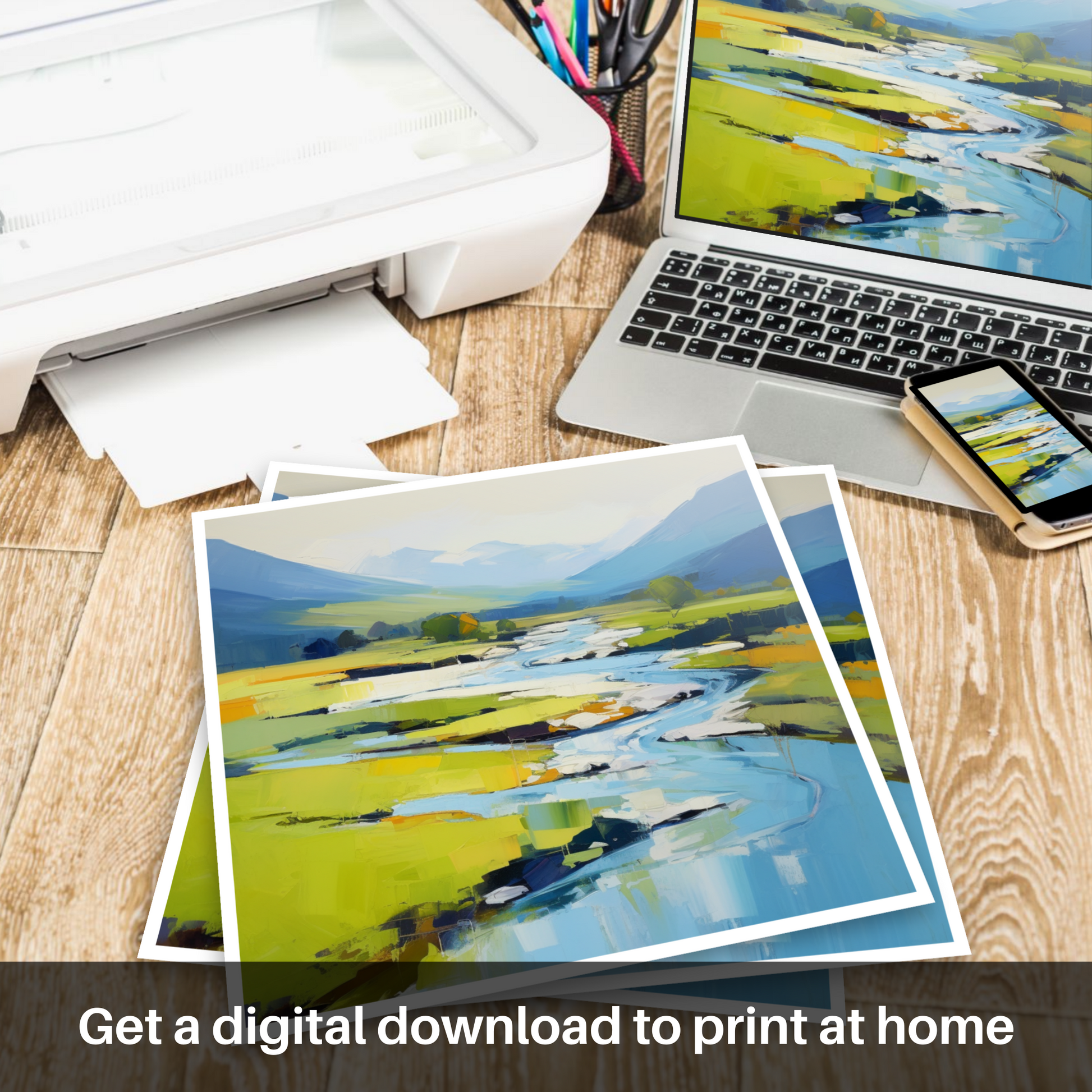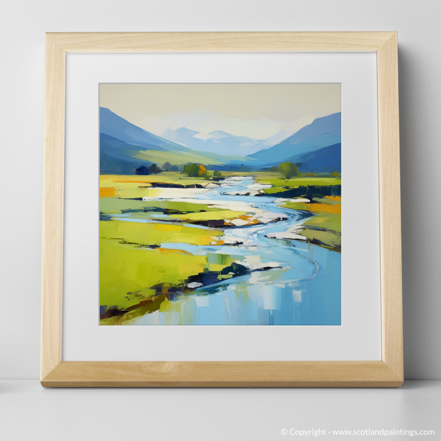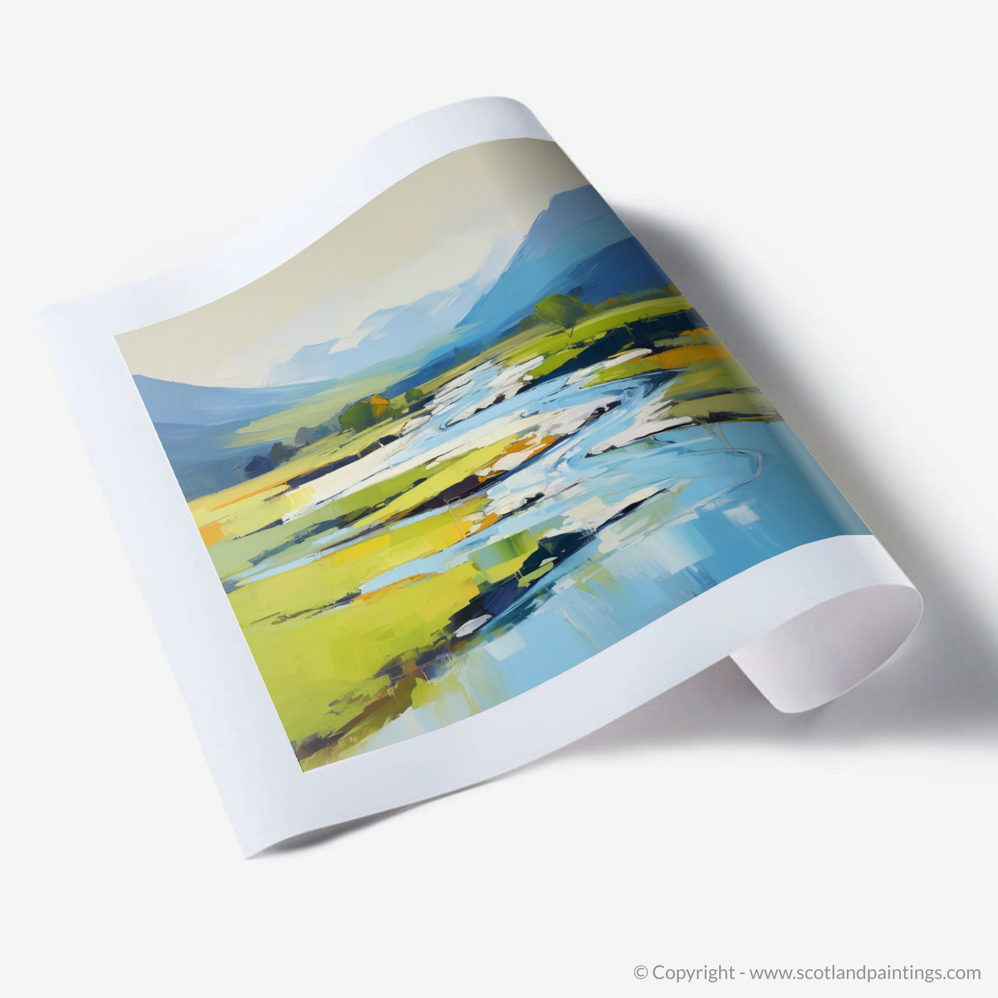 Touches of white and pale tones along the riverbank catch the light, simulating the sparkle of sunlight on water, and adding a dynamic contrast that enhances the print's idyllic atmosphere. The painting's modern approach blends abstraction with a sense of place, offering a fresh and dynamic perspective on one of Scotland's enchanting landscapes.