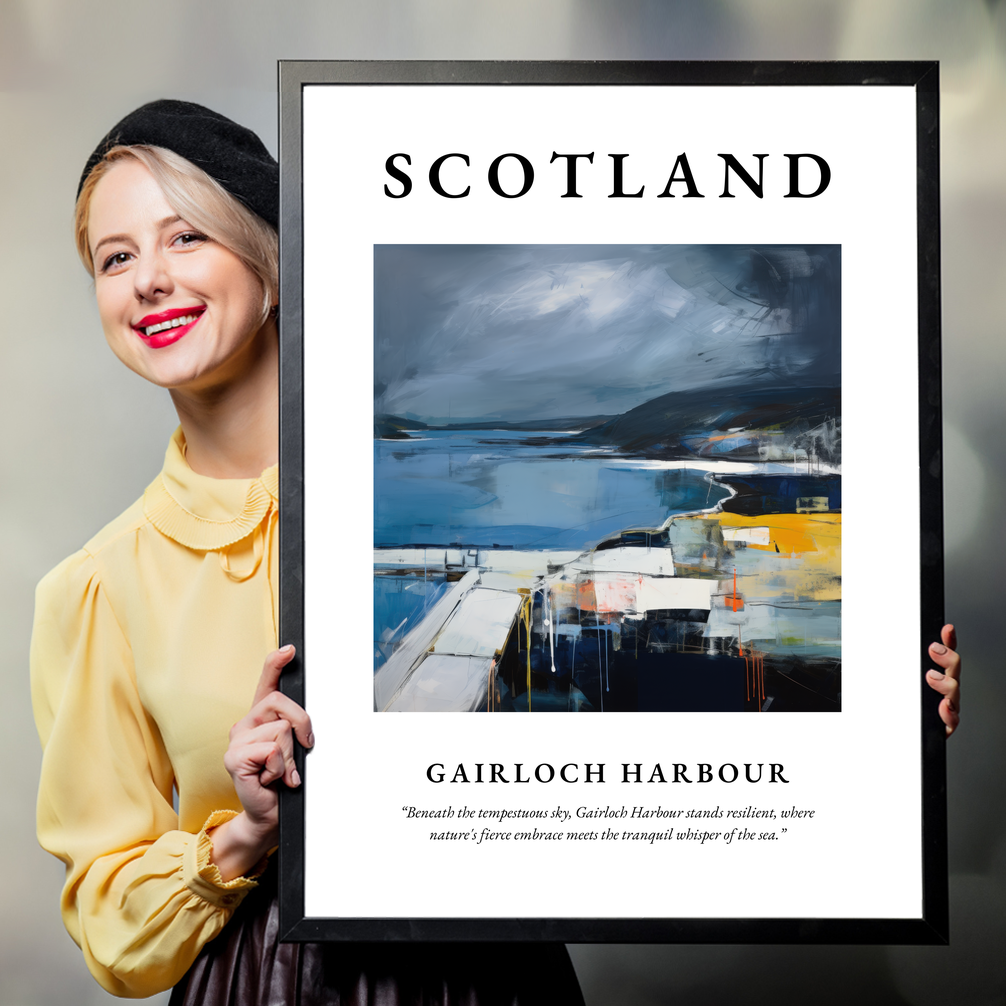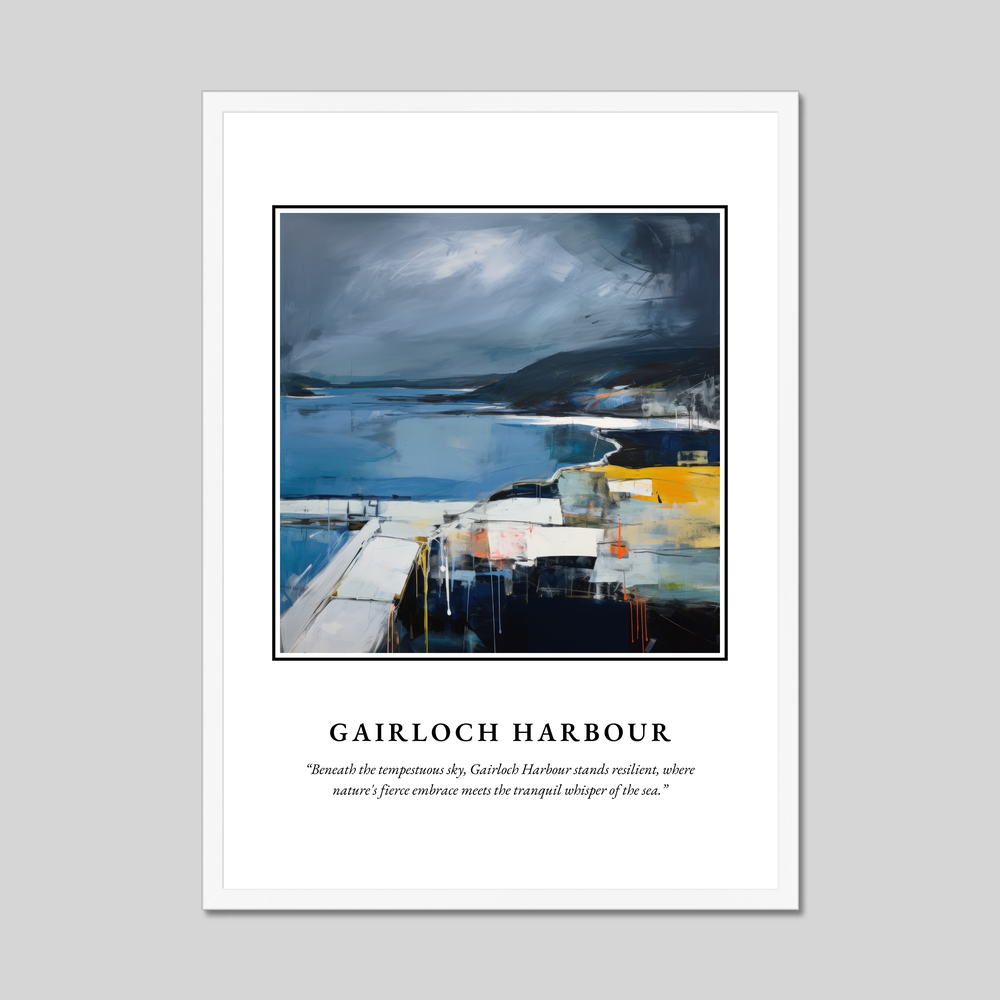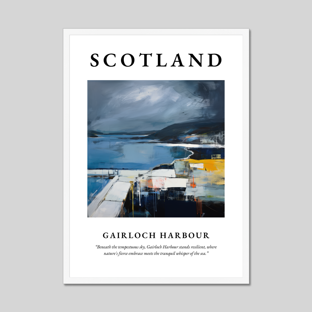 The poster's bold declaration of “SCOTLAND” invites you to journey into the heart of Abstract Impressionism, as the painting reveals the iconic harbour against a backdrop of tempestuous skies. The interplay of moody blues and greys with vibrant splashes of yellow and orange captures the dynamic tension between land and sea, perfectly reflecting the spirit of the Scottish landscape. Beneath this evocative visual stands the profound tribute, “Beneath the tempestuous sky, Gairloch Harbour stands resilient, where nature's fierce embrace meets the tranquil whisper of the sea,” encapsulating the harmonious yet wild essence of this beloved place.