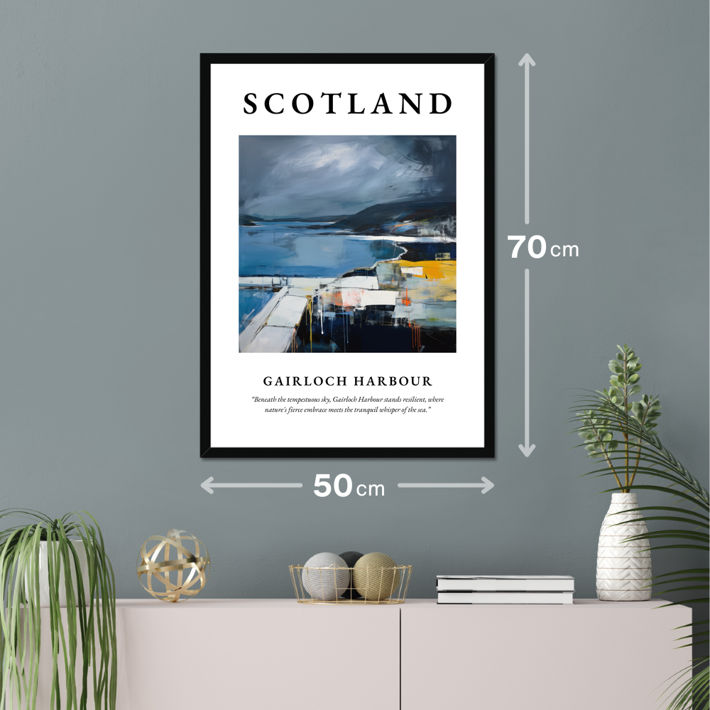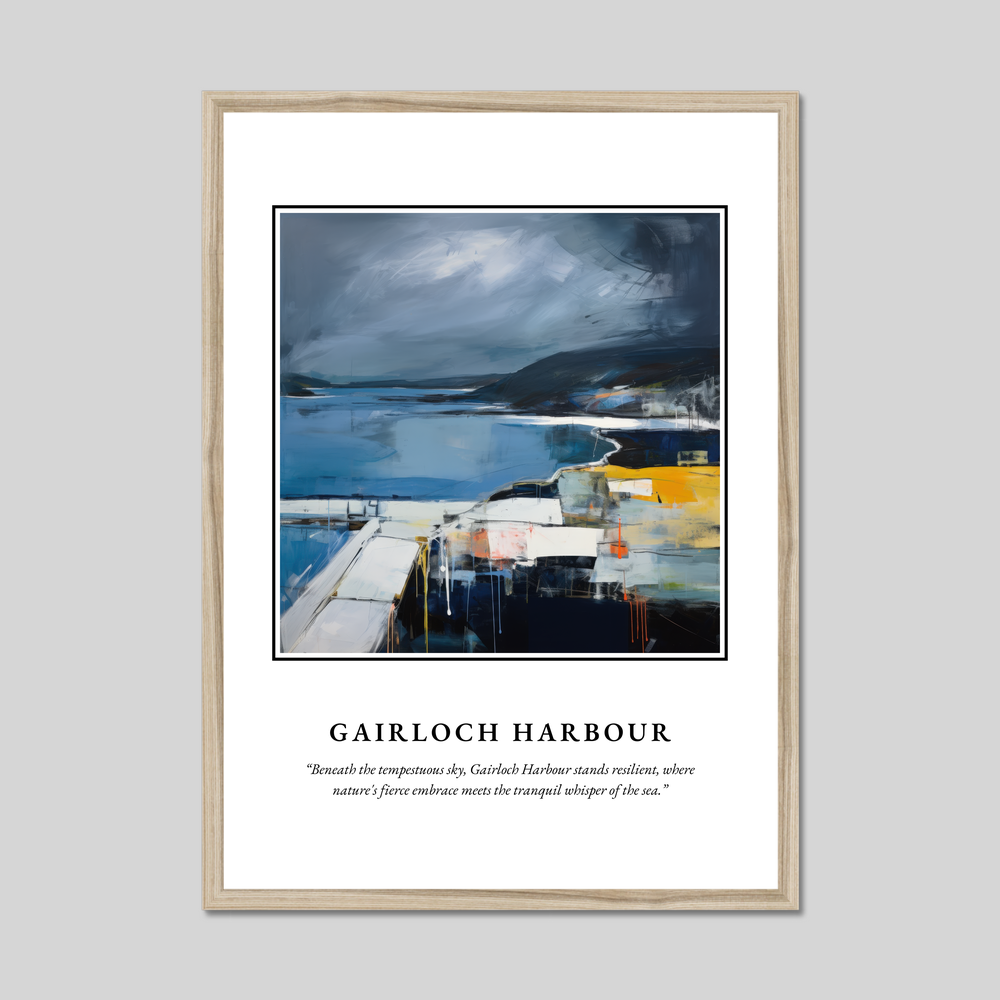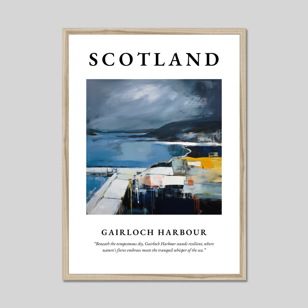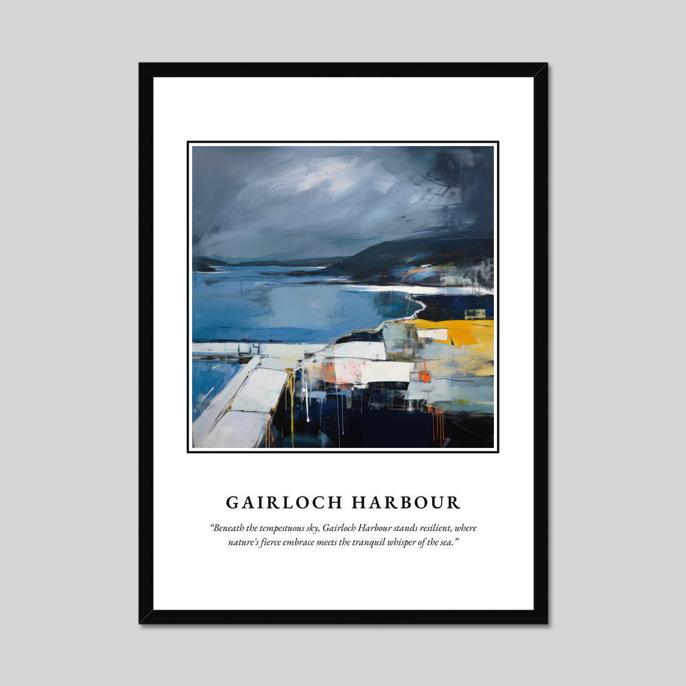 The poster's bold declaration of “SCOTLAND” invites you to journey into the heart of Abstract Impressionism, as the painting reveals the iconic harbour against a backdrop of tempestuous skies. The interplay of moody blues and greys with vibrant splashes of yellow and orange captures the dynamic tension between land and sea, perfectly reflecting the spirit of the Scottish landscape. Beneath this evocative visual stands the profound tribute, “Beneath the tempestuous sky, Gairloch Harbour stands resilient, where nature's fierce embrace meets the tranquil whisper of the sea,” encapsulating the harmonious yet wild essence of this beloved place.