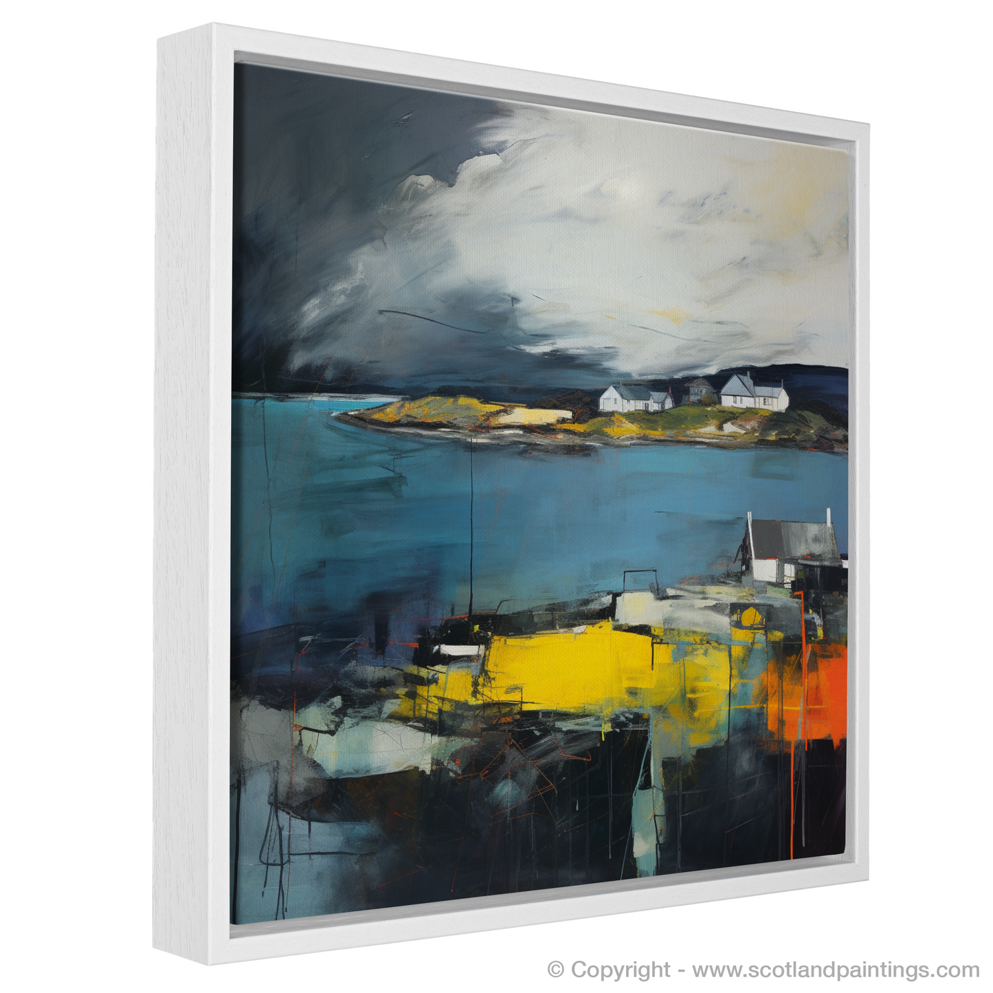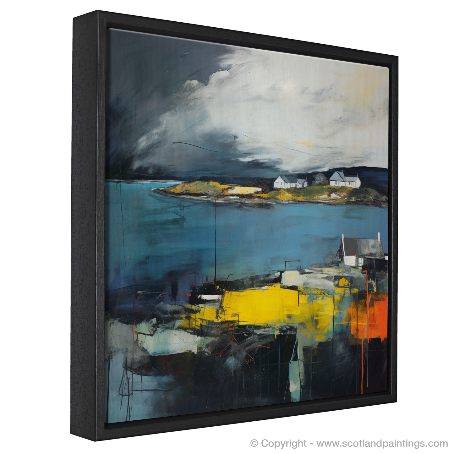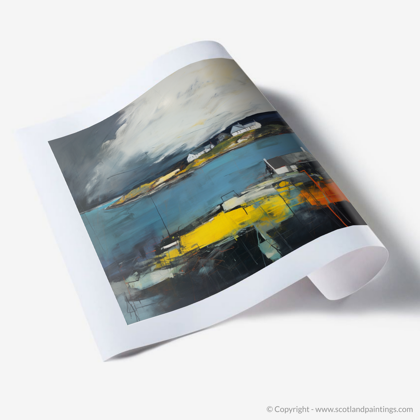 Immerse yourself in the kinetic energy of Gairloch Harbour, beautifully captured in a symphony of abstraction and impressionistic flair. This compelling piece merges turbulent emotion with serene beauty, as tempestuous cloud formations and whirling maelstroms loom over the serene Scottish coastline.