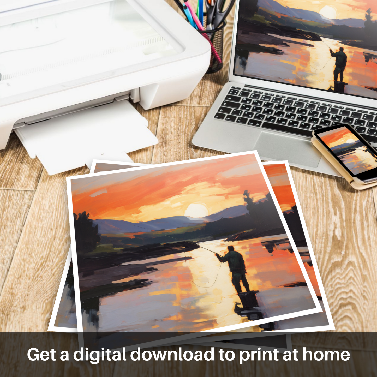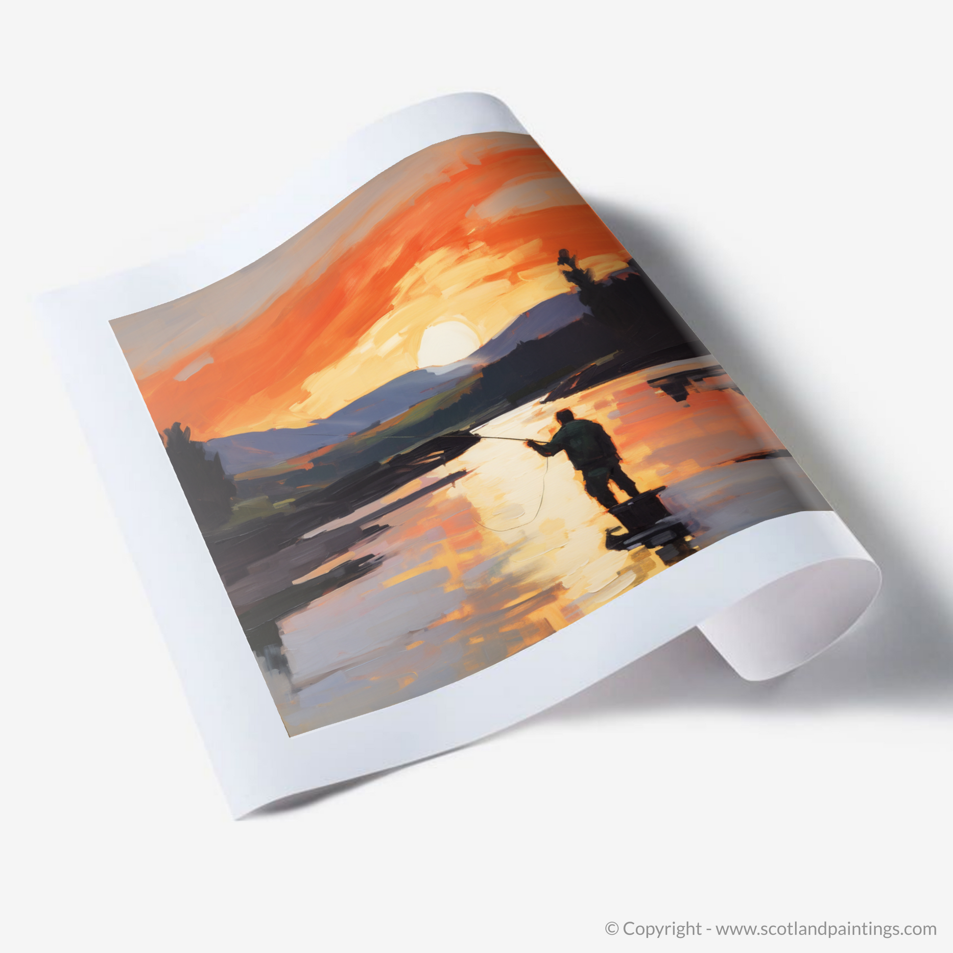 As the amber glow of the setting sun spills over the River Nith, our captivating print immortalises the tranquil essence of fly fishing in the heart of Scotland. A solitary figure stands midstream, his silhouette etched against the water's shimmering canvas, engaged in the time-honoured dance of casting and reeling. The reflection of the day's last light bathes the scene in a spectrum of fiery oranges and mellow yellows, which bleed seamlessly into the tranquil blues and purples of the distant hills.