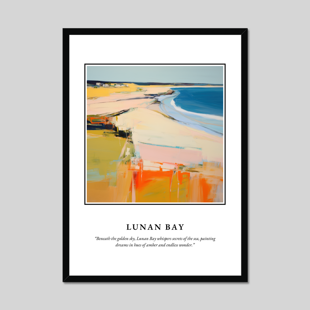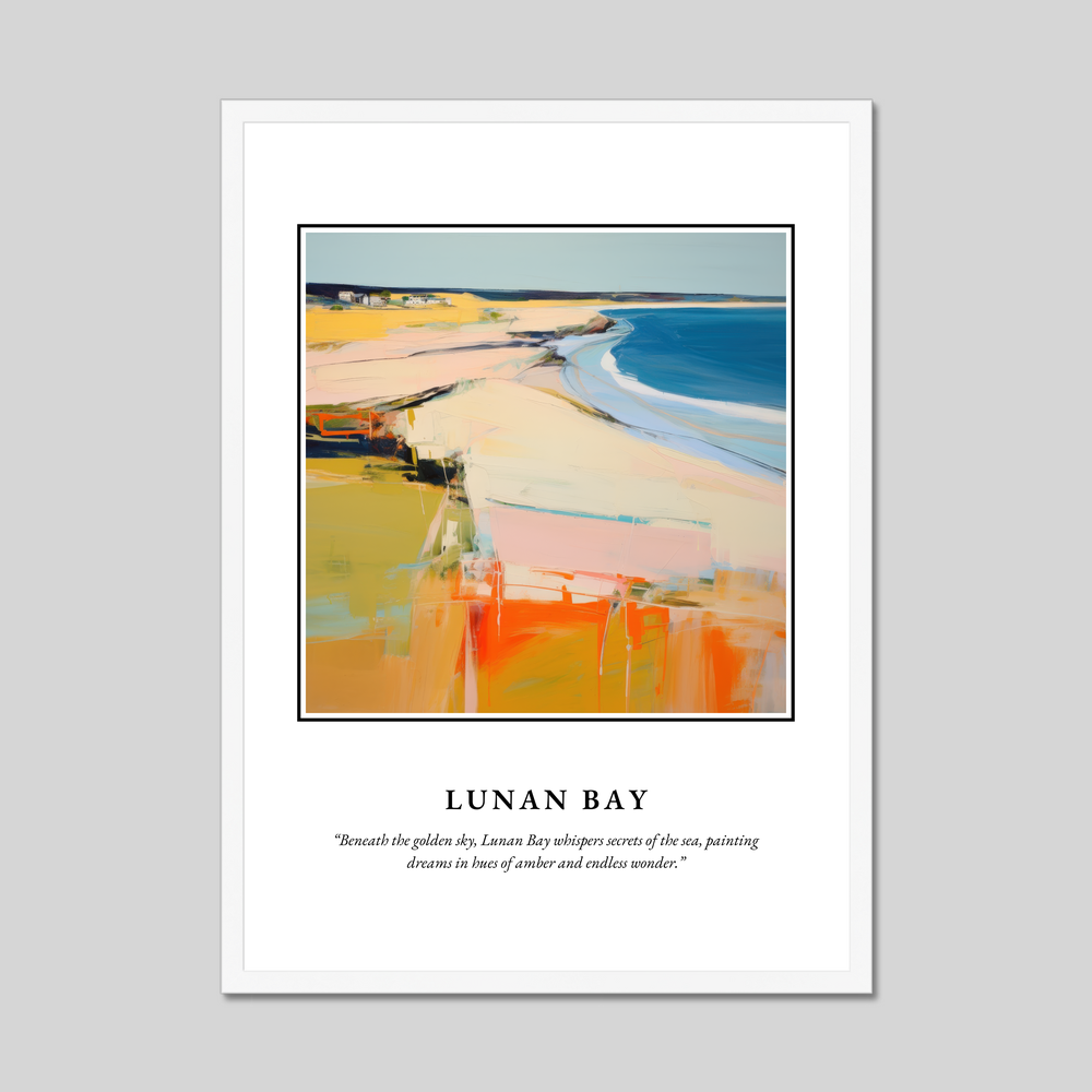Lunan Bay, a hidden gem on Scotland's east coast, is renowned for its expansive sandy beach framed by steep dunes and rugged cliffs. The bay's tranquillity and beauty have a timeless allure, as captured in this artwork. The vibrant portrayal reflects the bay’s natural palette—golden sands, calming blues, and the fleeting blaze of sunset reflected on the waters. It’s a place where land meets sea in a poetic embrace and whispers its stories on the breeze.