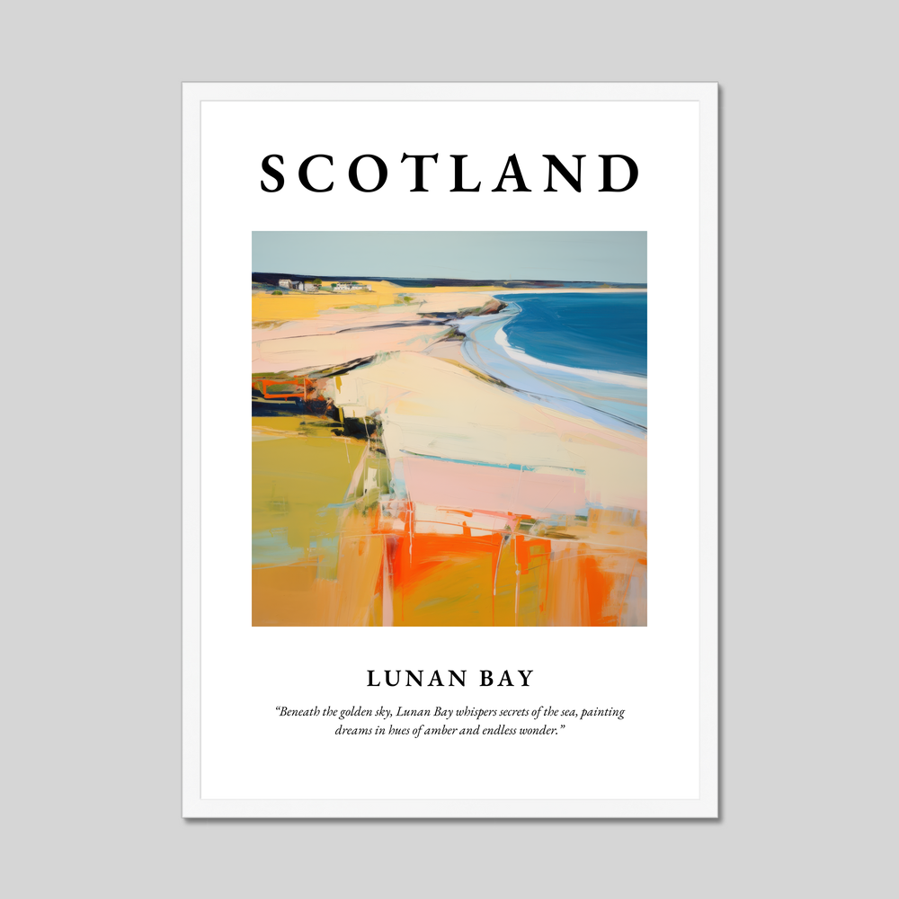 Boldly emblazoned with the word “SCOTLAND” at the top, this poster invites you to explore a world of art and wonder. Below, an enthralling painting of Lunan Bay captures the imagination with its Abstract Impressionism style. The brushstrokes create a symphony of colours, mirroring the ever-changing moods of the sky and sea. Swirls of blue meld seamlessly with sandy tones, conjuring the gentle ebb and flow of the tides, while vibrant hints of amber and orange invite warmth and intrigue.
