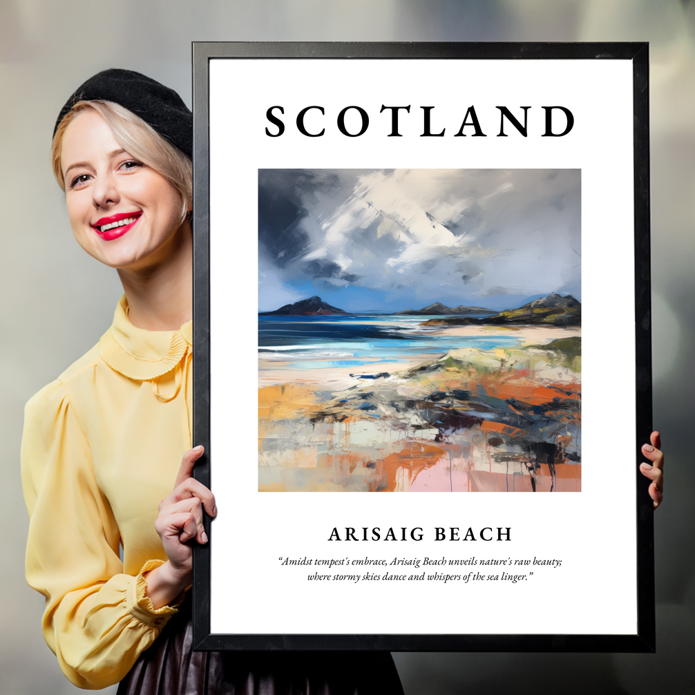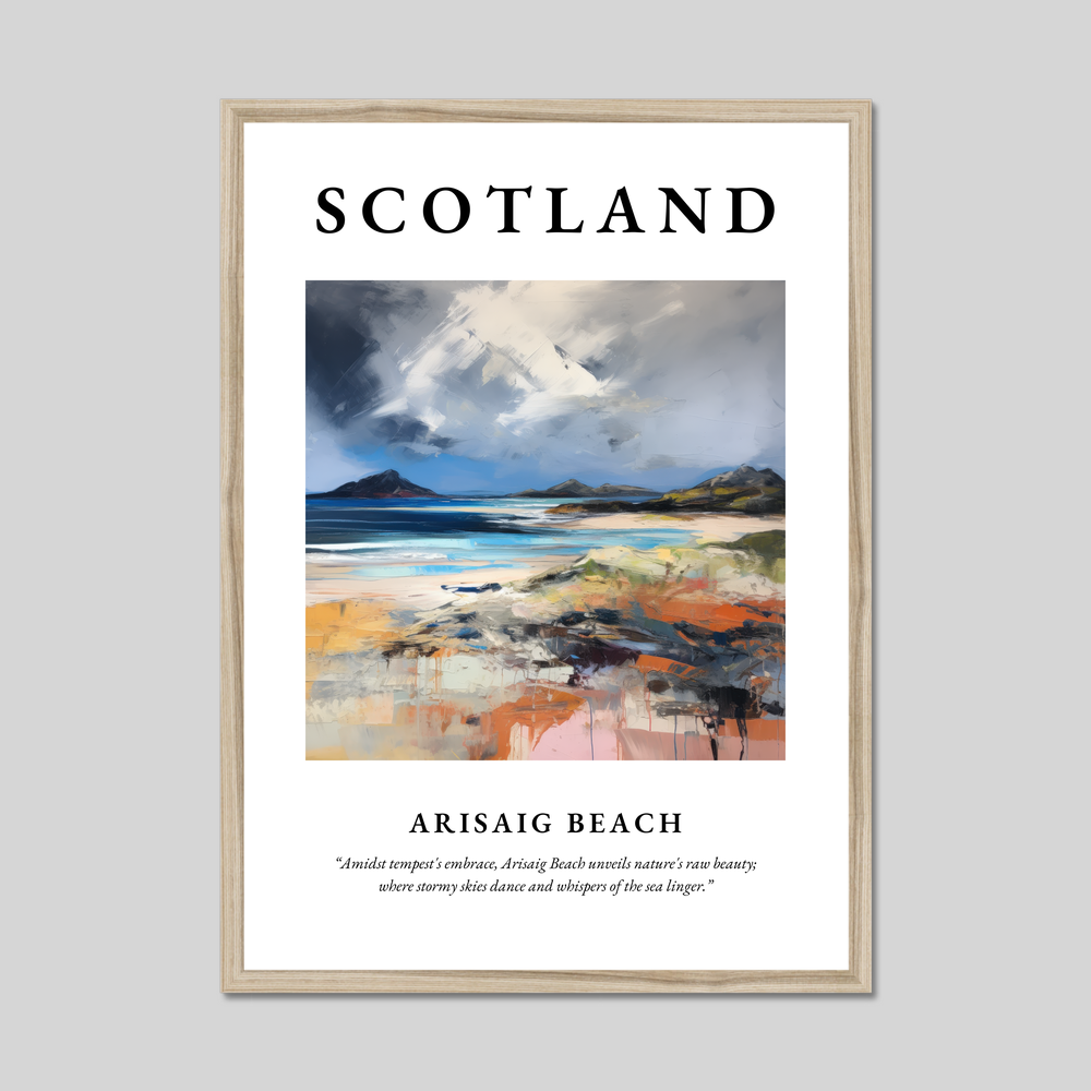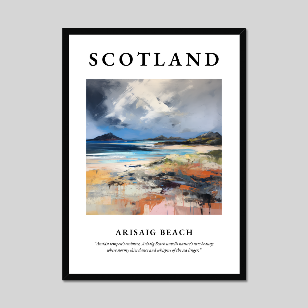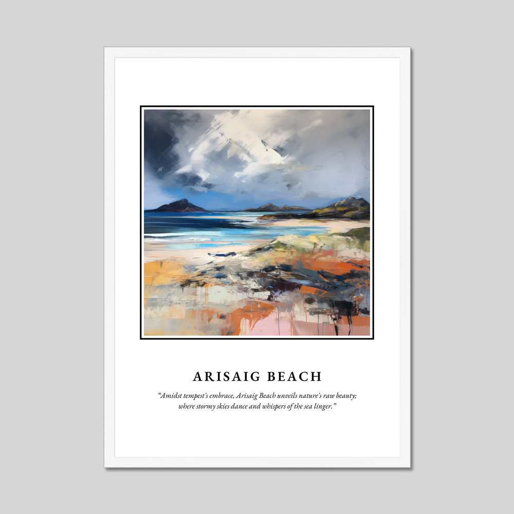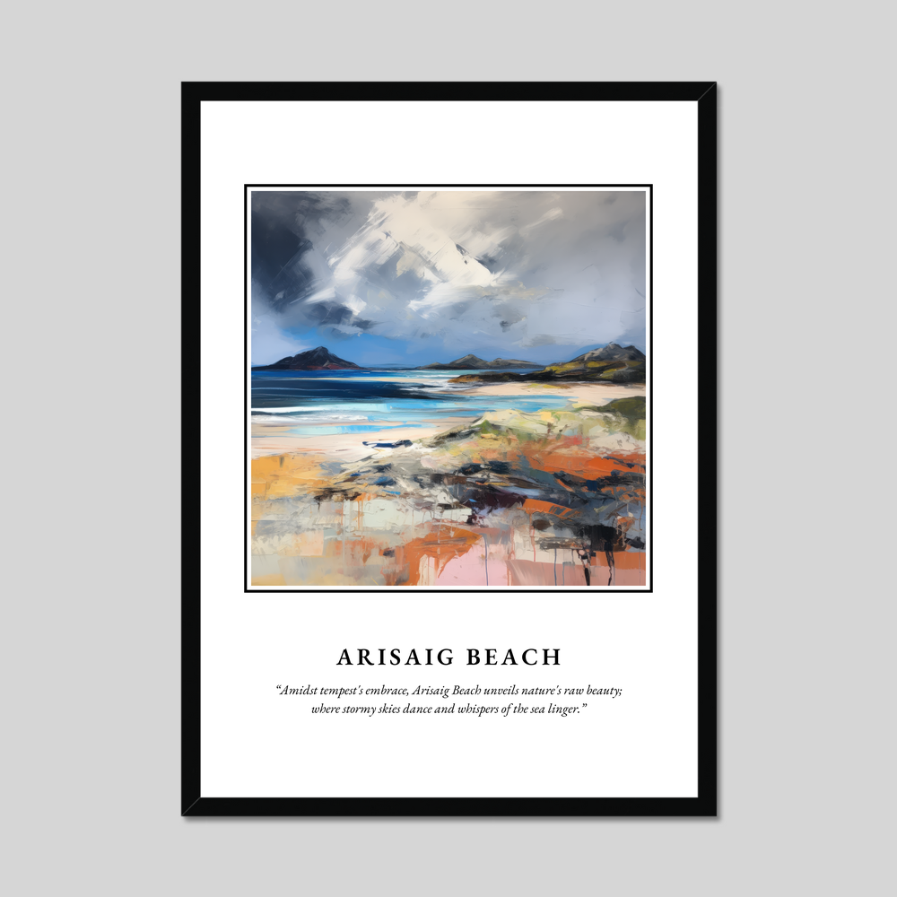 Arisaig Beach, nestled on Scotland’s west coast, is a place of breathtaking beauty and tranquility. Known for its white sandy beaches and turquoise waters, it offers a stark contrast to the dramatic hills and rocky shores that surround it. This piece captures the very spirit of Arisaig Beach, where the ever-changing weather paints its own masterpiece across the sky, and where the whispers of ancient tales seem to linger in the air. Whether you have walked its shores or dream of doing so, this artwork brings the spirit of Arisaig Beach into your home, a reminder of nature's raw, untouched magnificence.