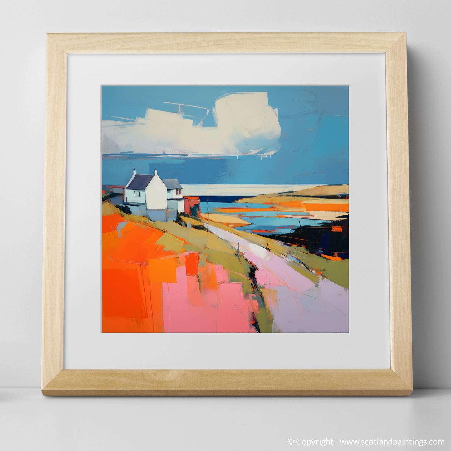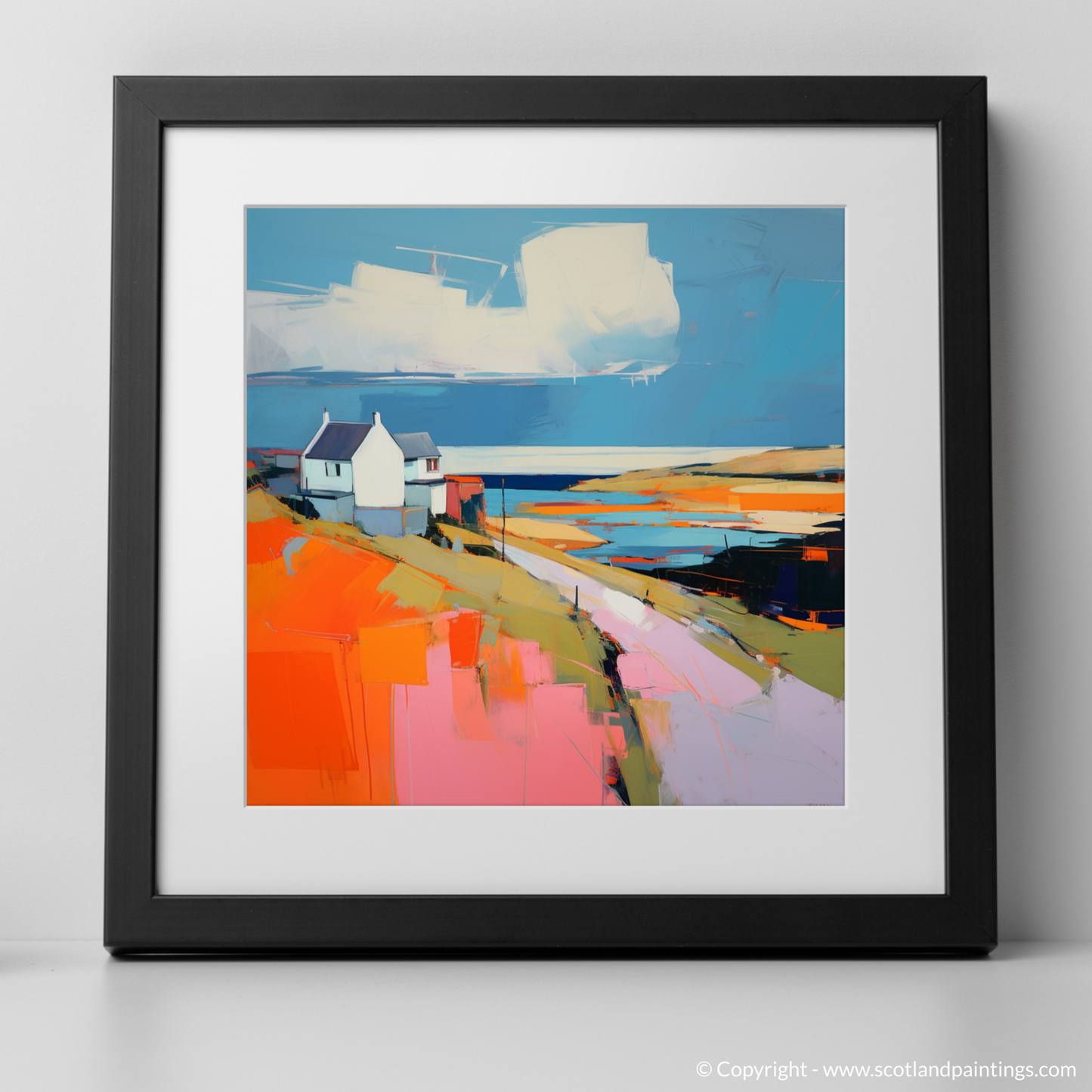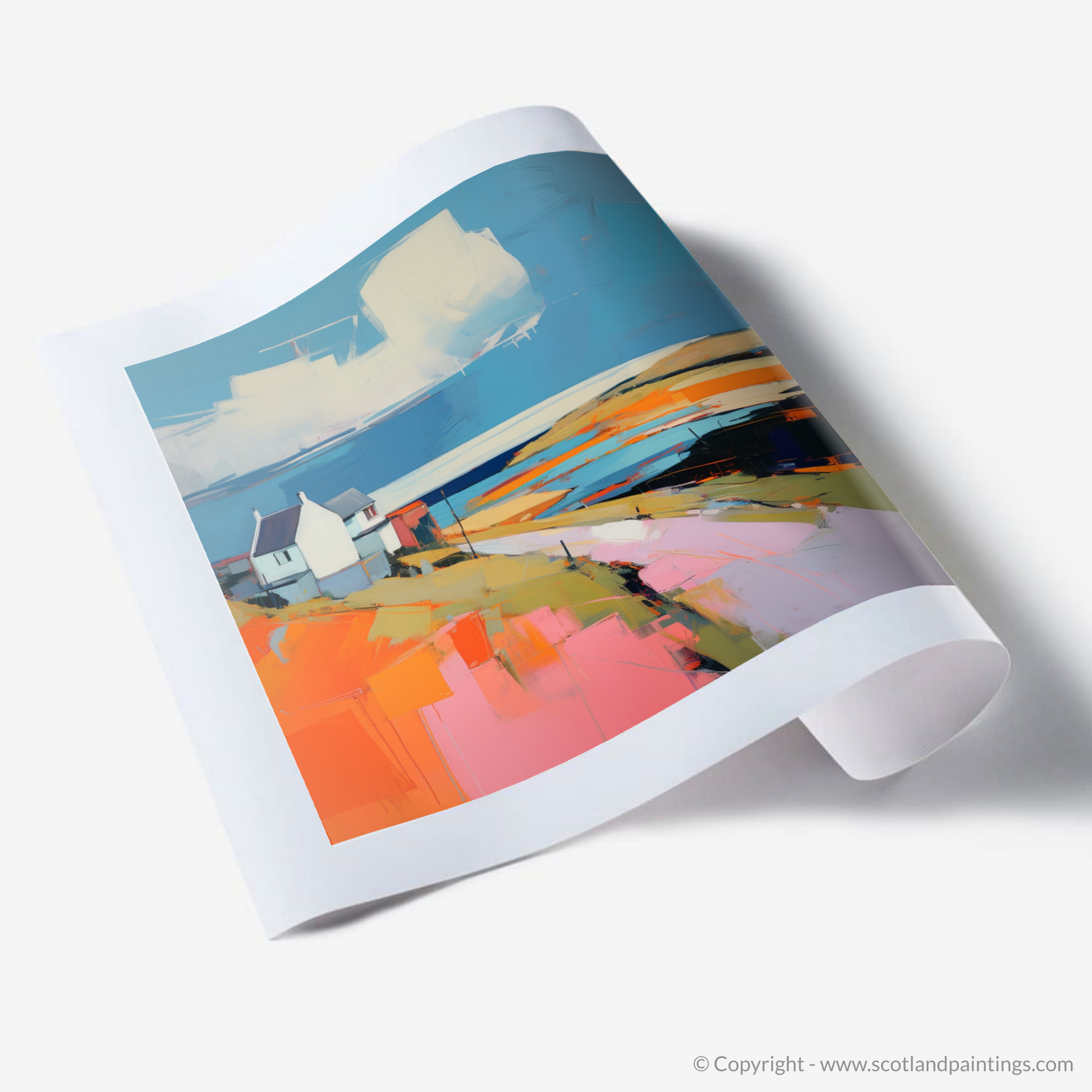 Capturing the vibrant essence of Cullen, Moray, this evocative print emanates a breath of contemporary charm with its striking use of colour and abstract form. The composition boasts bold strokes and an eclectic palette, reminiscent of the vivacious nature of this beloved Scottish village. The scene is centred around a pair of white houses with stoic, clean lines that stand out against the multi-hued landscape.