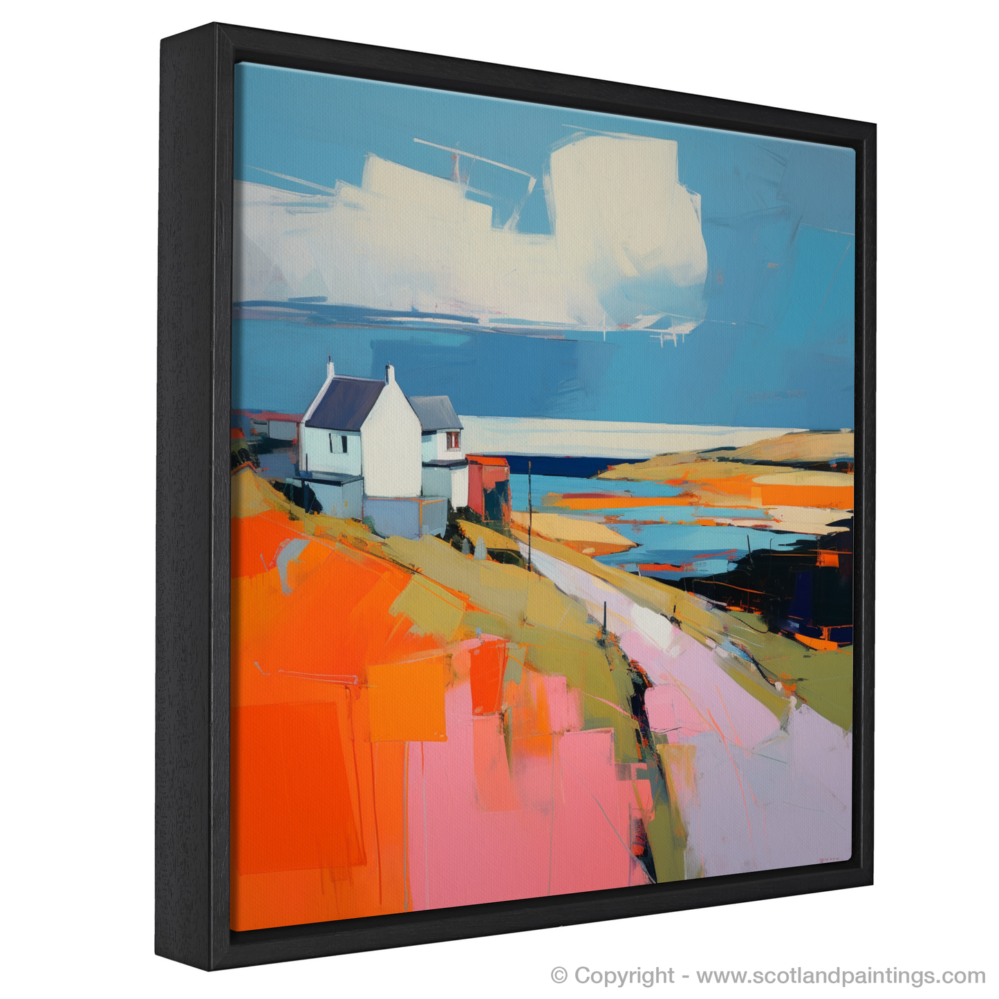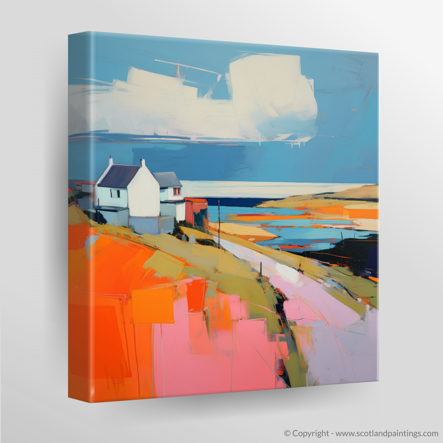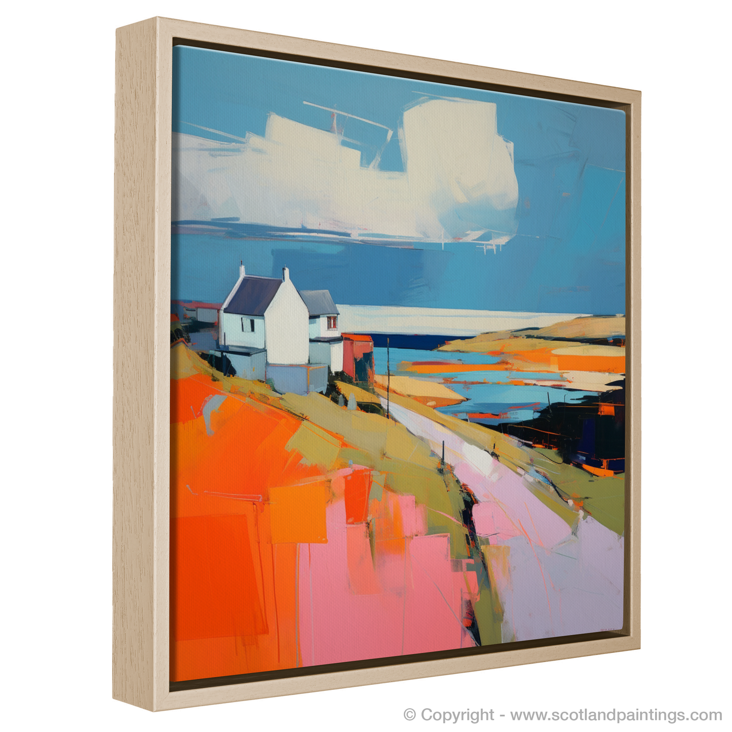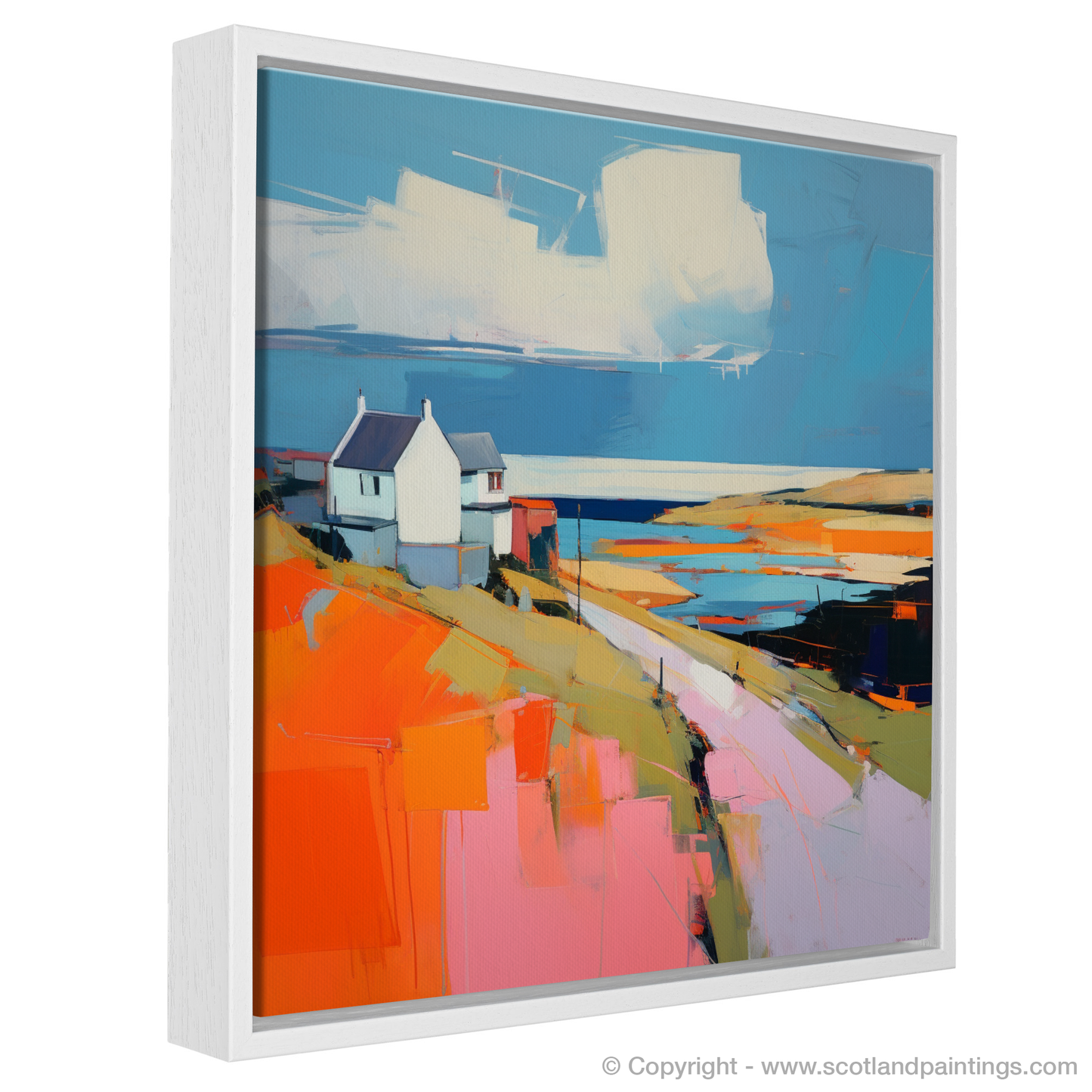 Capturing the vibrant essence of Cullen, Moray, this evocative print emanates a breath of contemporary charm with its striking use of colour and abstract form. The composition boasts bold strokes and an eclectic palette, reminiscent of the vivacious nature of this beloved Scottish village. The scene is centred around a pair of white houses with stoic, clean lines that stand out against the multi-hued landscape.