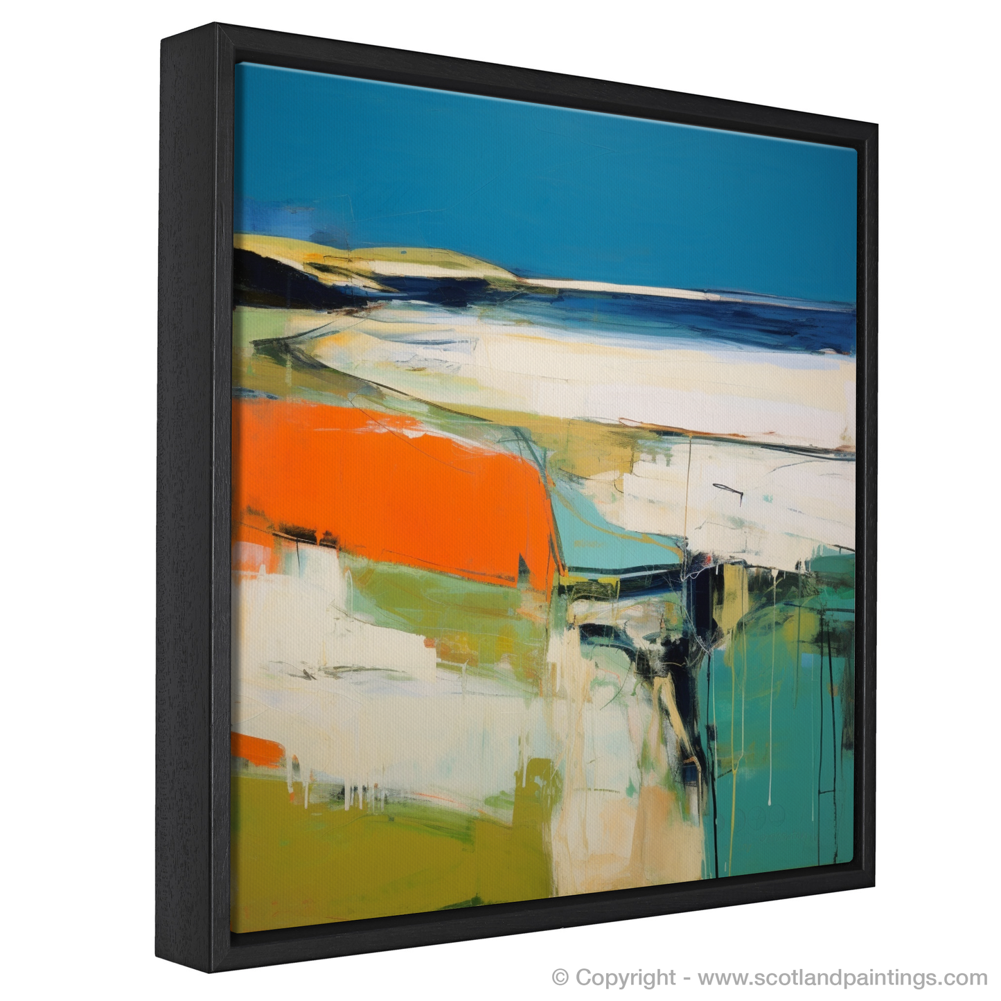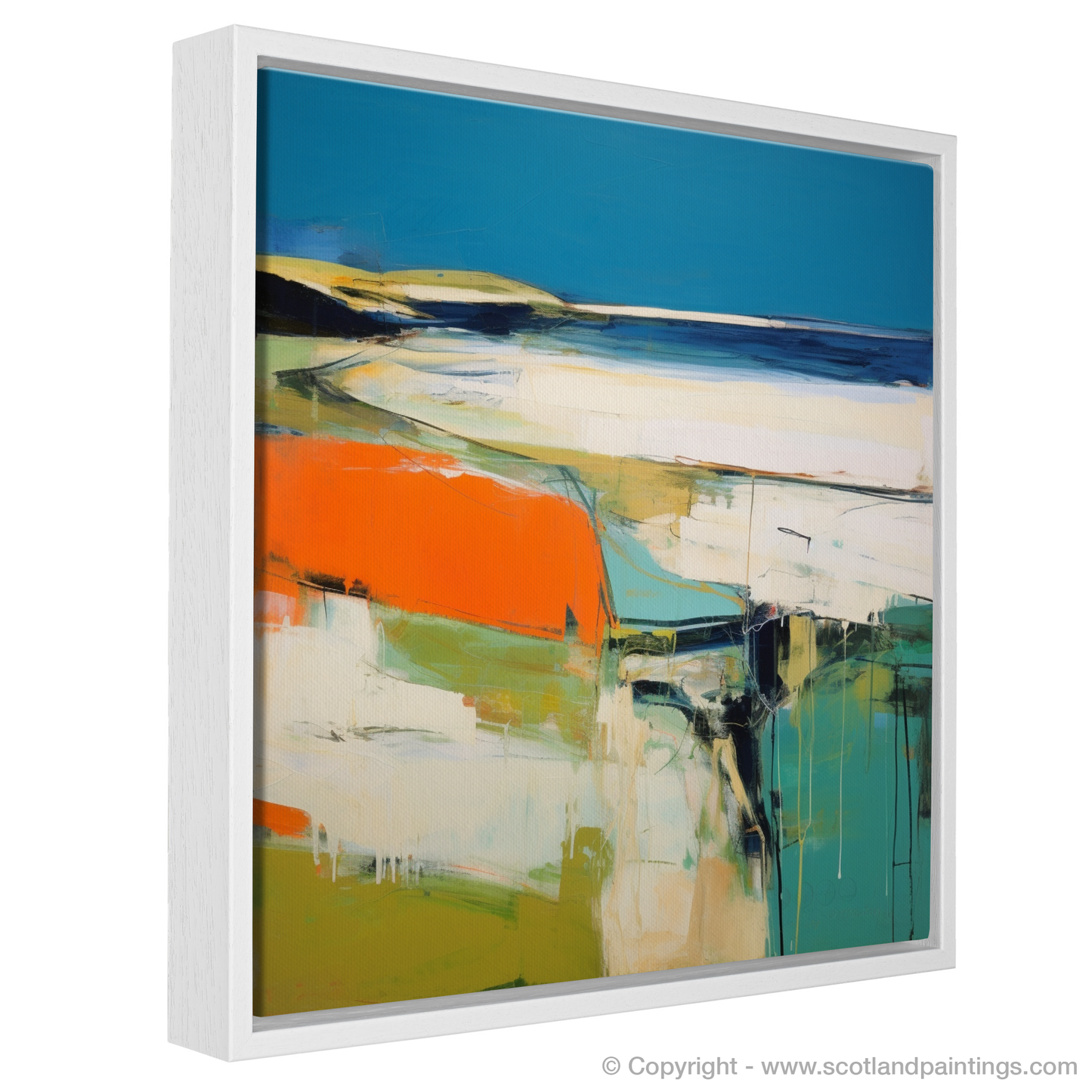 Immerse yourself in the ethereal charm of Scotland's rugged coastline with our striking print. Elusive and evocative, the artwork captures the raw beauty of a Scottish beach through the unique lens of Abstract Impressionism. Swathes of cerulean blue, crisp white, and deep navy mingle on the canvas, suggesting the ebb and flow of the tides against the shore. Vivid orange accents inject a bold contrast, reminiscent of striking sunsets or perhaps the vibrant lichens that dot the coastal rocks.