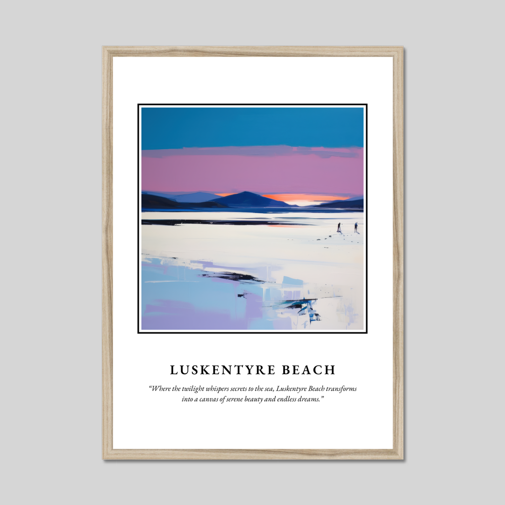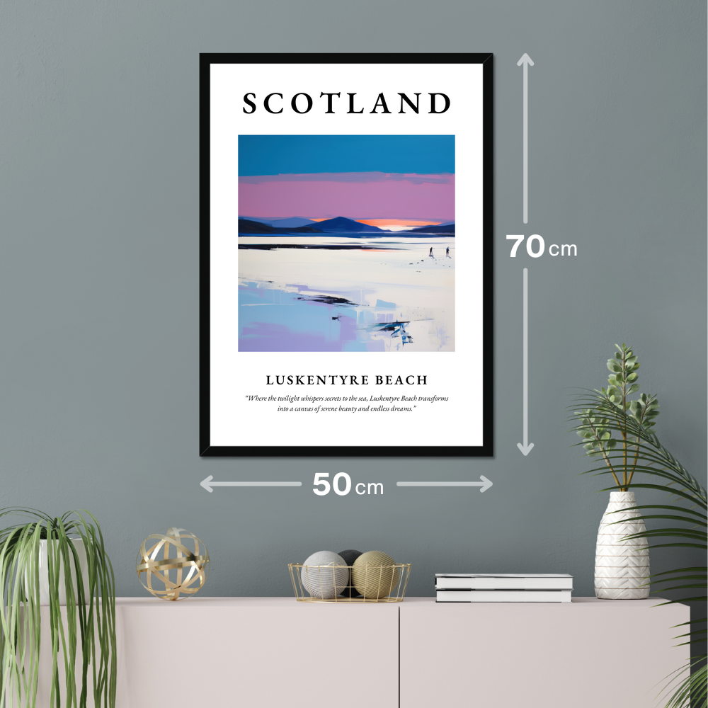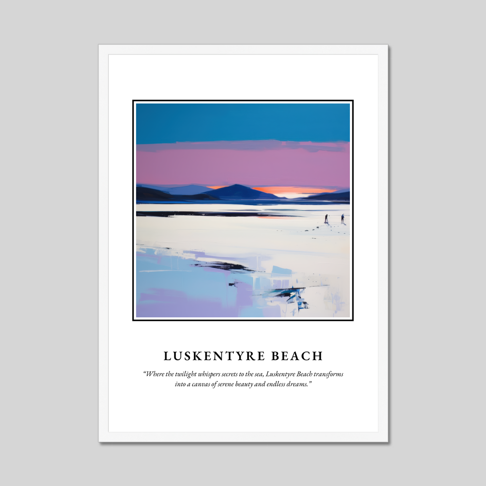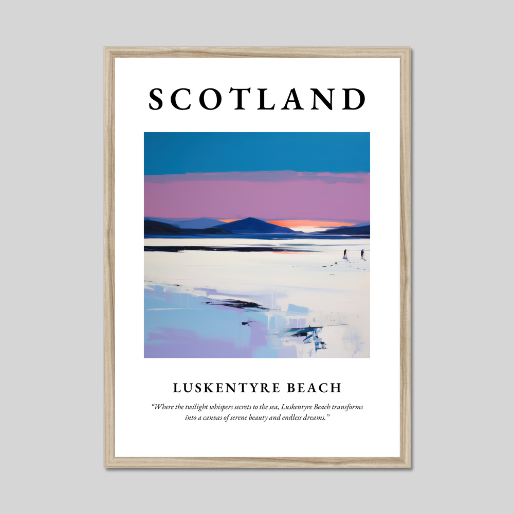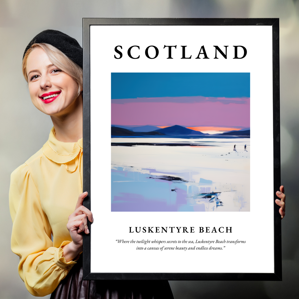 The poster prominently features "SCOTLAND" in bold lettering, signalling pride and timeless beauty. Below, a contemporary painting of Luskentyre Beach captures the viewer's imagination with its vivid hues and graceful lines. The atmospheric artwork conveys the tranquillity of this enchanting location, where land meets the sea under a sky that whispers in twilight tones. The serene scene is punctuated by the quote, “Where the twilight whispers secrets to the sea, Luskentyre Beach transforms into a canvas of serene beauty and endless dreams,” inviting onlookers to lose themselves in its dreamlike quality.