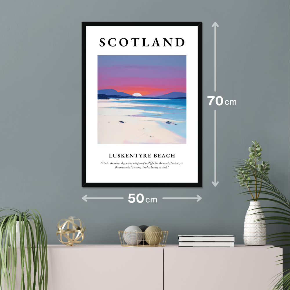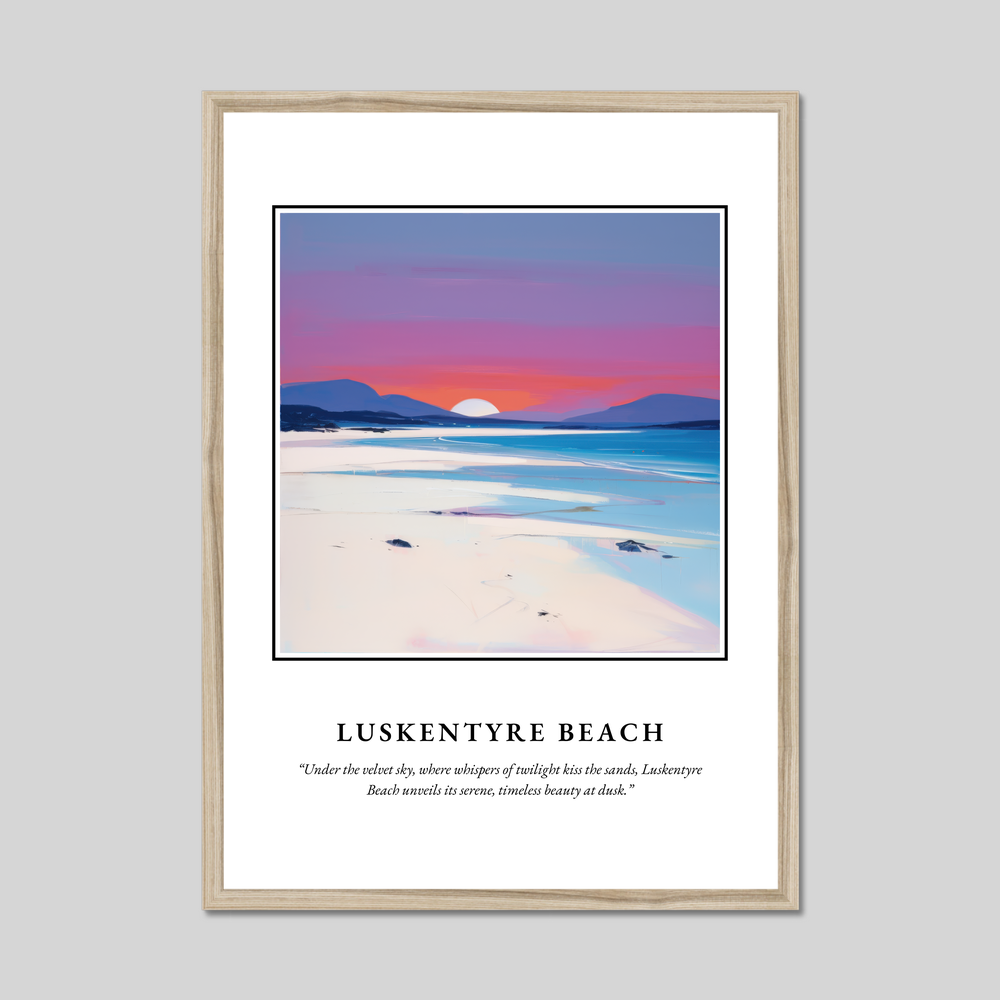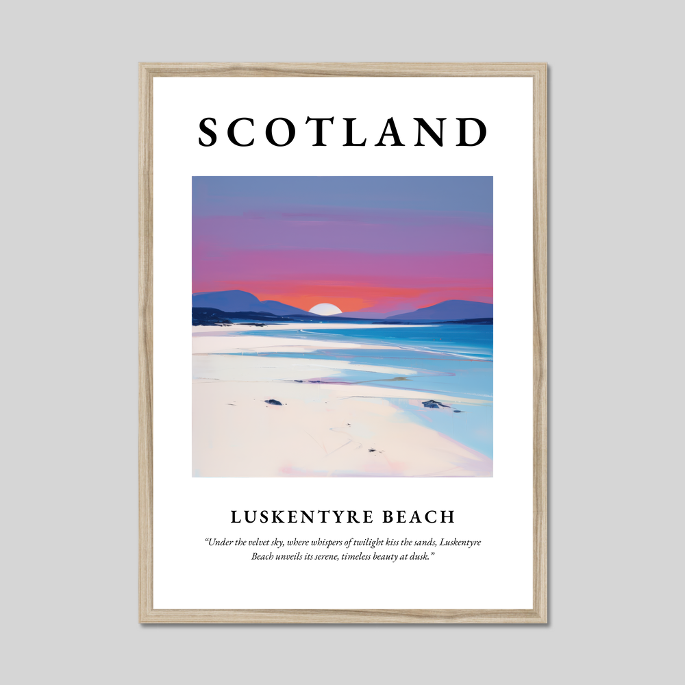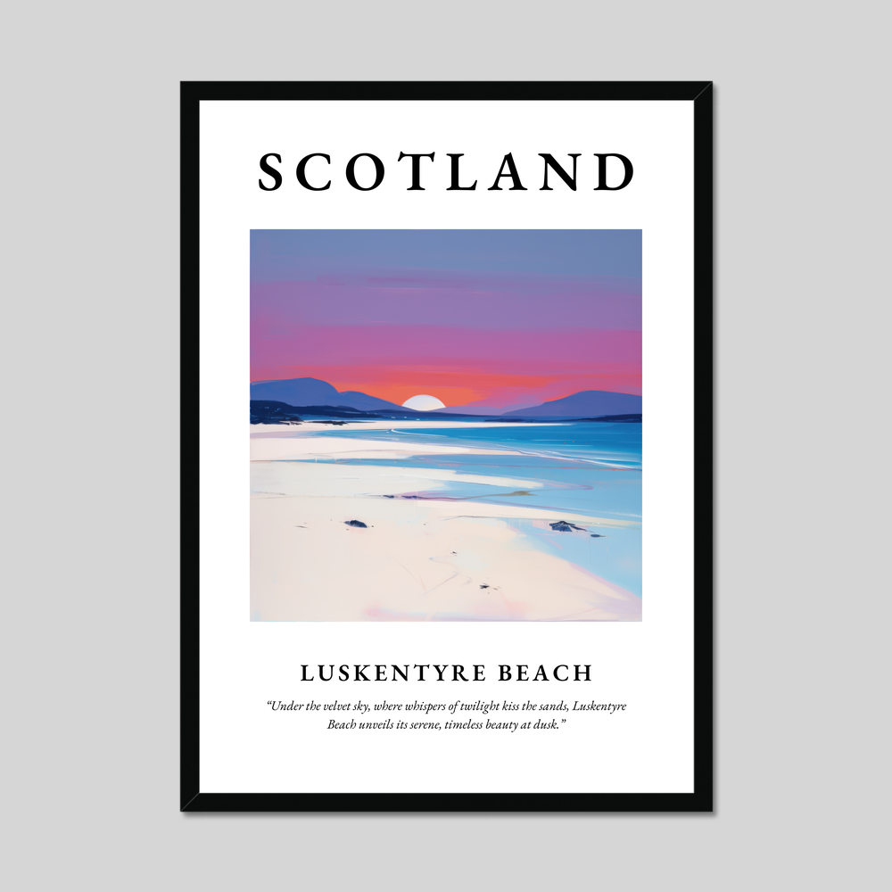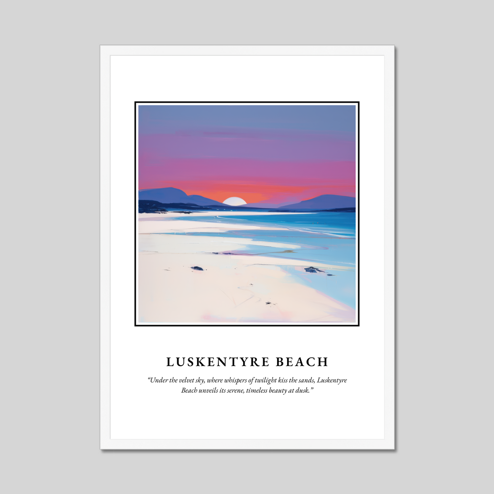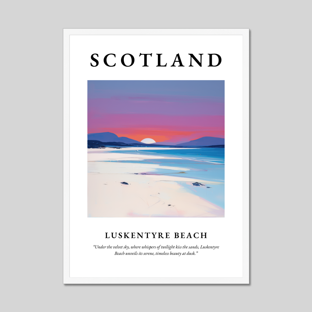 The poster eloquently presents the word “SCOTLAND” in bold lettering, immediately setting the stage for the breathtaking view below. The contemporary painting encaptures the serene beauty of Luskentyre Beach at dusk, featuring an enchanting sunset that bathes the sands in a warm, ethereal glow. Wisps of delicate clouds ripple over a velvety twilight sky, blending harmoniously with the gentle colours of the sea and the beach. Below this captivating scene, the quote “Under the velvet sky, where whispers of twilight kiss the sands, Luskentyre Beach unveils its serene, timeless beauty at dusk.” invites you to reflect on the timeless elegance of this Scottish gem.