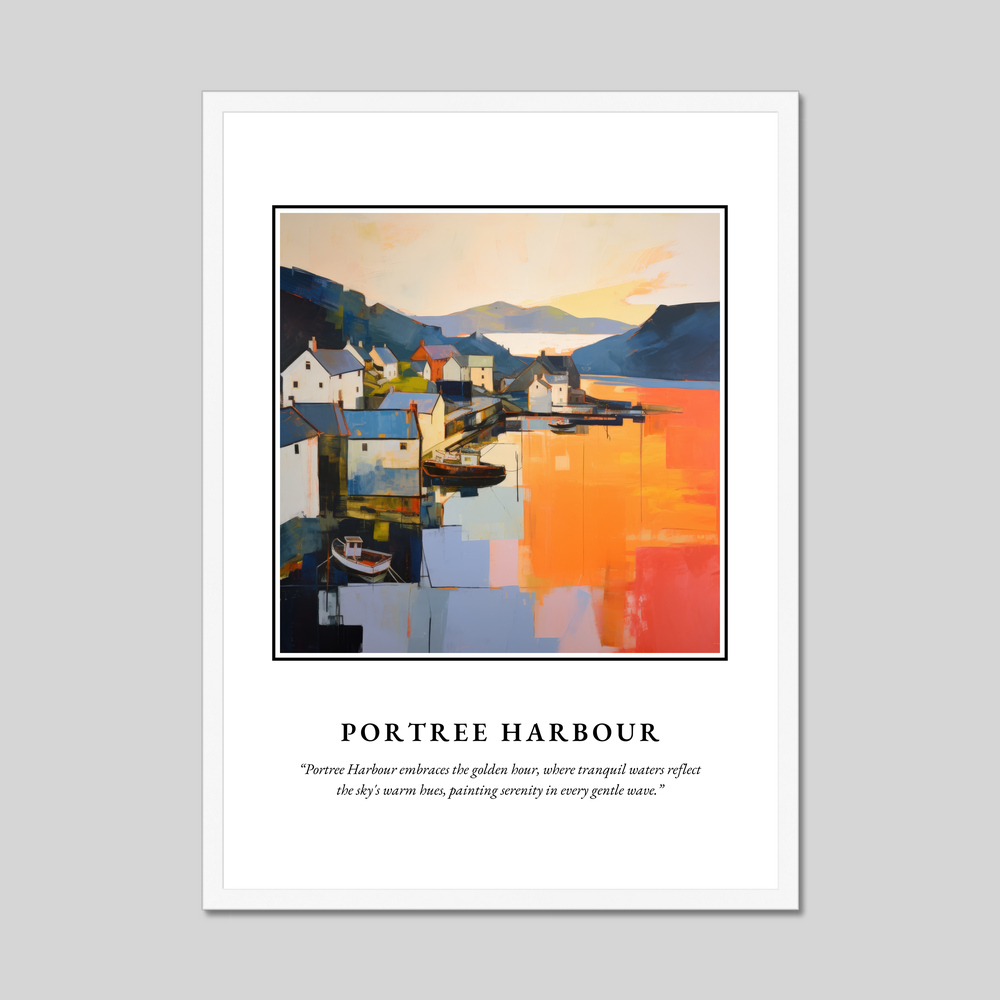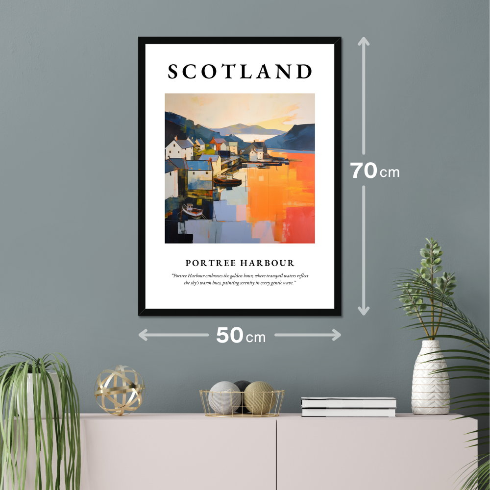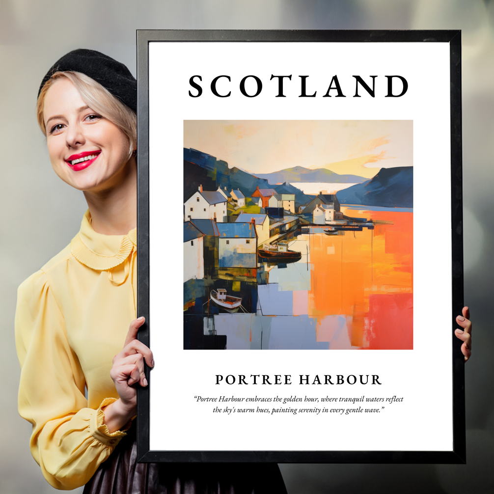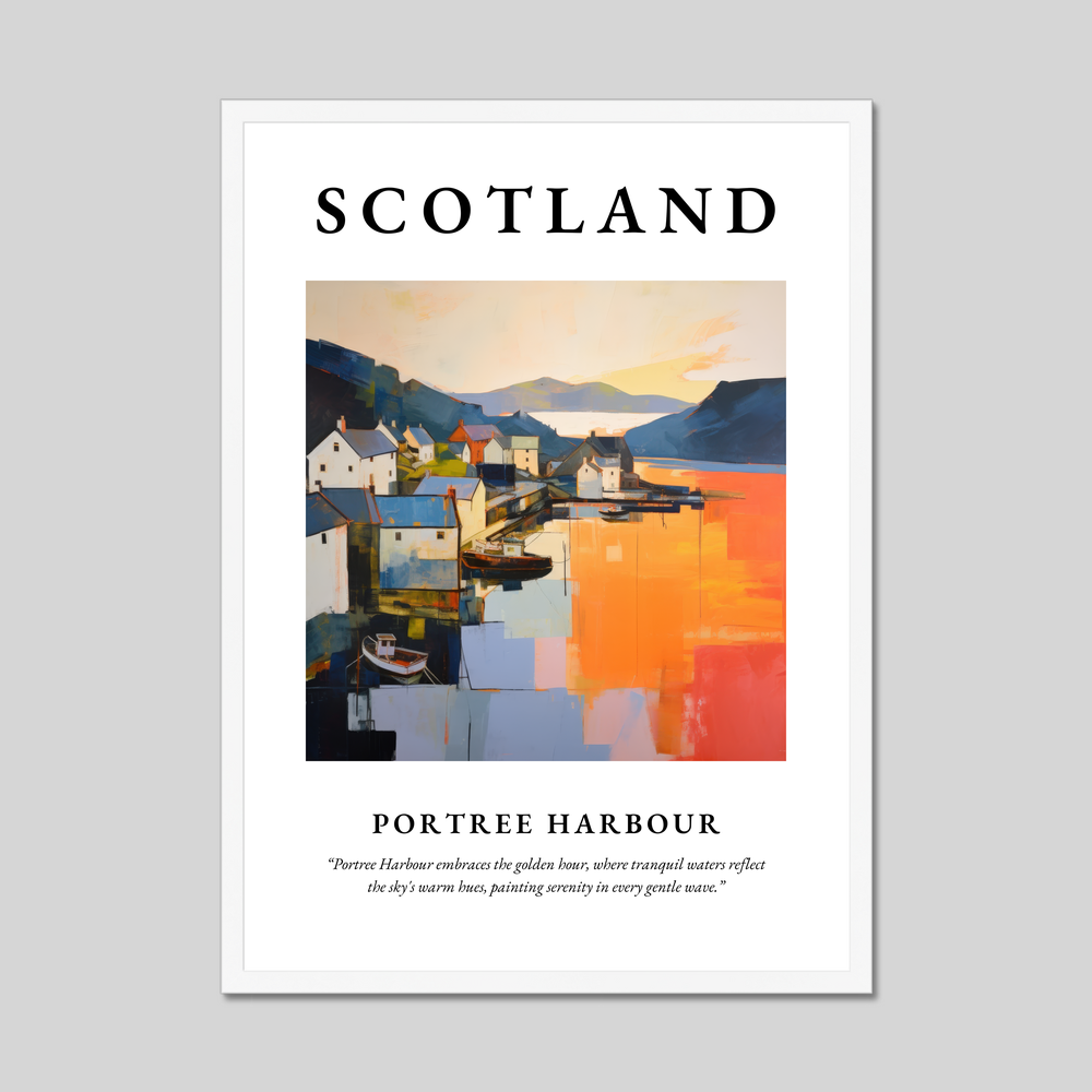 Beneath the painting, the quote “Portree Harbour embraces the golden hour, where tranquil waters reflect the sky's warm hues, painting serenity in every gentle wave.” resonates with anyone who has visited this picturesque location or simply dreams of its allure. This large-format poster covers an expansive wall area, offering an affordable way to bring a slice of Scotland into your home.