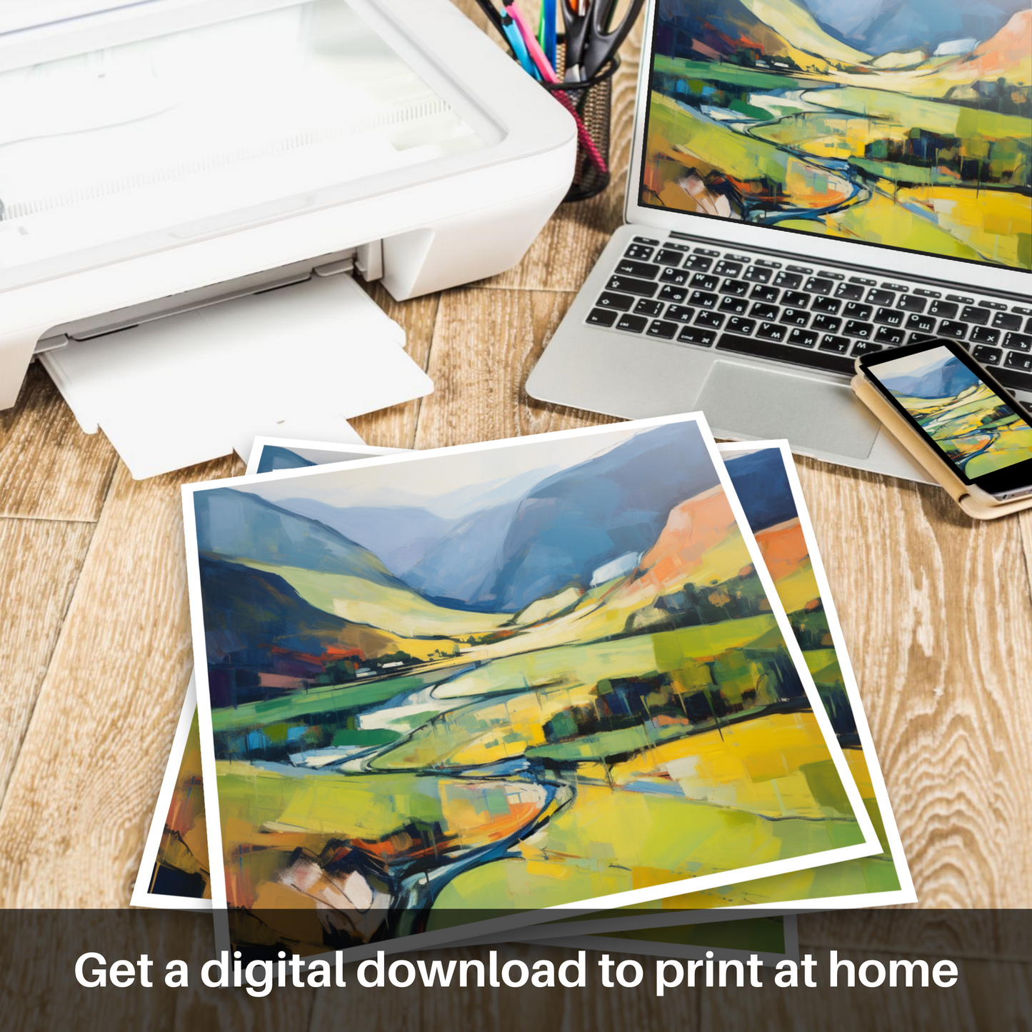 Immerse yourself in the vibrant essence of summer as captured in the rolling valleys of the Scottish Highlands. This evocative piece, inspired by Glen Nevis, is a perfect embodiment of abstract impressionism, where every stroke brings to life the lush verdure and the tranquil atmosphere of this picturesque locale.