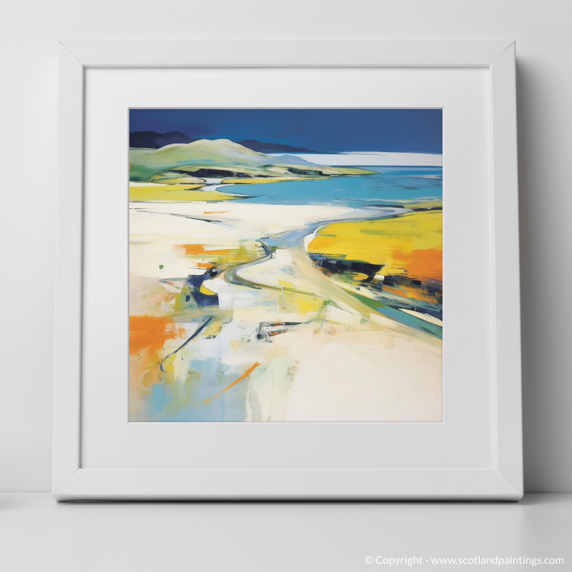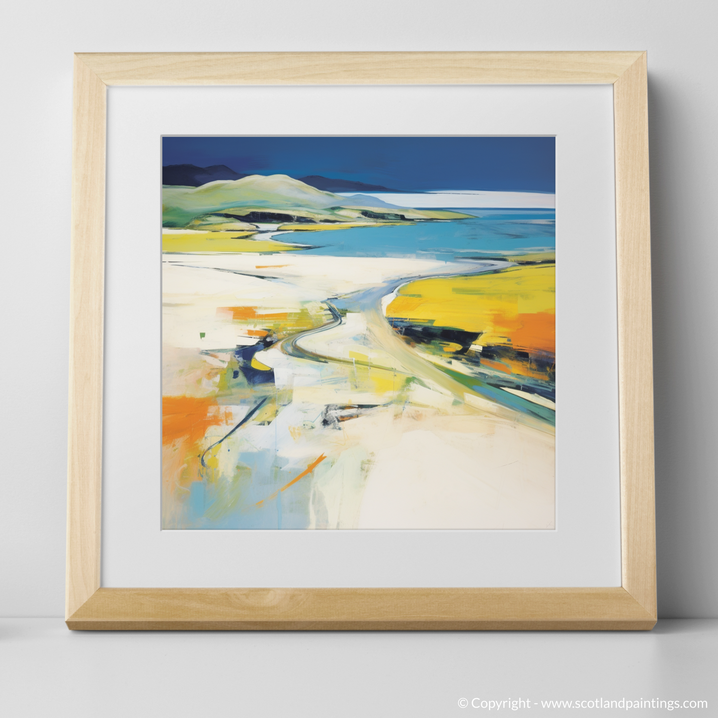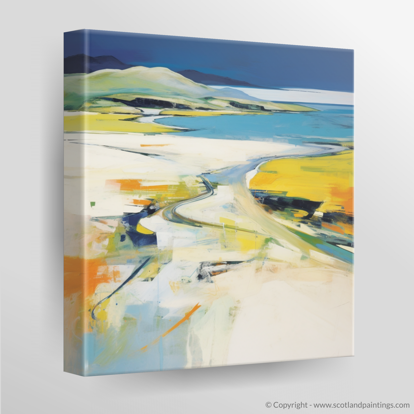 Vibrant yellows and cool blues dominate the palette, suggesting the warmth of sunlight on open sands and the gentle caress of ocean waters. Broad, sweeping brushstrokes convey the expansive sky, while dappled colours and bold lines juxtapose to evoke the rugged terrain and wild beaches synonymous with Scotland's natural grandeur.