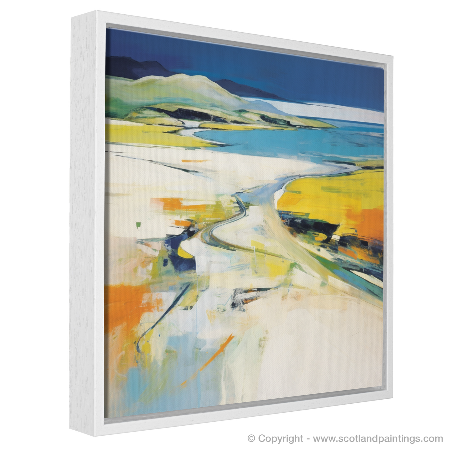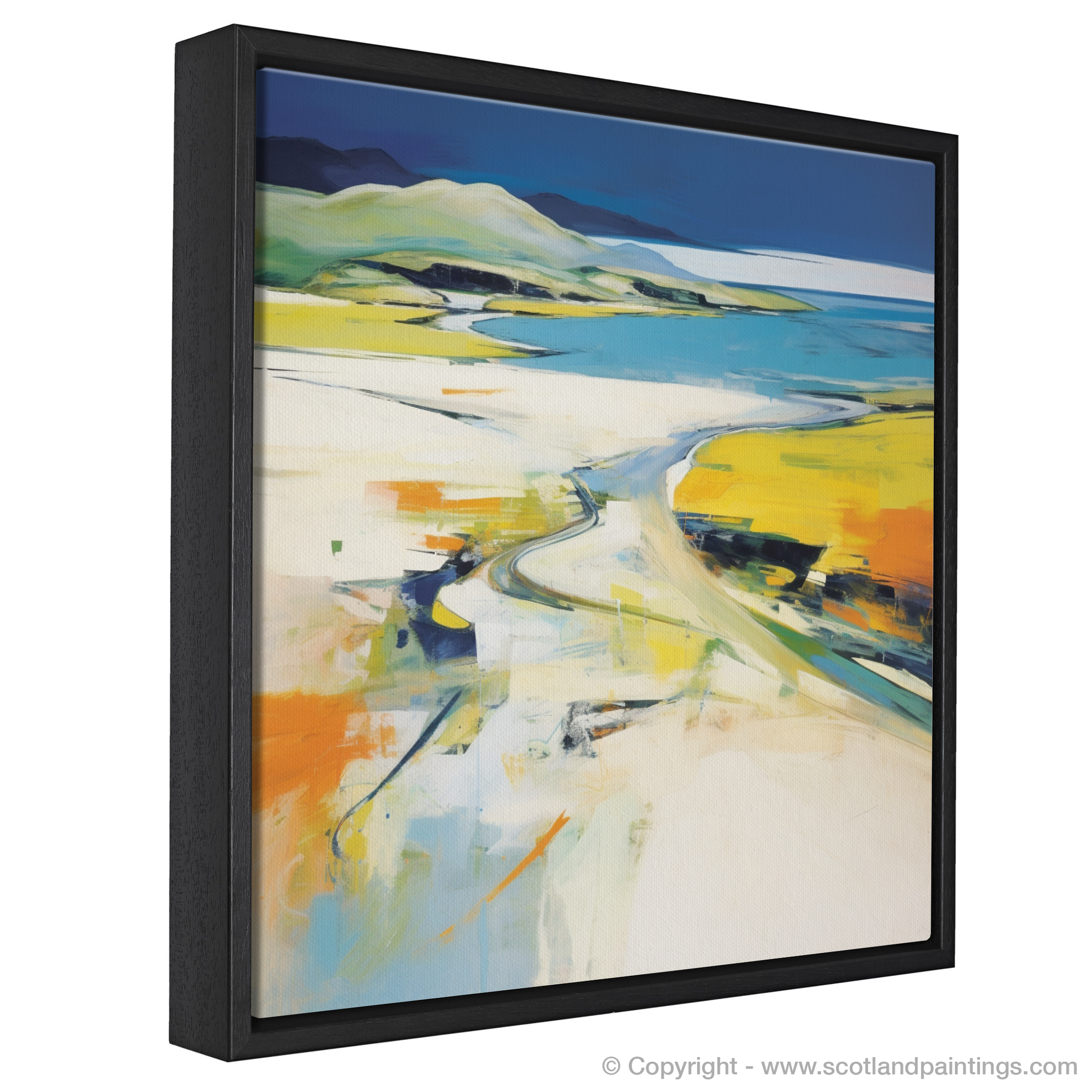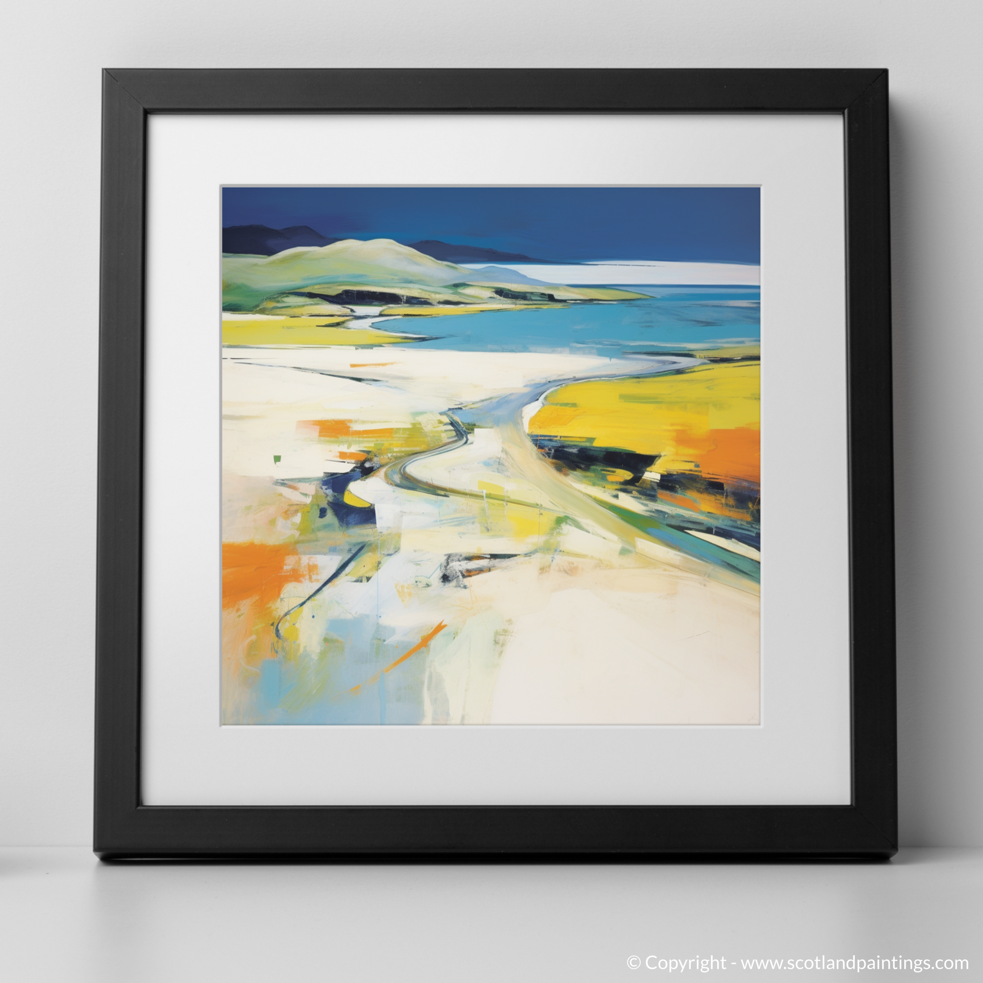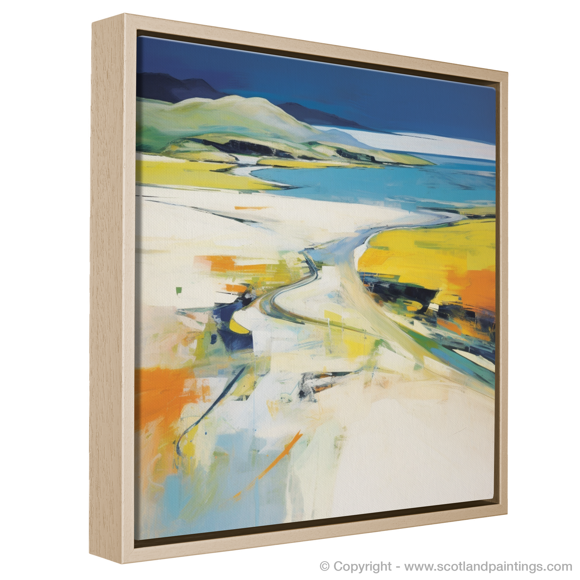 Vibrant yellows and cool blues dominate the palette, suggesting the warmth of sunlight on open sands and the gentle caress of ocean waters. Broad, sweeping brushstrokes convey the expansive sky, while dappled colours and bold lines juxtapose to evoke the rugged terrain and wild beaches synonymous with Scotland's natural grandeur.