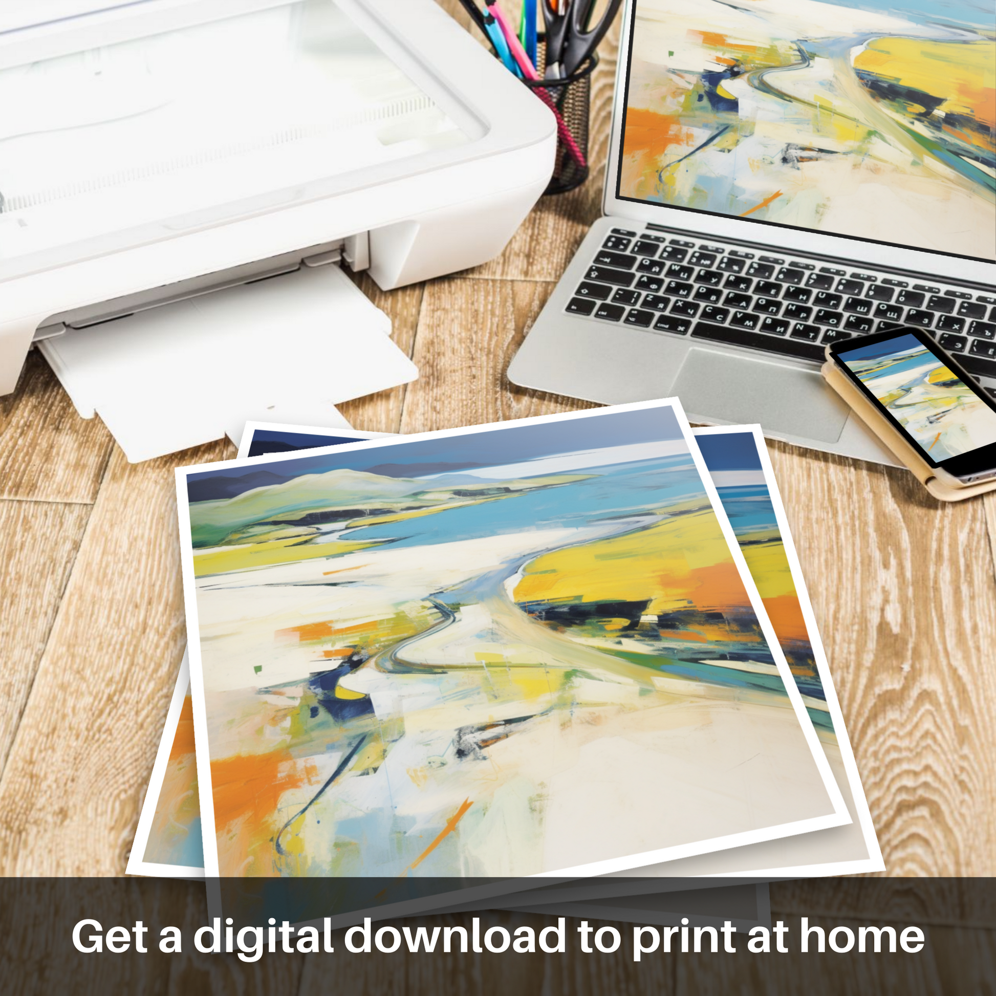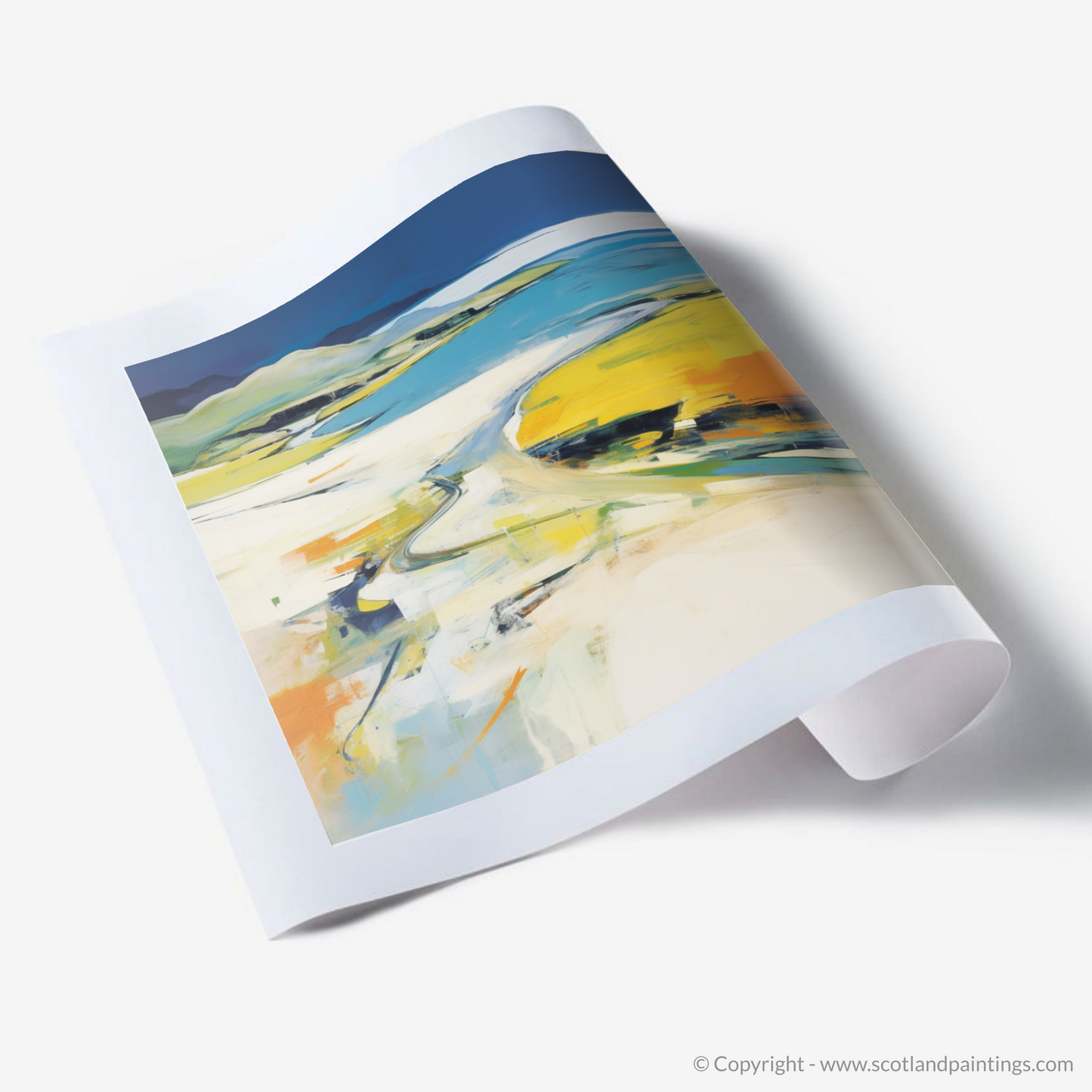 Capturing the ethereal beauty of the Scottish Highlands, this striking piece transports viewers to the enchanting shores of Mellon Udrigle Beach in Wester Ross. A masterful blend of vivid hues and nuanced textures, this abstract impressionist work invites the mind to wander along the sweeping curves of sandy paths as they meander towards the azure embrace of the sea.