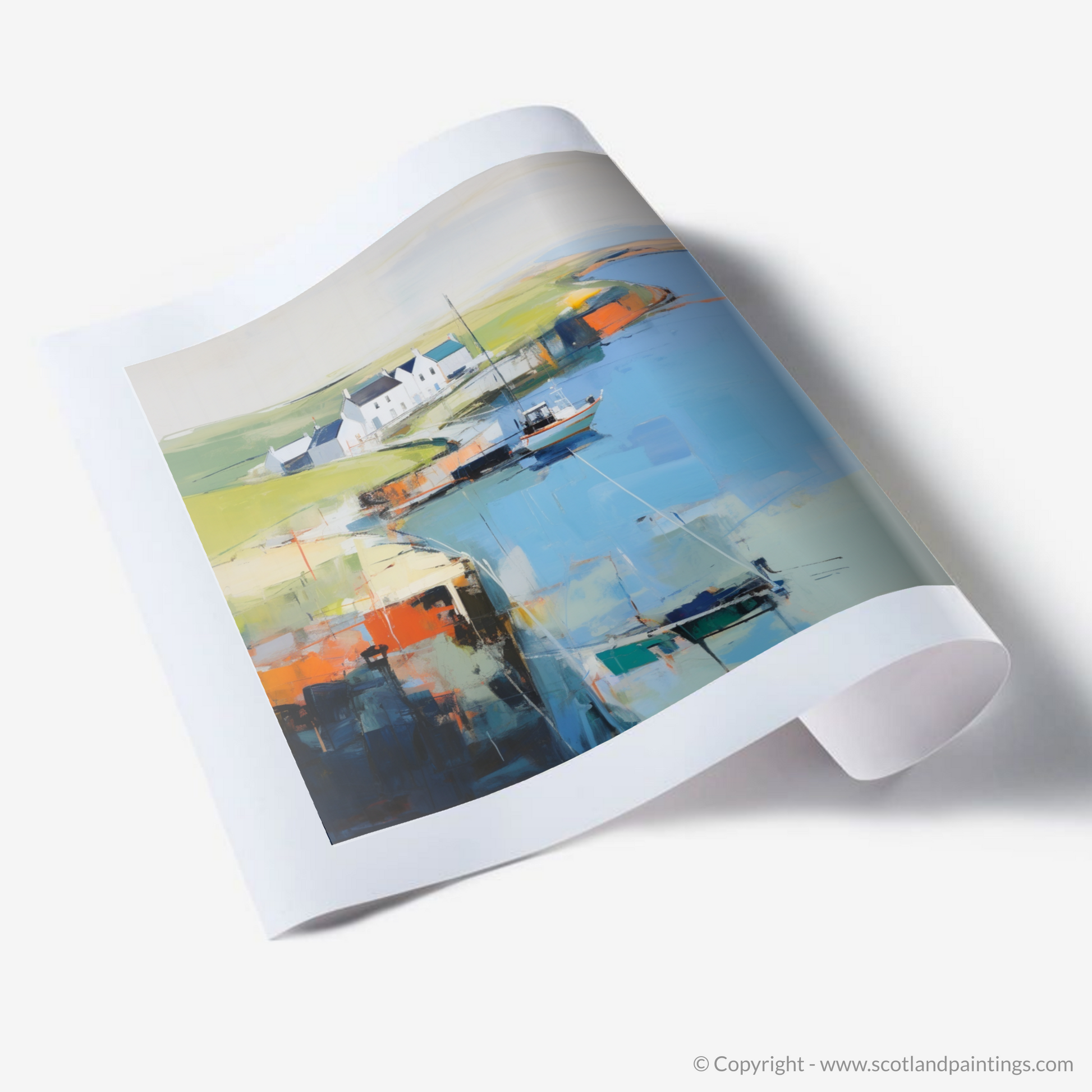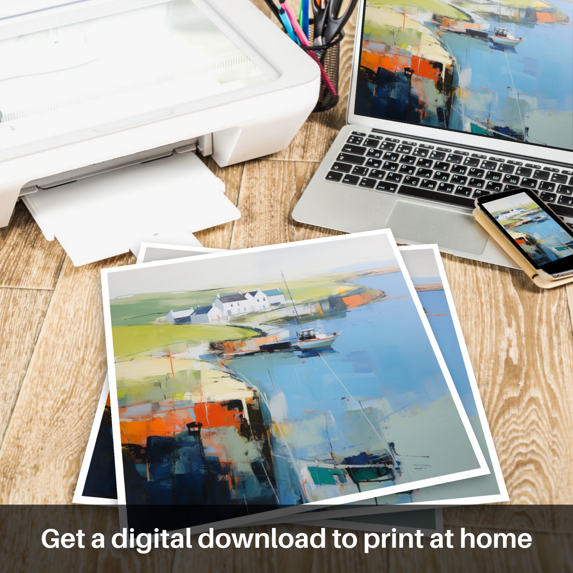 Immerse yourself in the ethereal beauty of Scotland's coastal charm with this captivating abstract impressionist rendition of Cove Harbour. Awash with a melange of soothing blues and vivid hues, this piece invites the observer into a serene, yet lively seascape that radiates with the unique spirit of Scottish harbours.